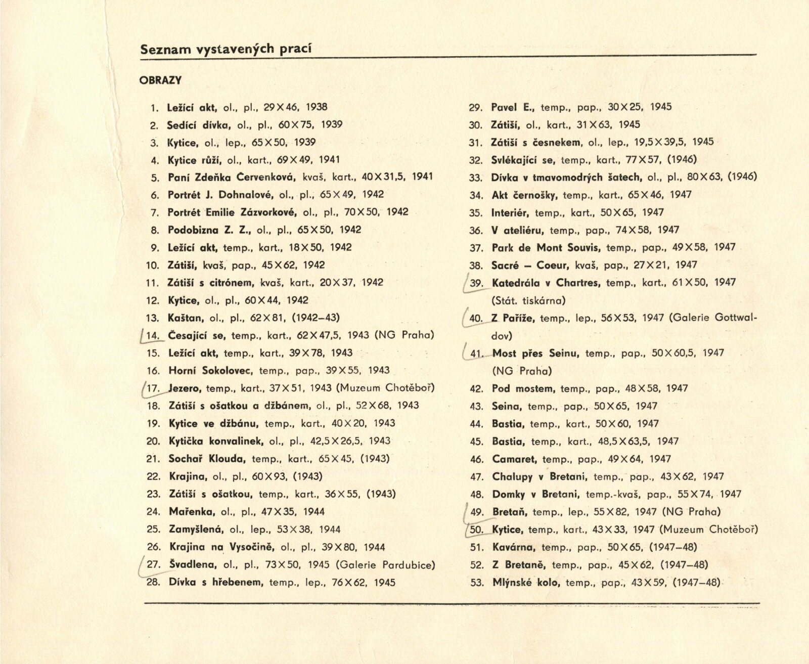 pozvánka, katalog (převzatý z výstavy Mánes v Praze), seznam děl s cenami, smlouvy o bezplatném dočasném užívání, provozní korespondence (reversy, pojištění, žádost o zapůjčení), žádost DU o převzetí výstavy (SČVU), recenze v tisku