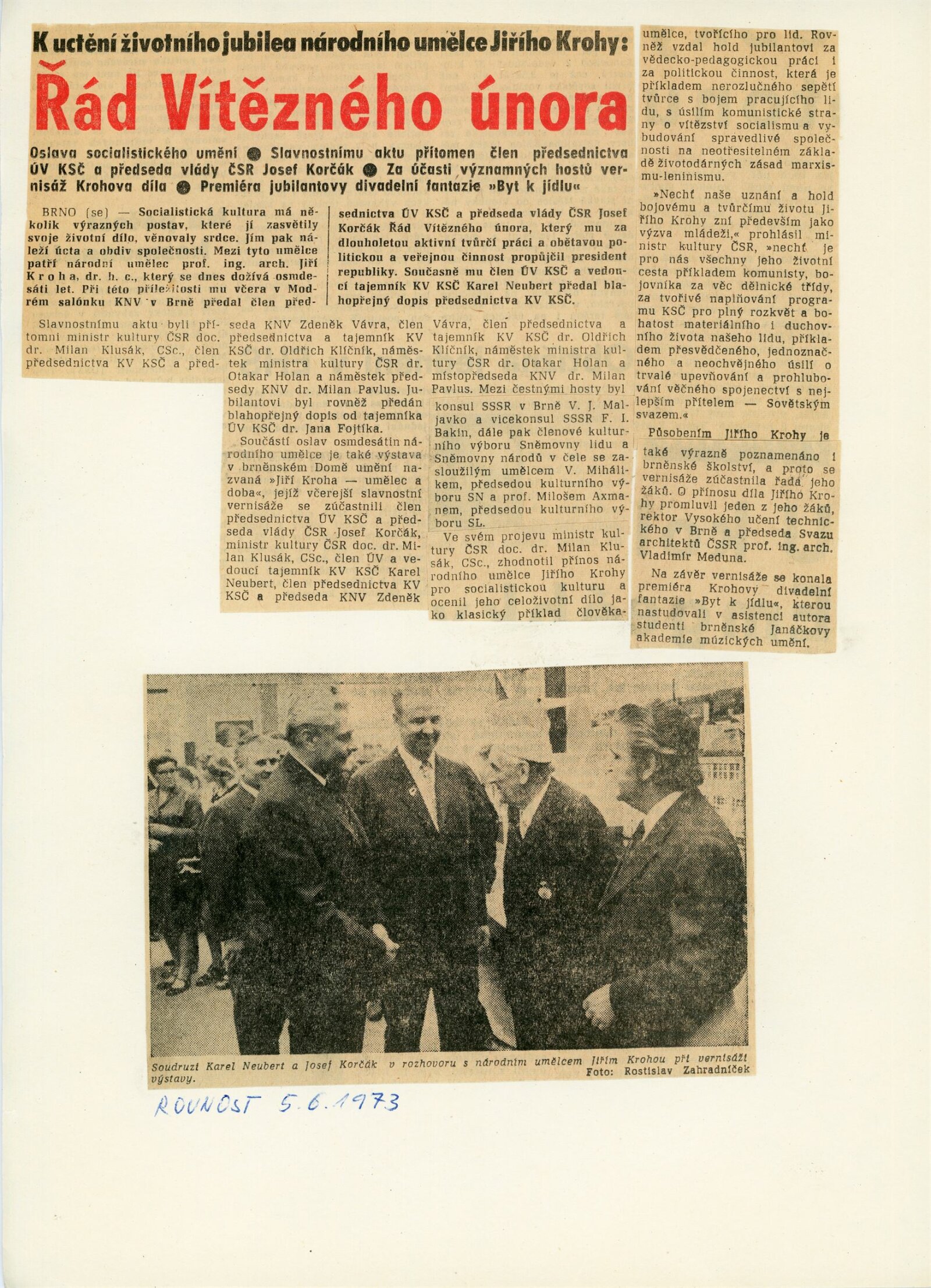 Jiří Kroha – umělec a doba: Dům umění, 4. 6. – 8. 7. 1973 / Pamětní tisk vydaný u příležitosti výstavy k osmdesátým narozeninám národního umělce Jiřího Krohy. Text: Aleš Dupal a Václav Roštlapil. – Brno: Krajské středisko státní památkové péče a ochrany přírody, 1973. – 23 s., obr., DU 593. – MMB
