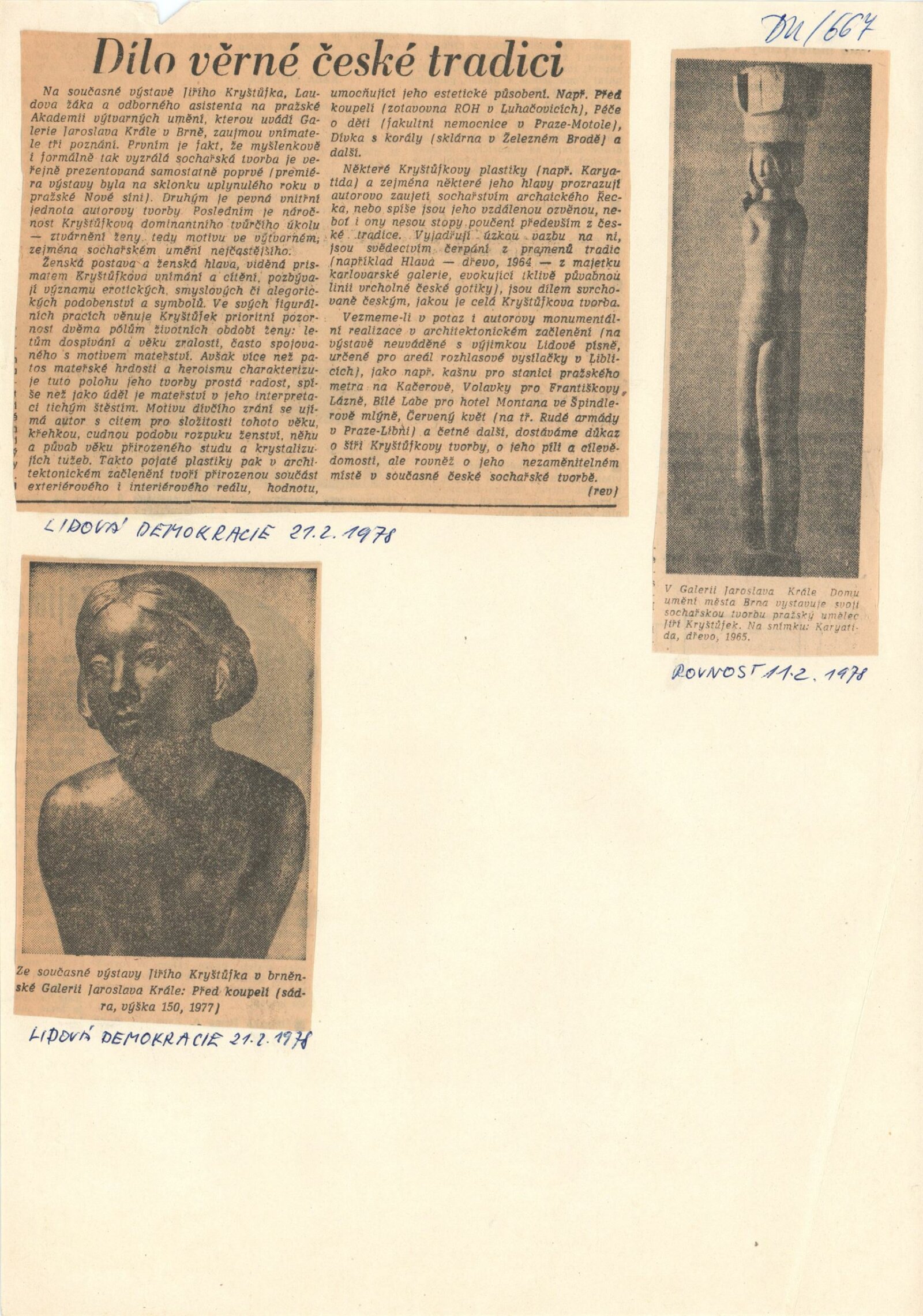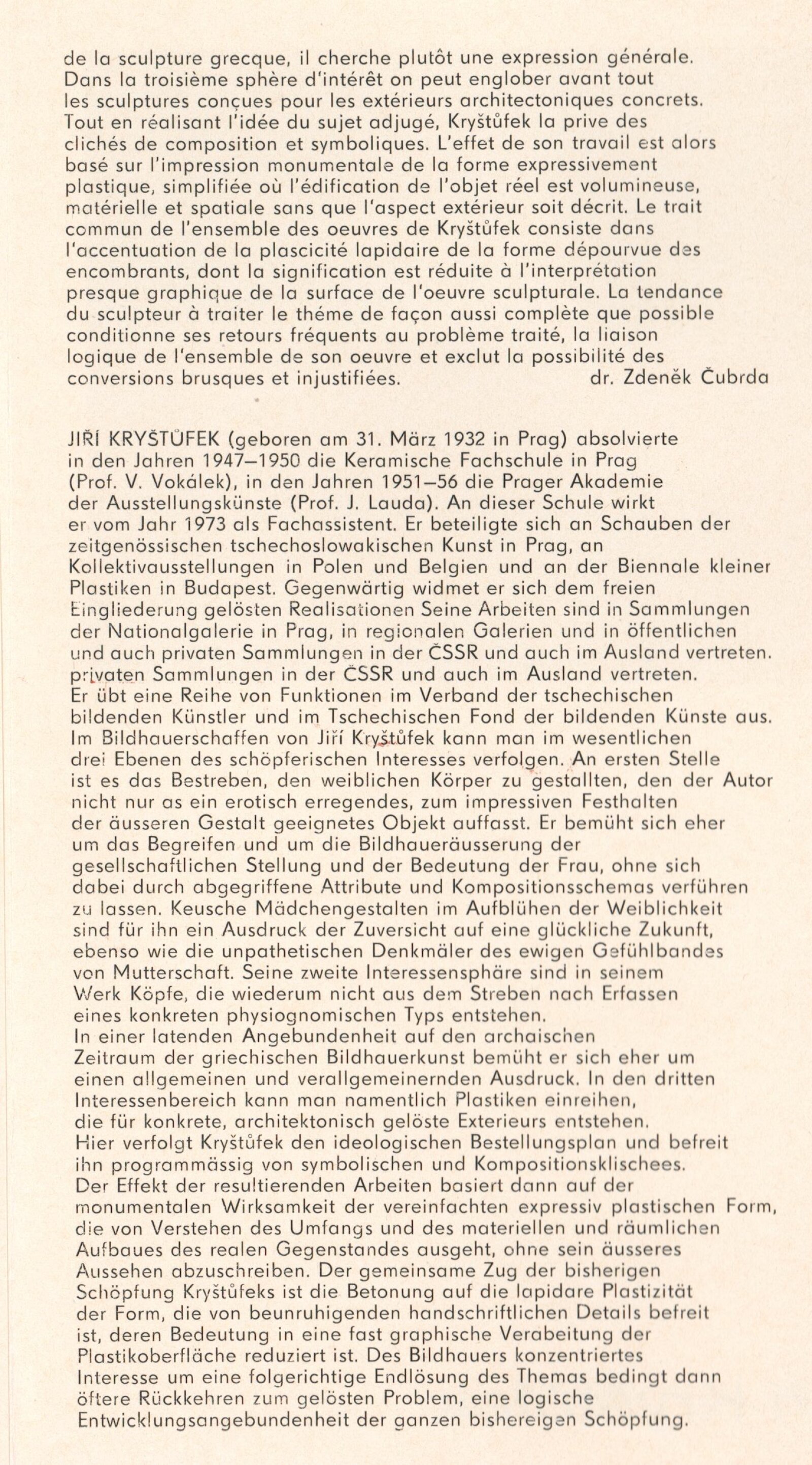 Jiří Kryštůfek. Sochy: Dům umění, 84. výstava v Galerii Jaroslava Krále, 17. 1. 1977 – 26. 2. 1978 / Text: Zdeněk Čubrda. – Brno : ČFVU, 1978. – 14 s. obr., portrét, životní data, výstavy, soutěže, realizace, zastoupení ve sbírkách, neobsahuje seznam vystavených prací, DU 667