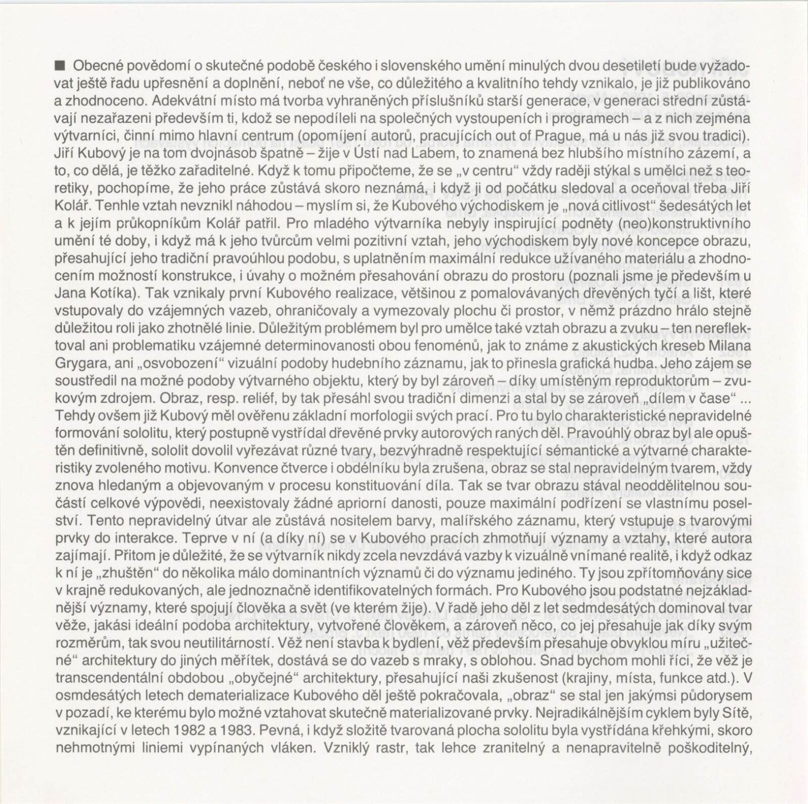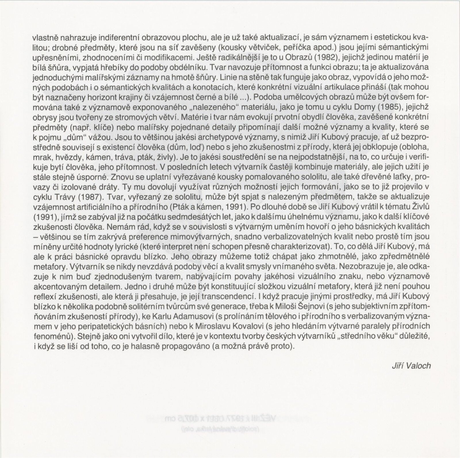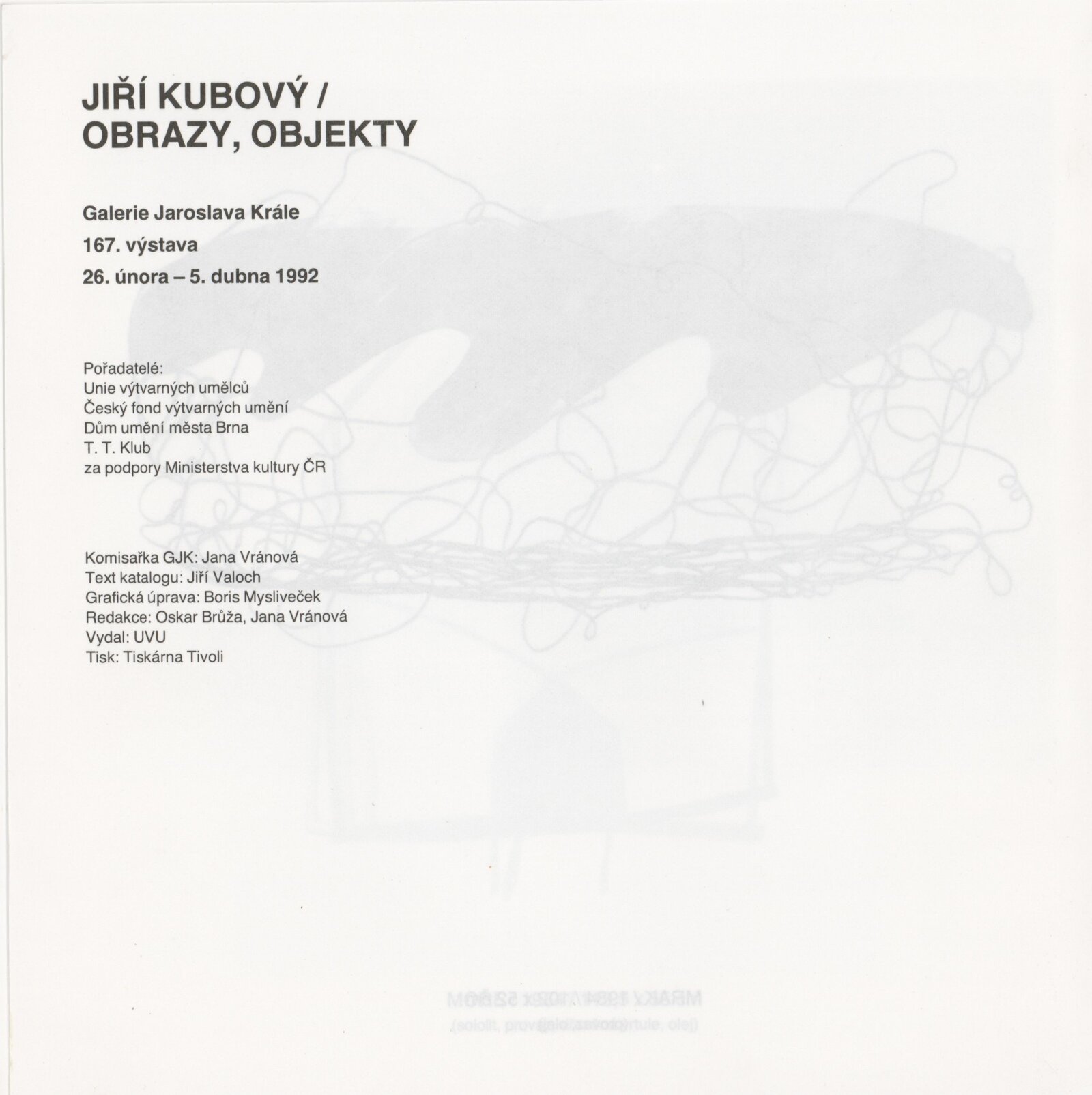 Jiří Kubový. Obrazy, objekty: Dům umění města Brna, 167. výstava v Galerii Jaroslava Krále, 26. 2. – 5. 4. 1992 / Text: Jiří Valoch. – Brno: ČFVU, 1992. – (16) s. obr., životní data, výstavy, bibliografie, DU 919. – MG