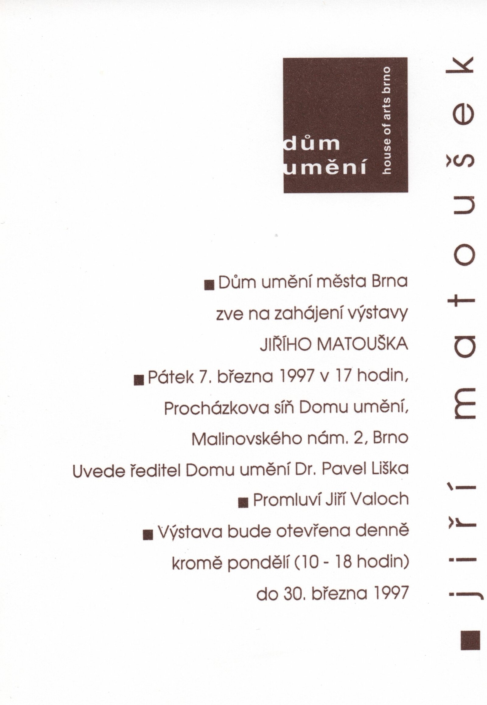 Jiří Matoušek: Dům umění města Brna, Procházkova síň, 7. 3. – 30. 3. 1997 / Text: Jiří Valoch. – DU 1048