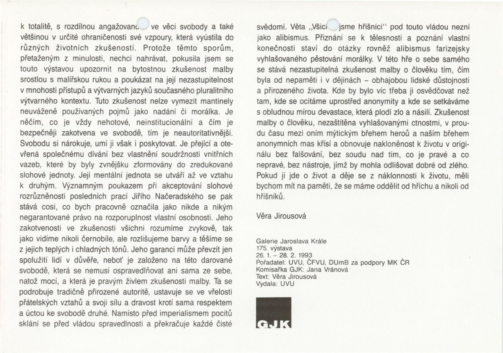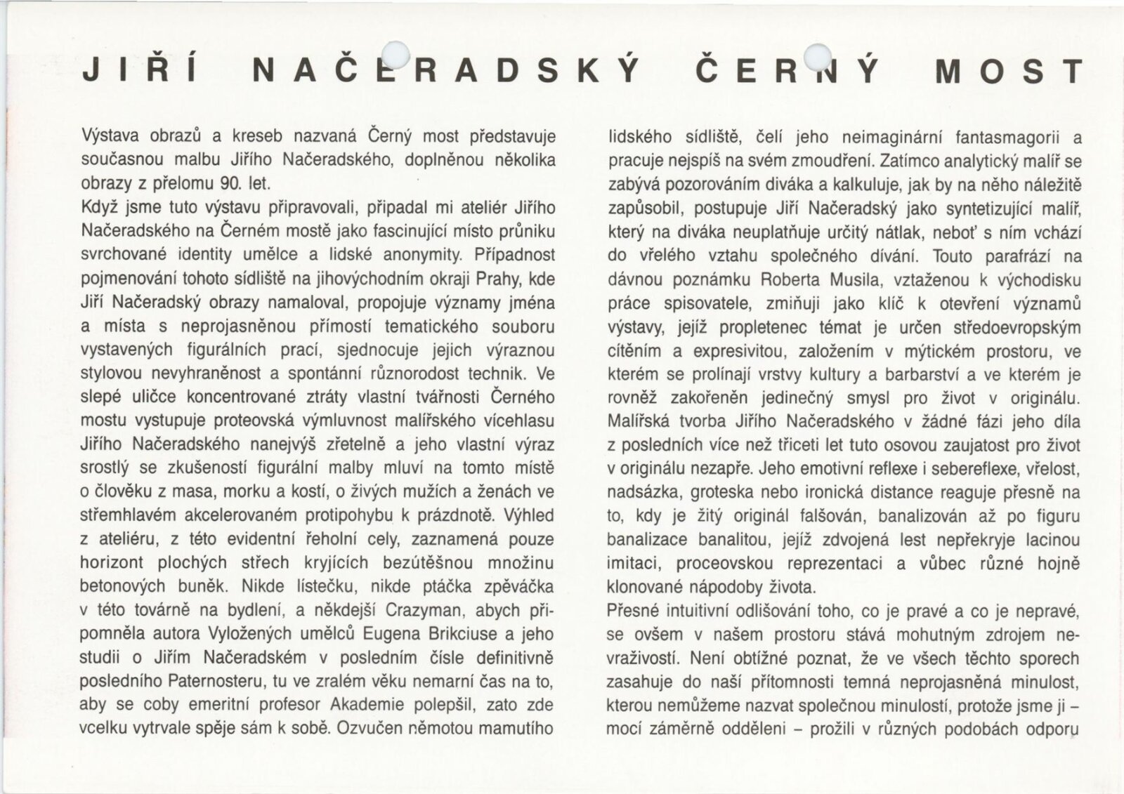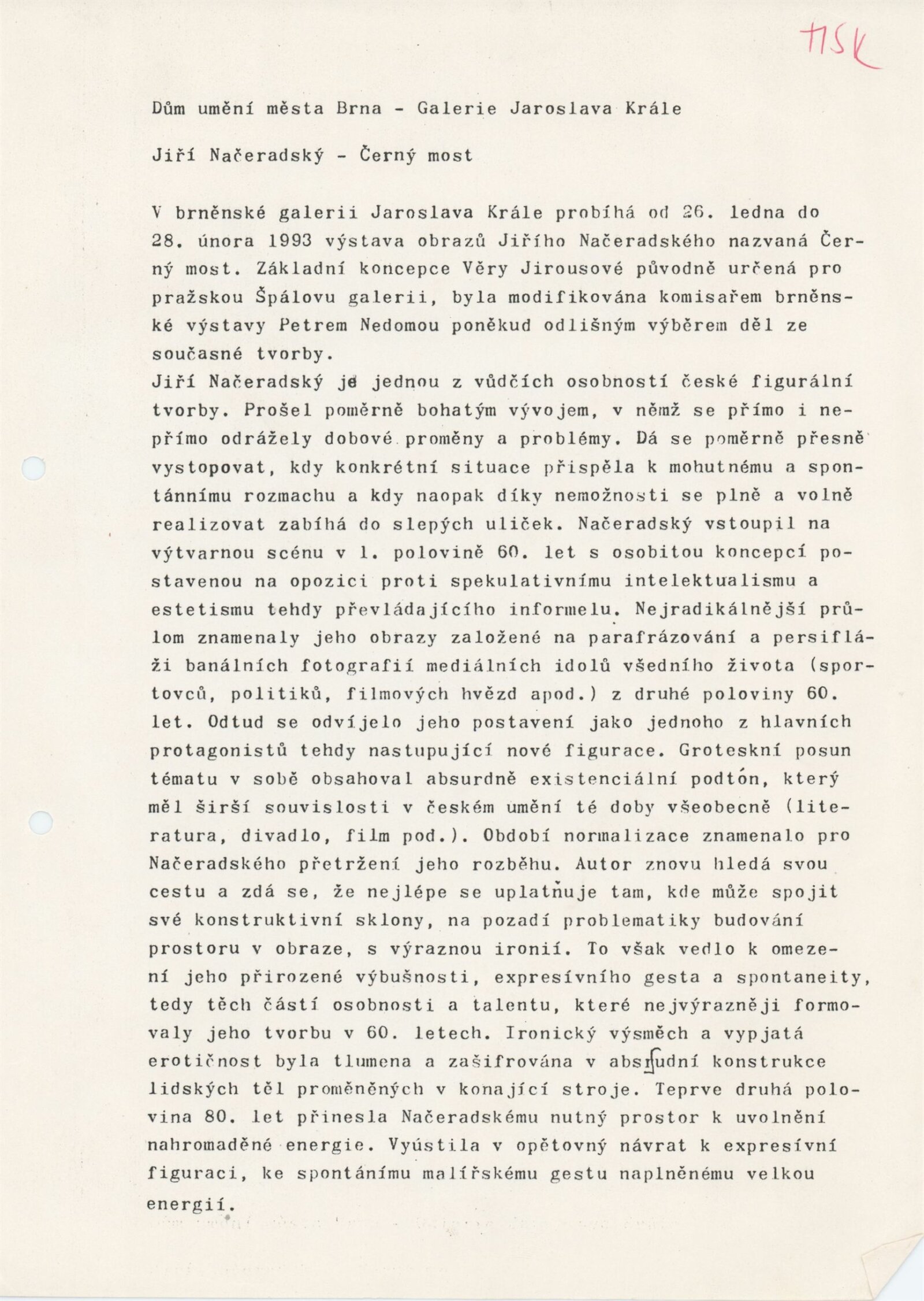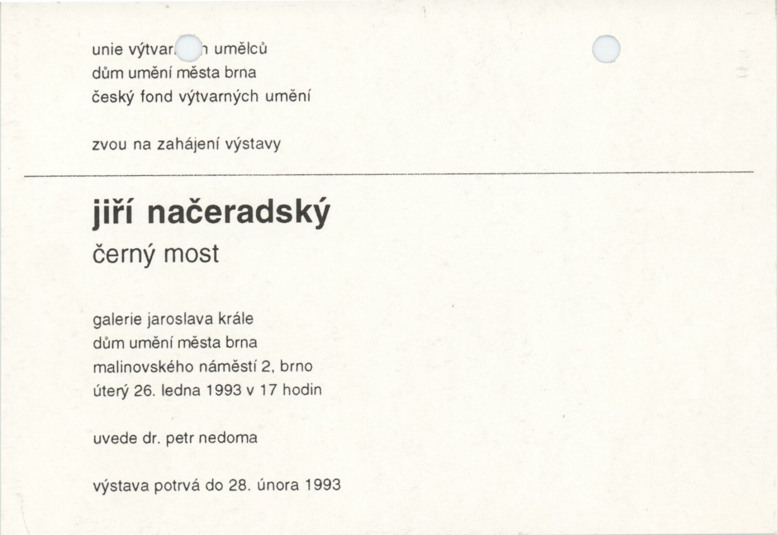 Jiří Načeradský. Černý most: Galerie Jaroslava Krále, 175. výstava 26. 1. – 28. 2. 1993 / Text Věra Jirousová. - Brno: UVU, - [4] s., obr. Neobsahuje seznam vystavených prací DU 940