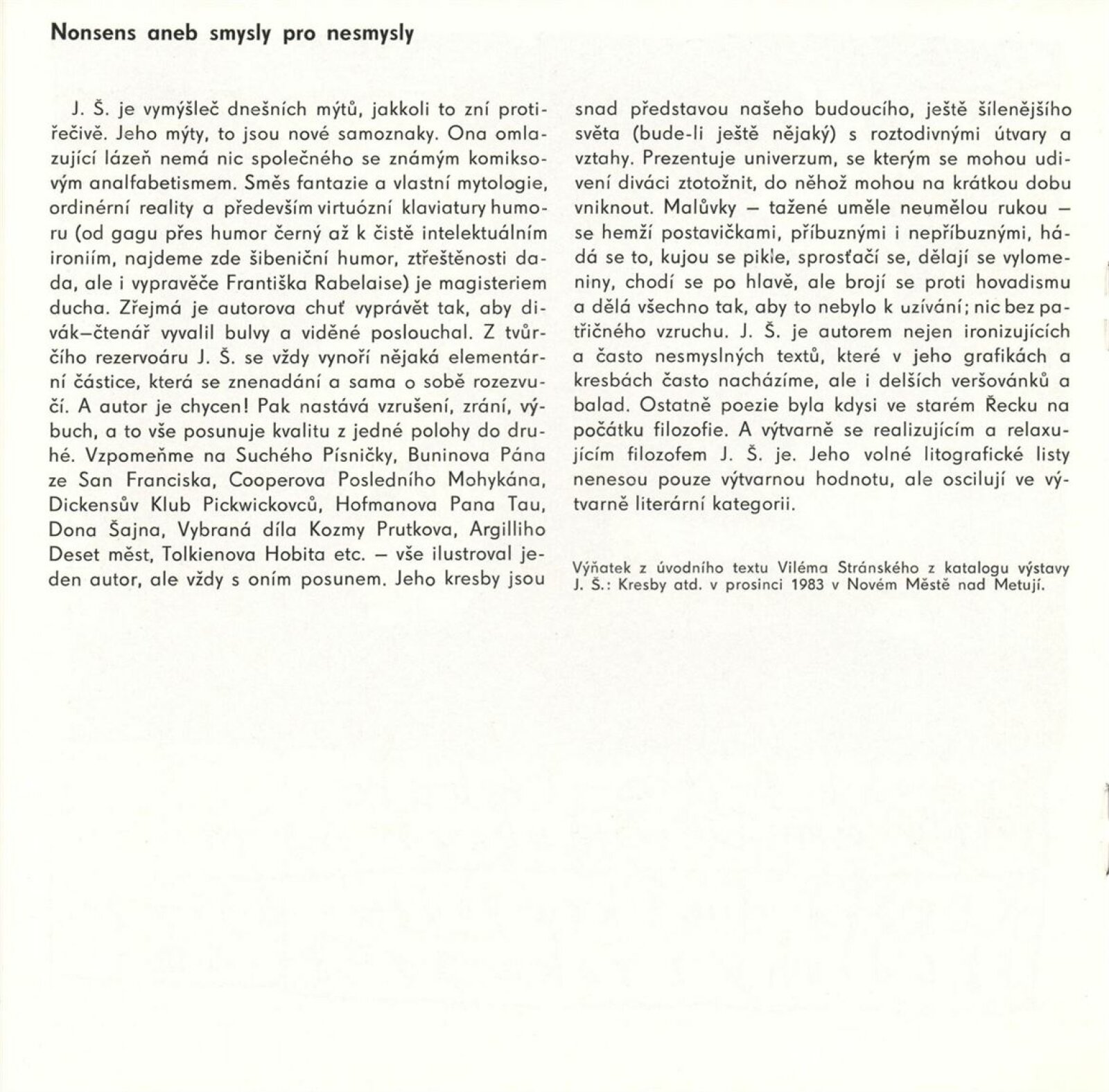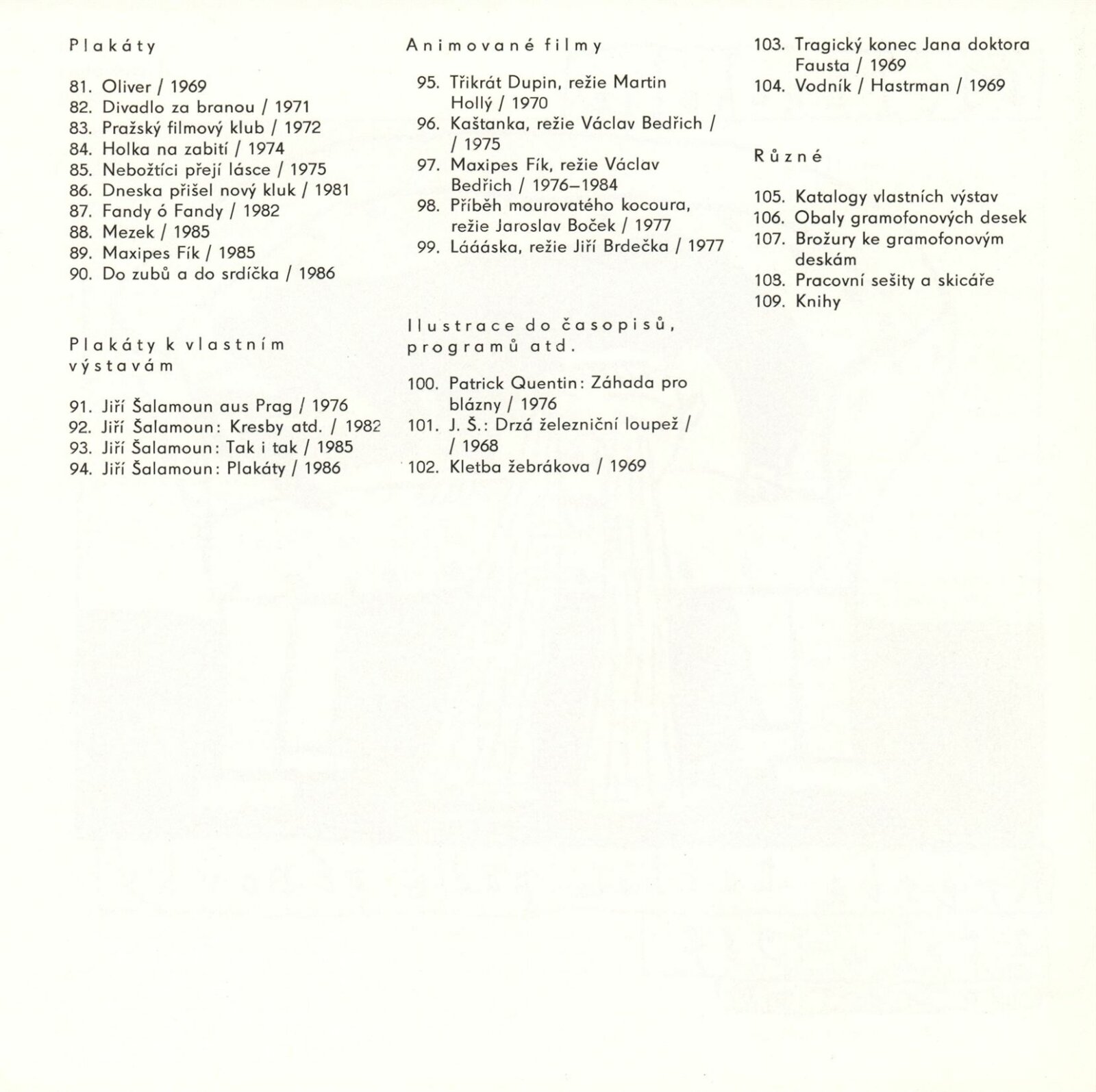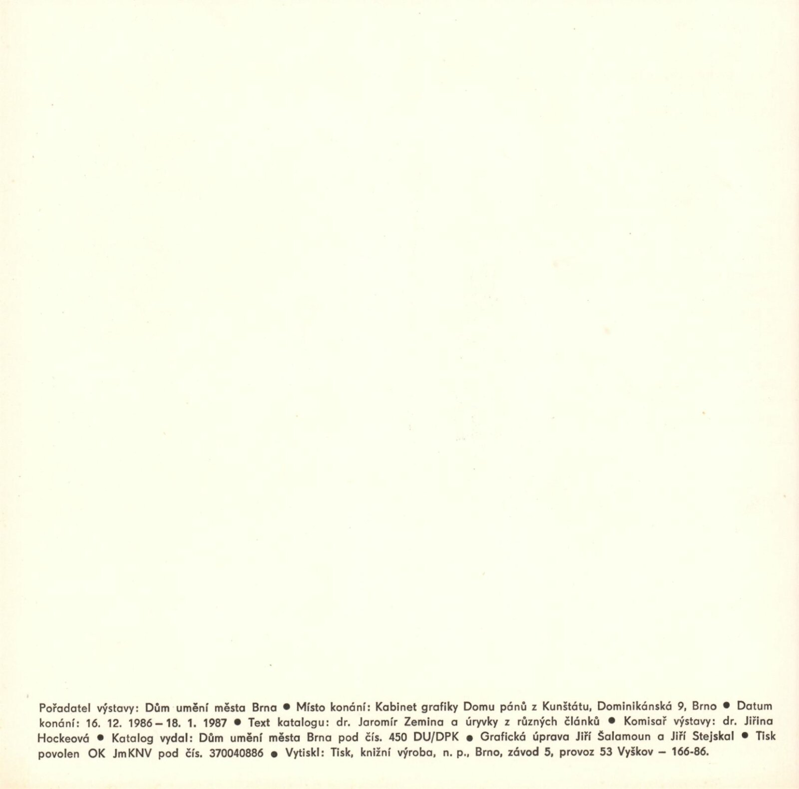 Jiří Šalamoun. Kresby atd.: Dům umění / Dům pánů z Kunštátu, Kabinet grafiky, 16. 12. 1986 – 18. 1. 1978 / Text: Jaromír Zemina. – Brno: DUmB, 1986. – [21] s., obr., životní data, DPK 878. – MZK; MG; MMB