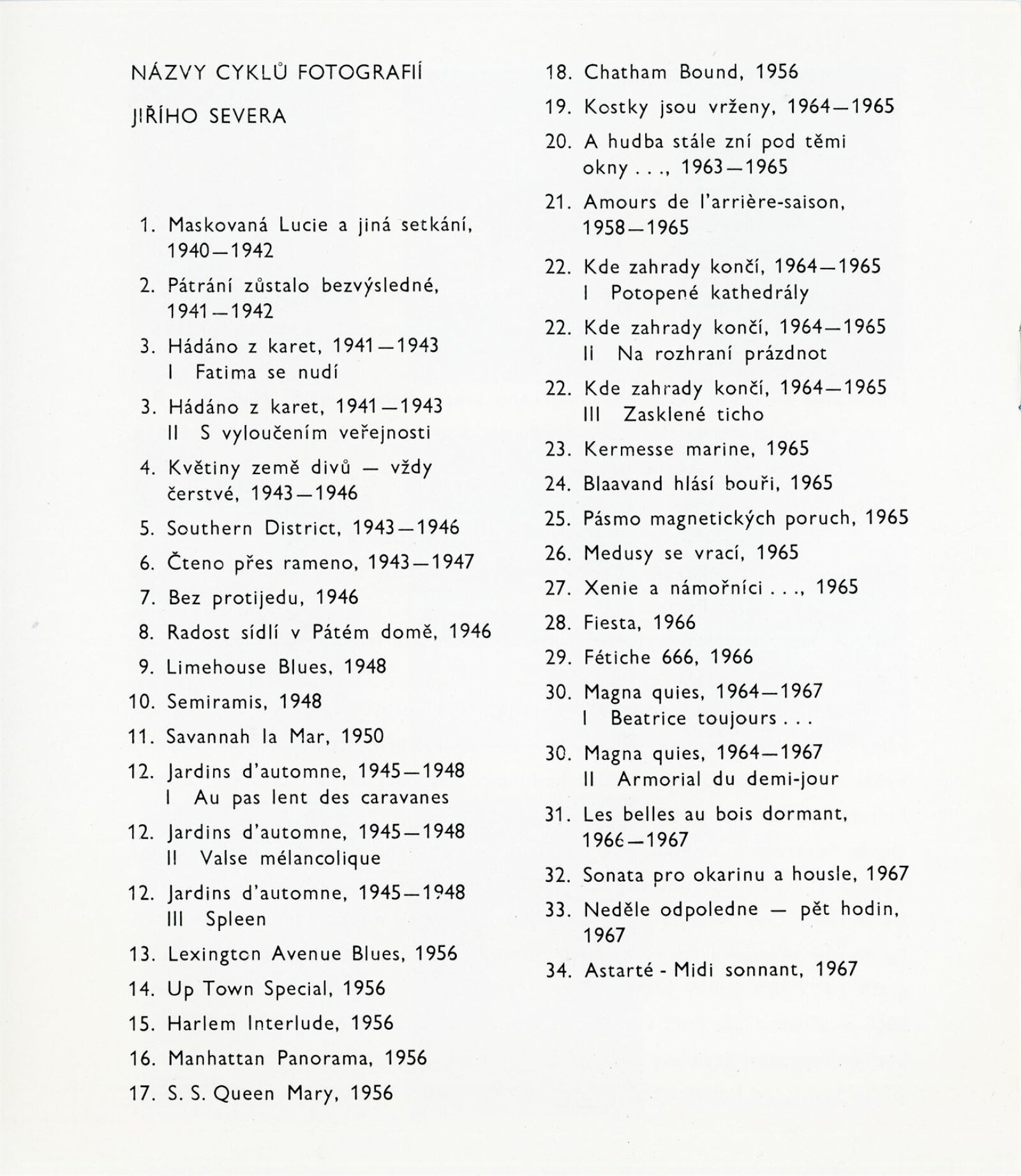 Jiří Sever. Fotografie: Dům umění města Brna / Dům pánů z Kunštátu, 99. výstava Kabinetu fotografie Jaromíra Funka, 23. 5. – 7. 7. 1969 / Text: Anna Fárová. – Brno: DUmB, 1969. – 10 s., obr., životní data, DPK 414. – MZK