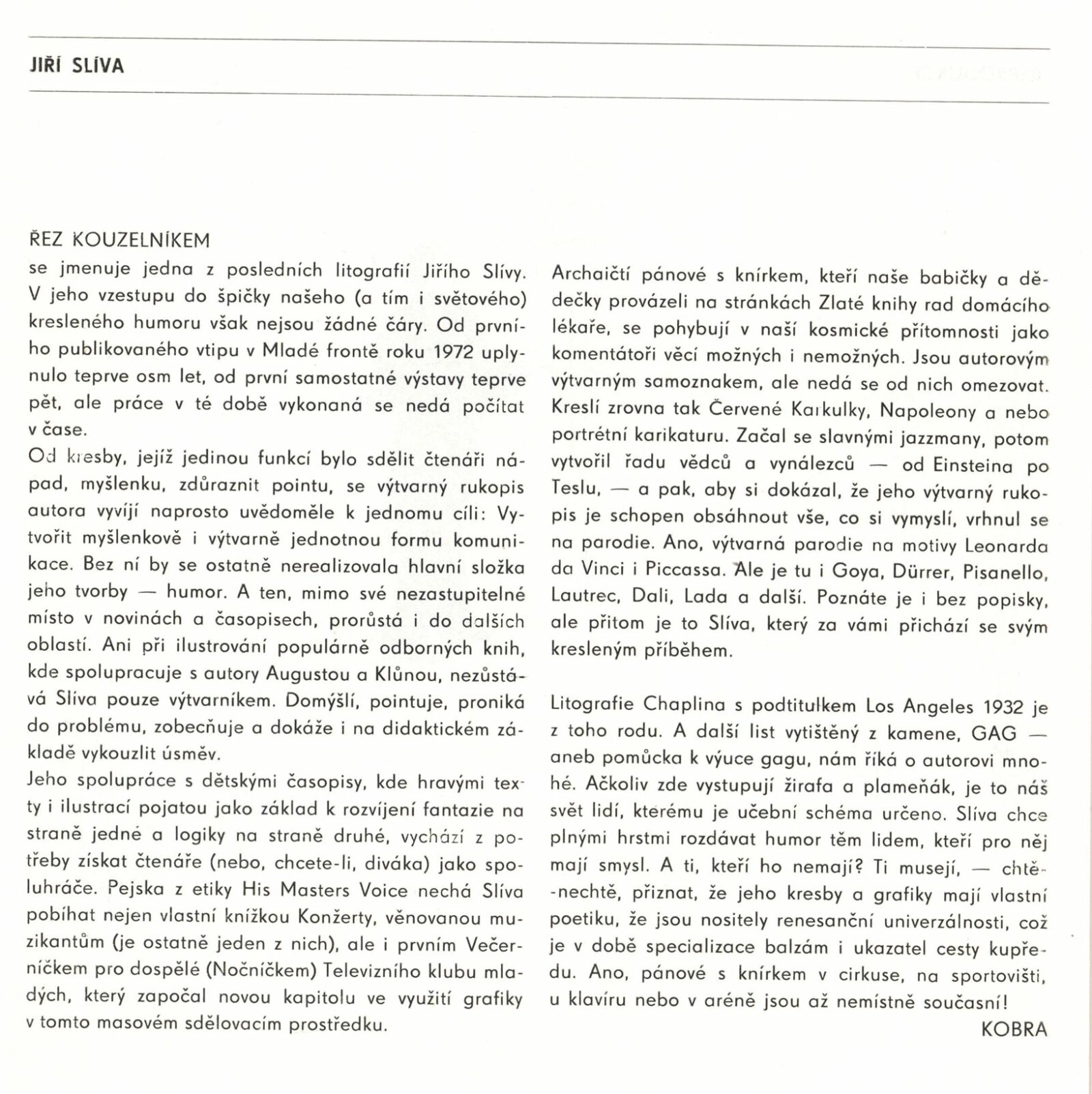 Jiří Slíva. Kreslený humor: Dům umění / Dům pánů z Kunštátu, 190. výstava Kabinetu grafiky, 12. 12. 1980 – 11. 1. 1981 / Text: Josef Kobra Kučera. – Brno: DUmB, 1980. – 12 s., obr., životní data, výstavy, knižní publikace, ilustrace, DPK 747. – MZK; MG; MMB