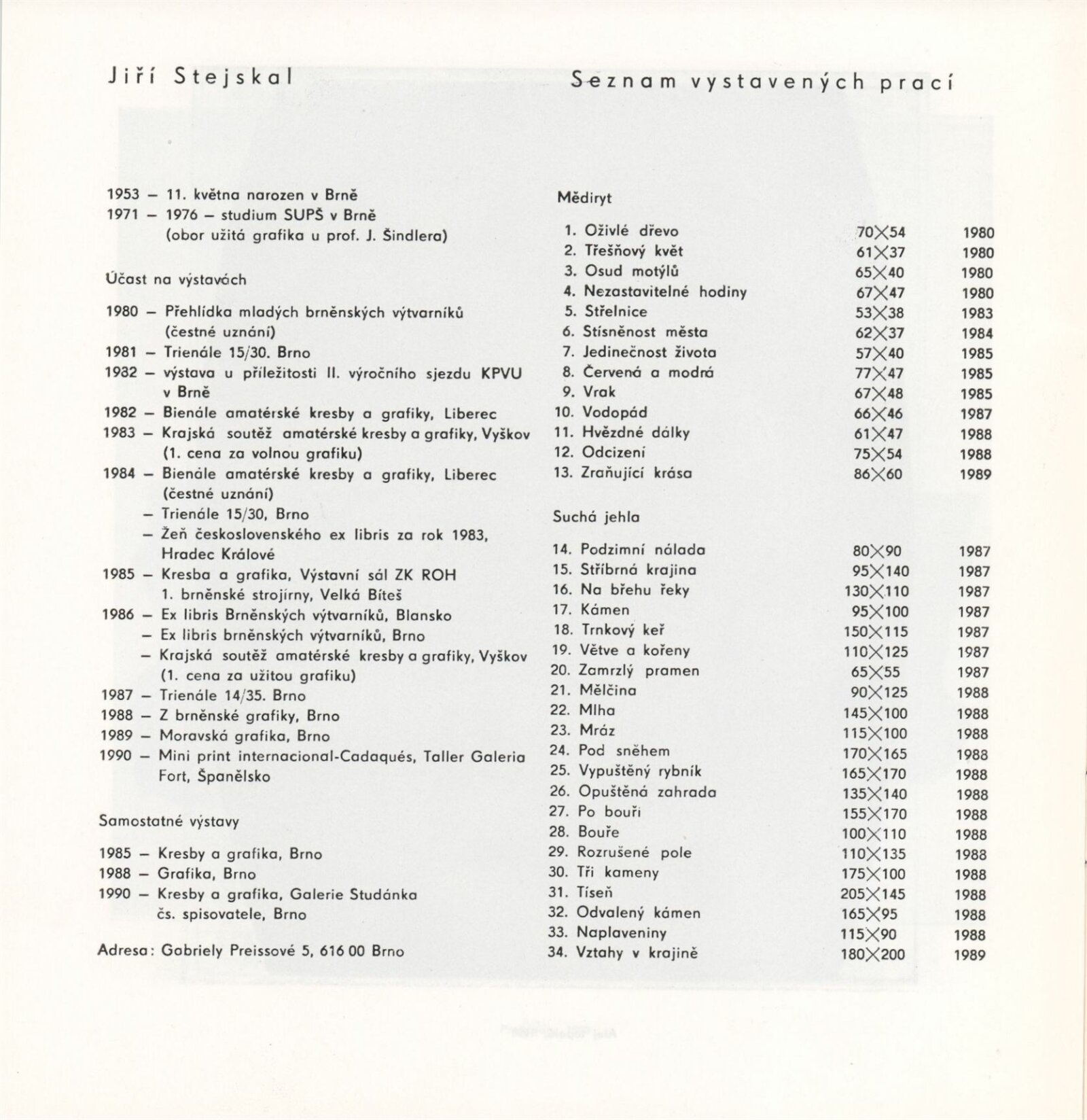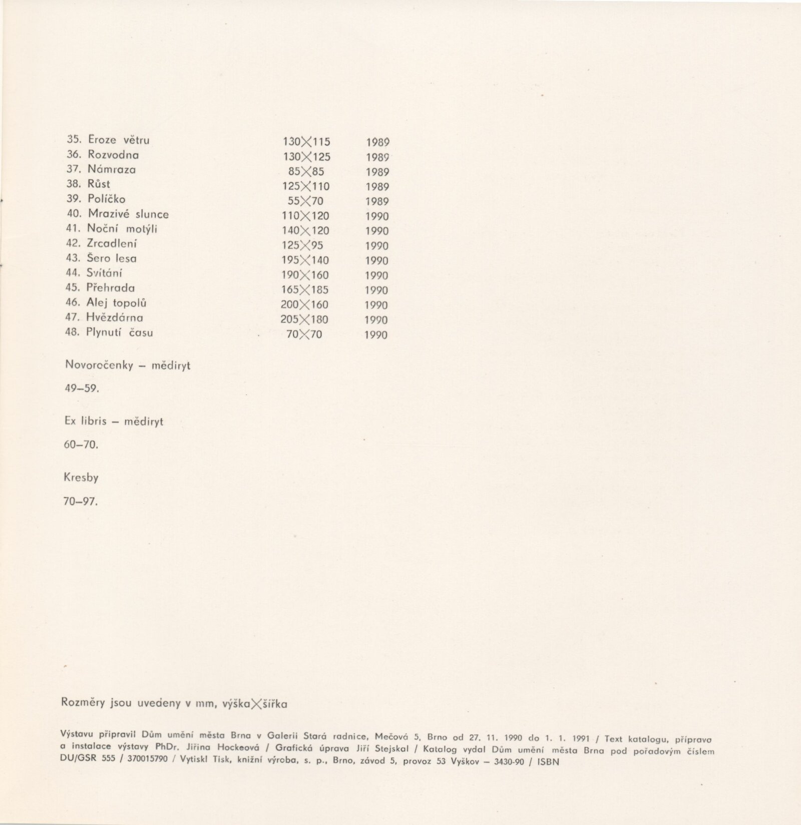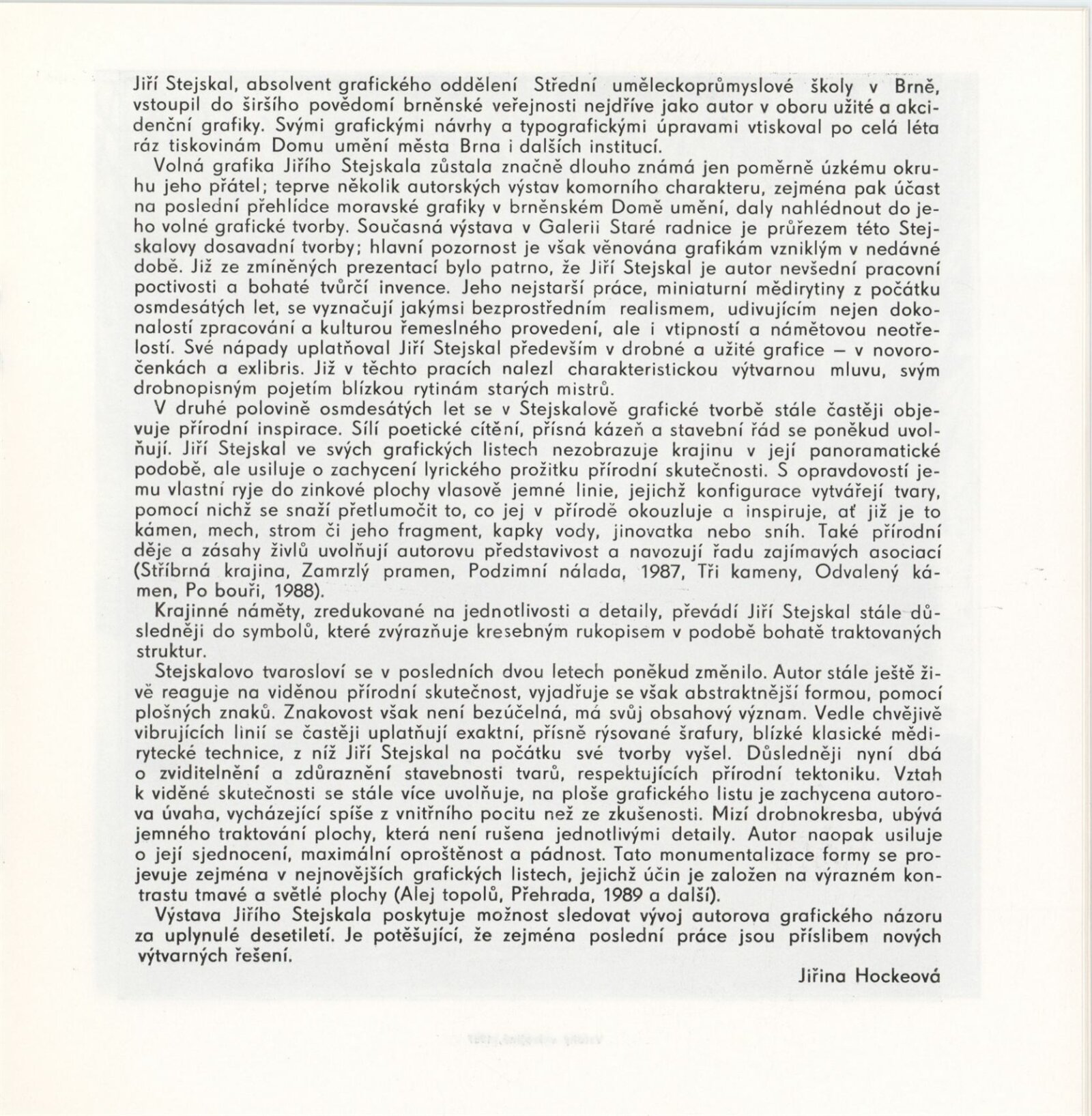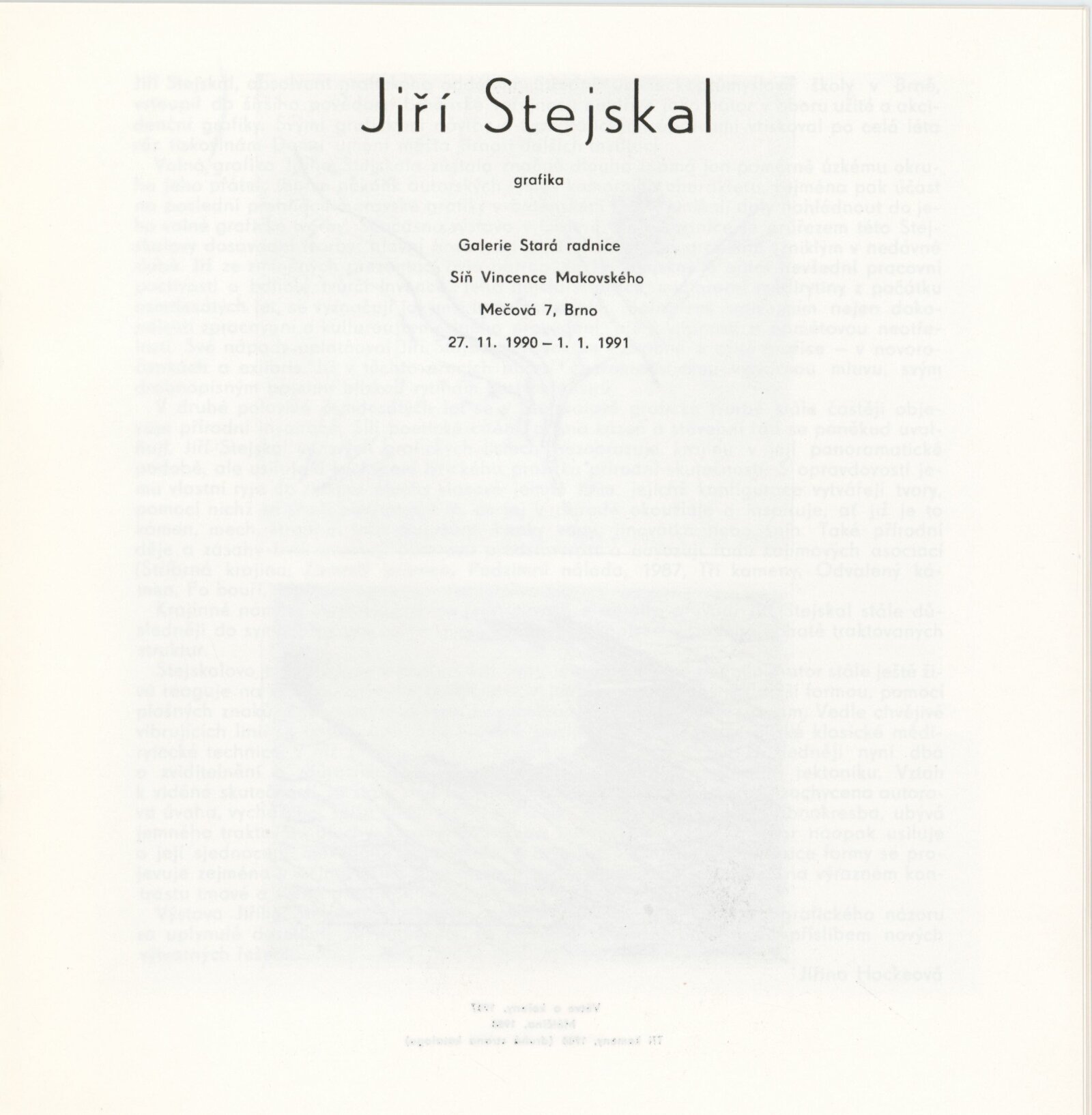 Jiří Stejskal. Grafika: Galerie Stará radnice, Síň Vincence Makovského, přízemí, 27. 11. 1990 – 1. 1. 1991 / Text: Jiřina Hockeová. – Brno: DUmB, 1990. – [13] s., obr., GSR 84. – MZK; MG