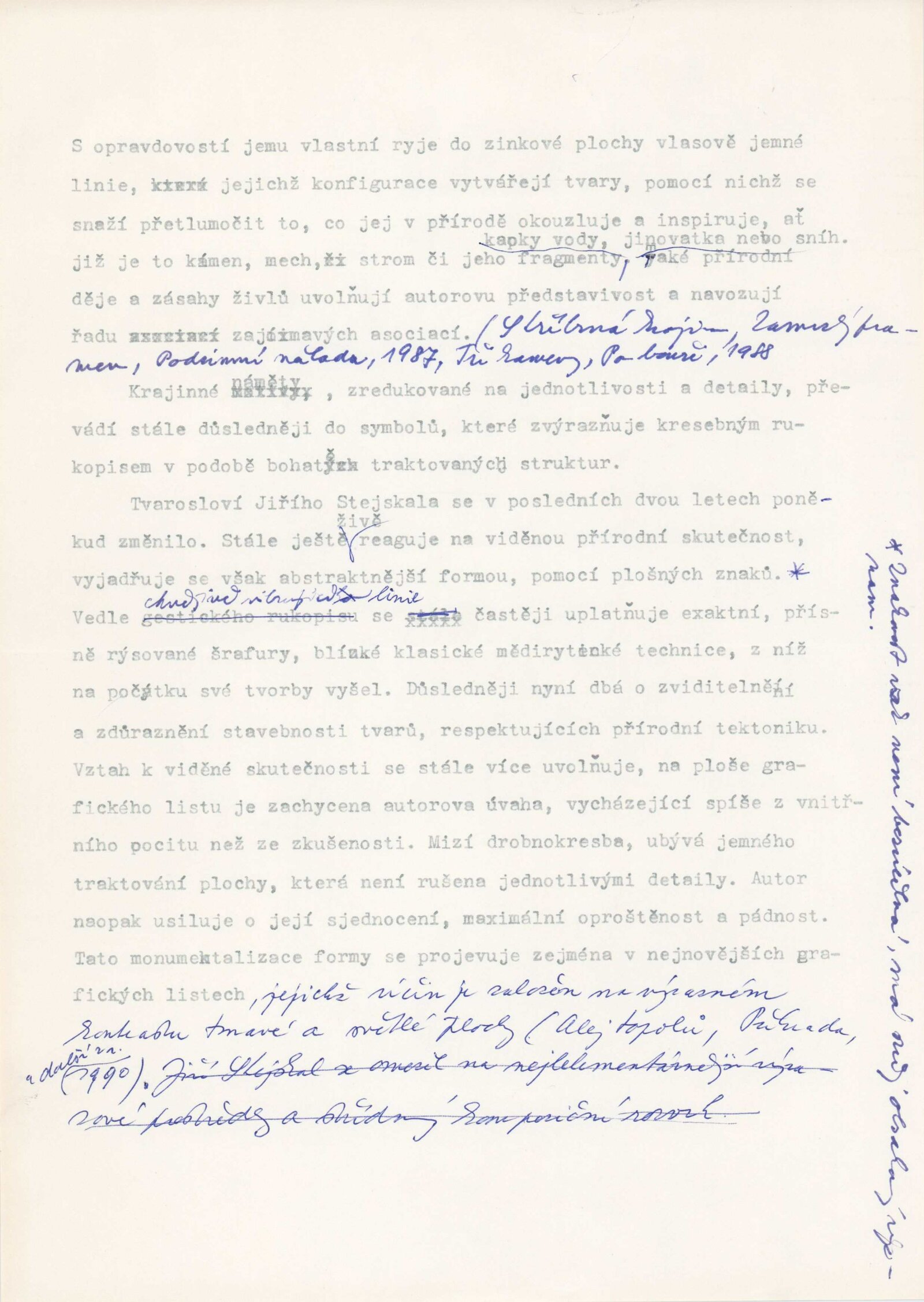 pozvánka, katalog, strojopis, text katalogu, přípravné materiály ke katalogu, reprodukce děl, provozní korespondence, žádost o povolení tisku katalogu, žádost o výstavní termín v GSR, recenze v tisku, katalog výstavy J. Stejskala v Malé galerii J. Trýba LK UJEP v Brně (1986)