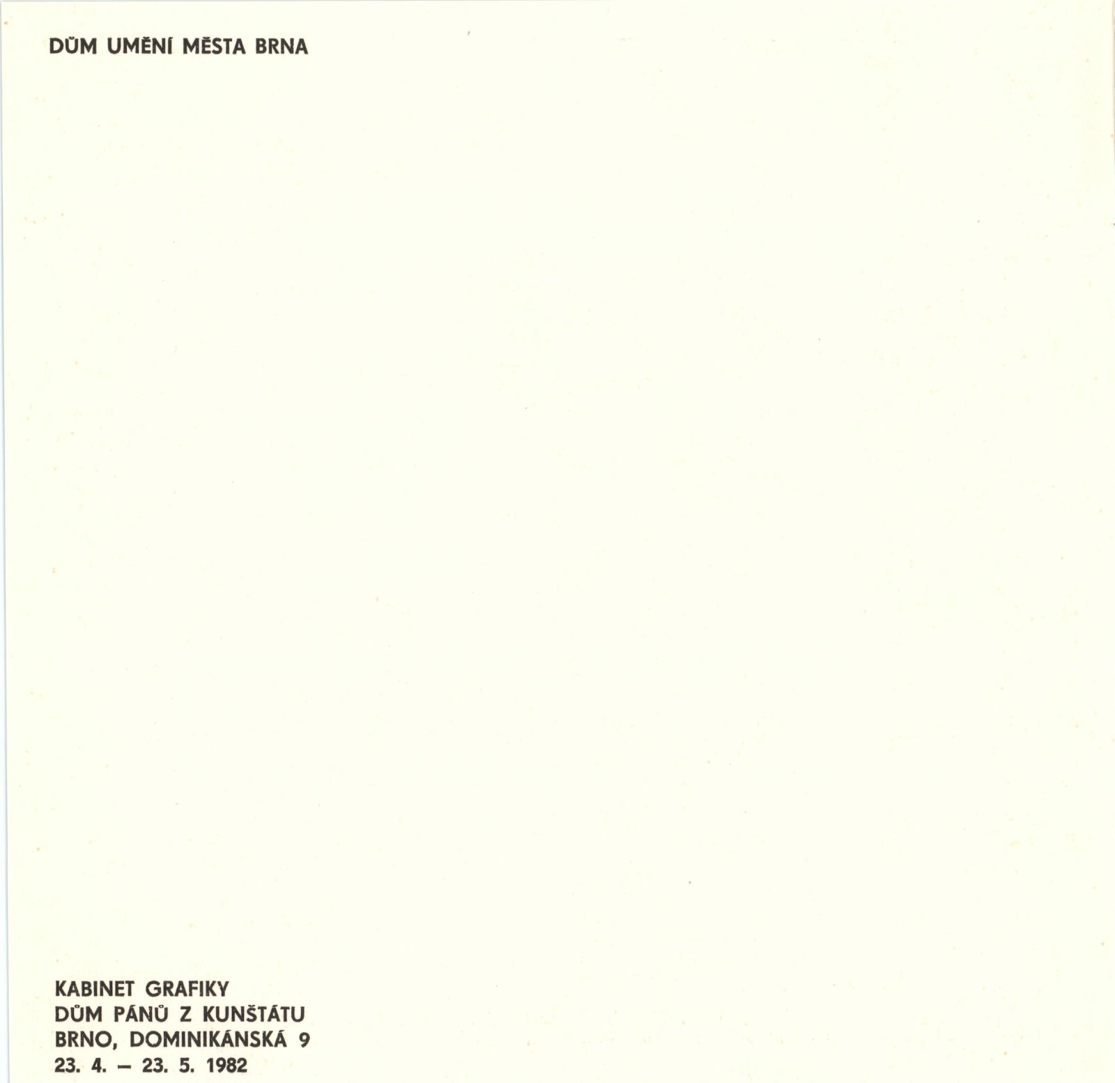 Jiří Vláčil. Grafika: Dům umění / Dům pánů z Kunštátu, Kabinet grafiky, 23. 4. – 23. 5. 1982 / Text: Nina Dvořáková. – Brno: DUmB, 1982. – 13 s., obr., životní data, výstavy, DPK 777. – MZK; MG; MMB