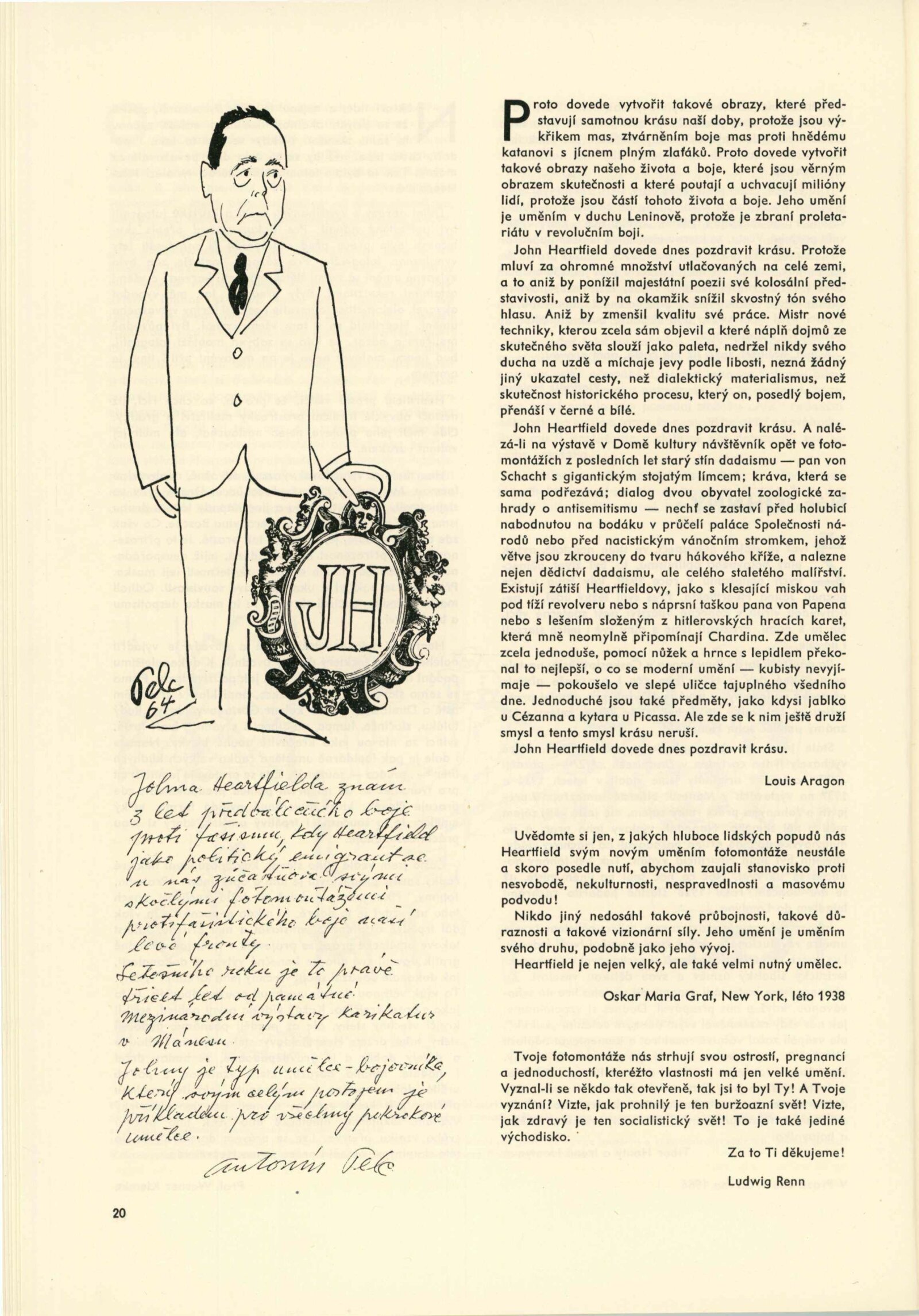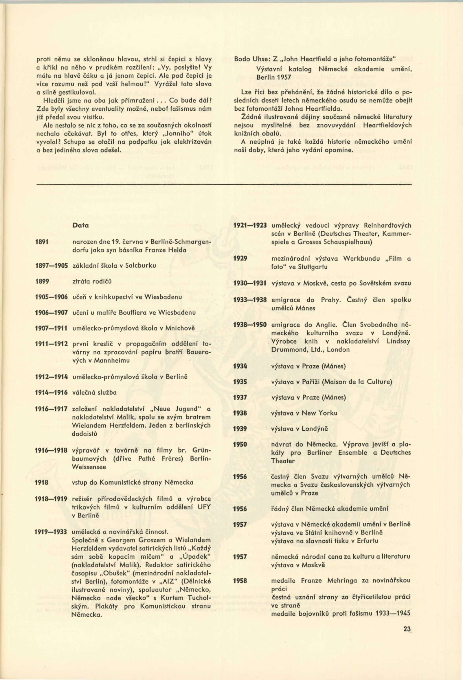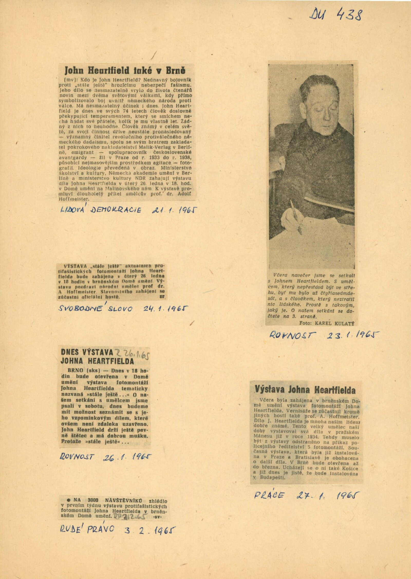 John Heartfield. Stále ještě... Fotomontáže: Dům umění, 26. 1. – 7. 3. 1965 / Převzatý katalog. John Heartfield. Stále ještě ... Fotomontáže. V upomínku na velkou mezinárodní výstavu karikatur v Mánesu v roce 1934, Praha 1964 / Texty: Adolf Hoffmeister, Wieland Herzfelde, Lubomír Linhart, Vladimír Hnízdo, Werner Klemke a dobové ohlasy. – Praha: ministerstvo školství a kultury ČSSR, 1965. – 31 s., 32 s. obr. příl., portrét, životopis, DU 438. – MZK; MG