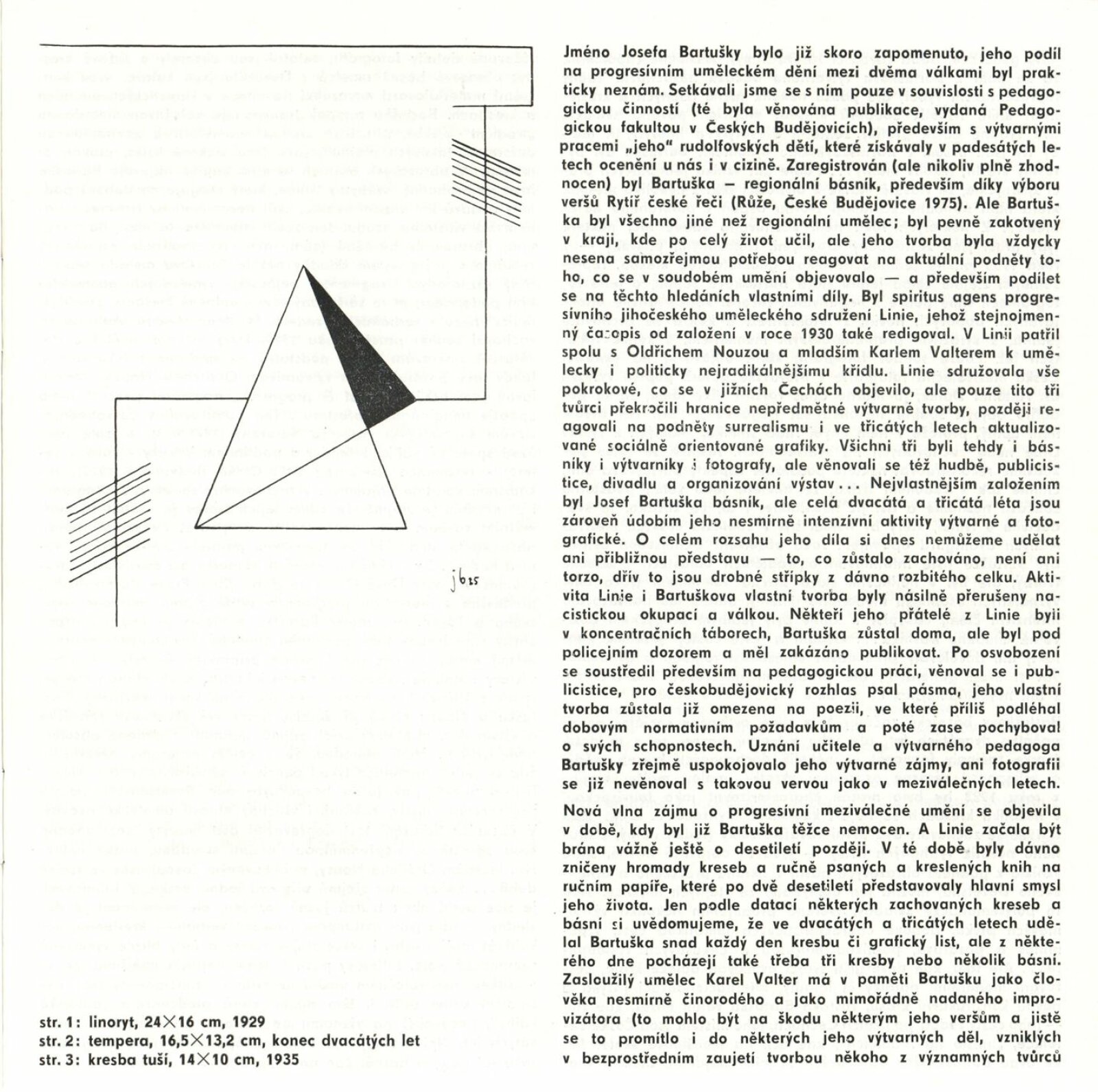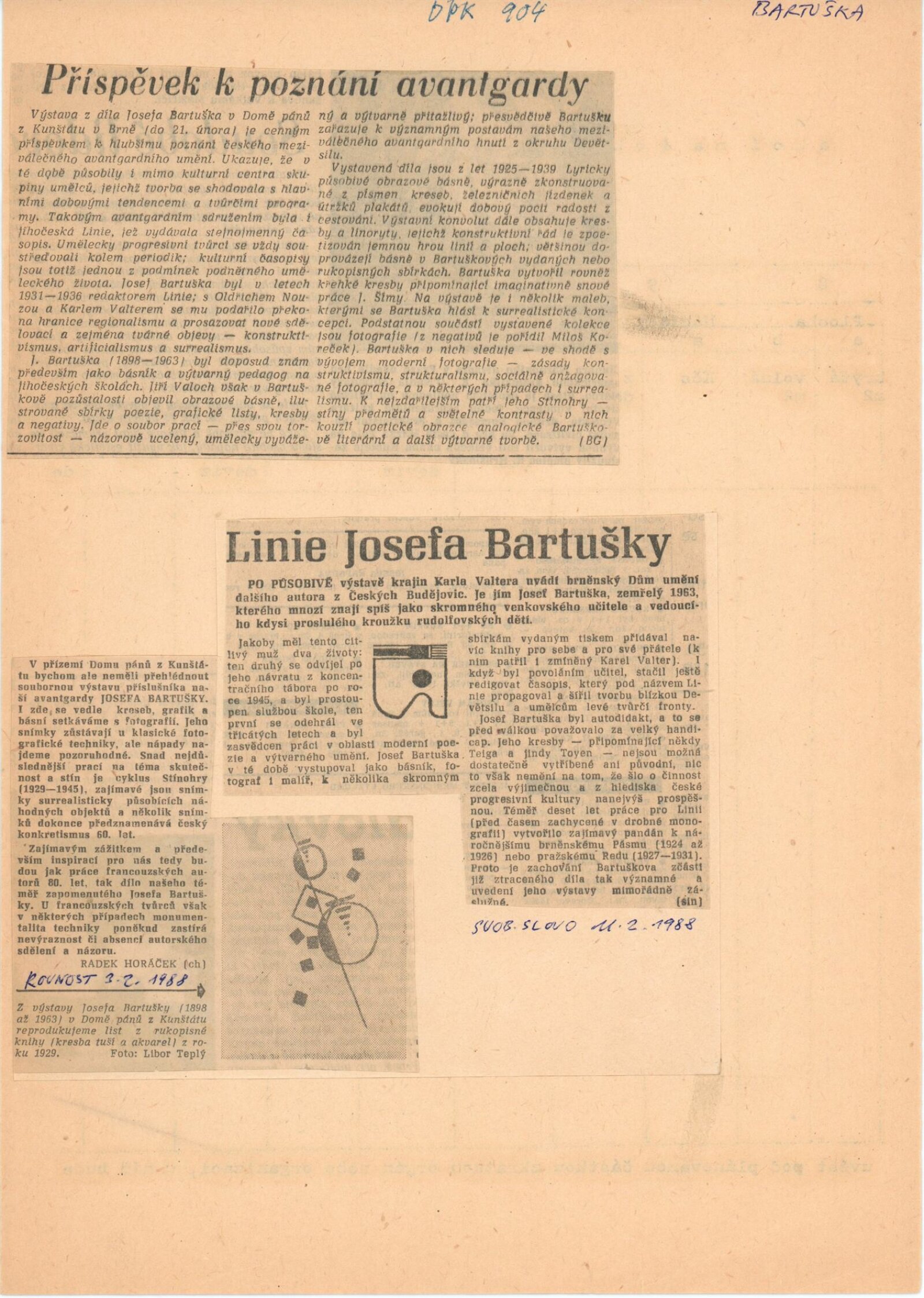 Josef Bartuška: Dům umění / Dům pánů z Kunštátu, Kabinet grafiky, 14. 1. – 21. 2. 1988 / Text: Jiří Valoch. – Brno: DUmB, 1988. – [24] s., obr., životopis, seznam vydaných tisků, DPK 904. – MZK; MG; MMB