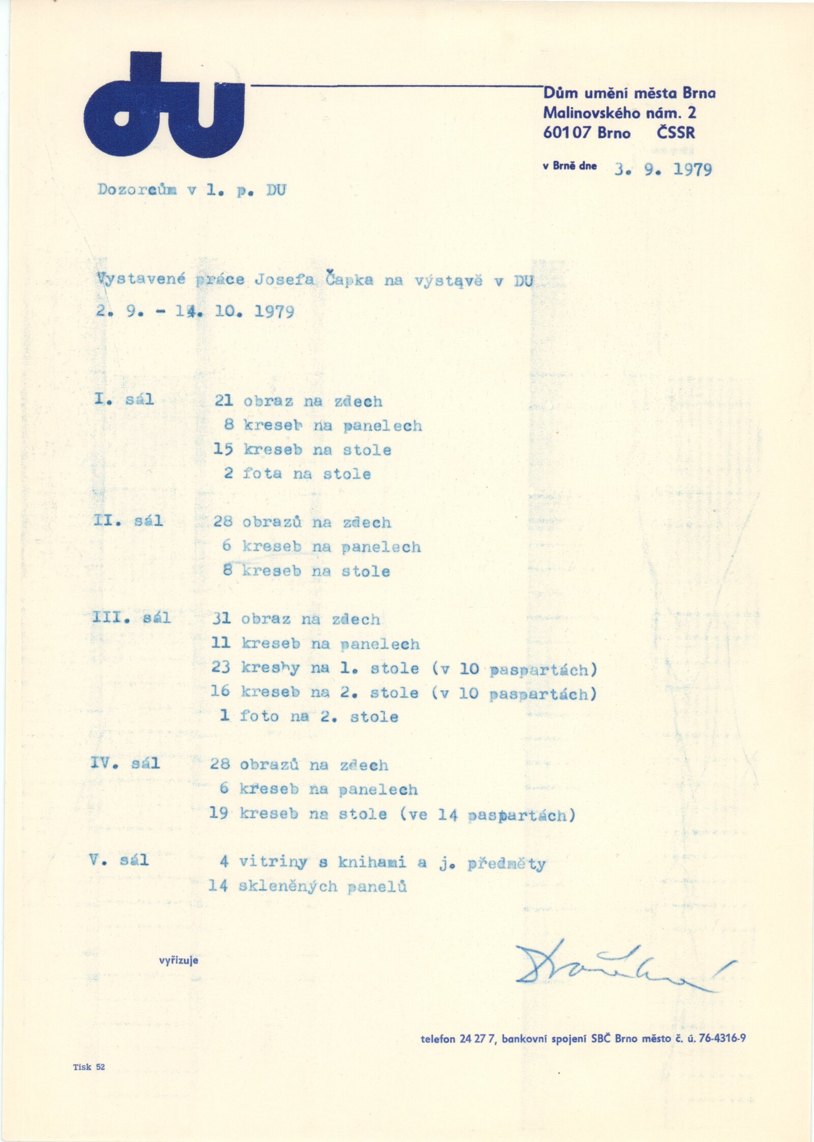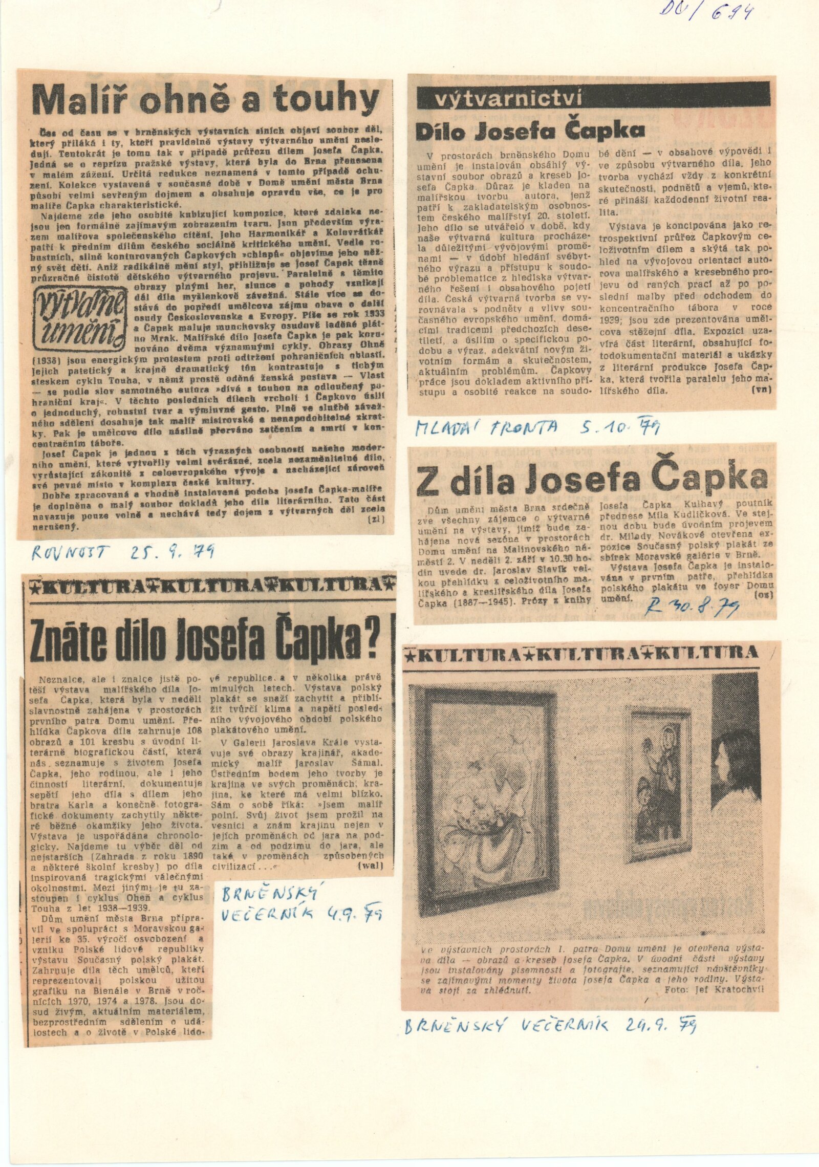 Josef Čapek 1887-1945. Obrazy a kresby: Dům umění města Brna 2. 9. – 14. 10. 1979. Převzatý katalog Josef Čapek (1887–1945). Obrazy a kresby: Jízdárna Pražského hradu 1979 / Texty Jiří Kotalík, Jaroslav Slavík, Jiří Opelík, Josef Čapek. - Praha: Národní galerie, - 140 s., obr., 8 s. bar. obr. příl. Portrét, životní data, výstavy, soupis publikací J. Č., soupis knižních ilustrací, výtvarných prací pro divadlo, bibliografie DU 694; MZK
