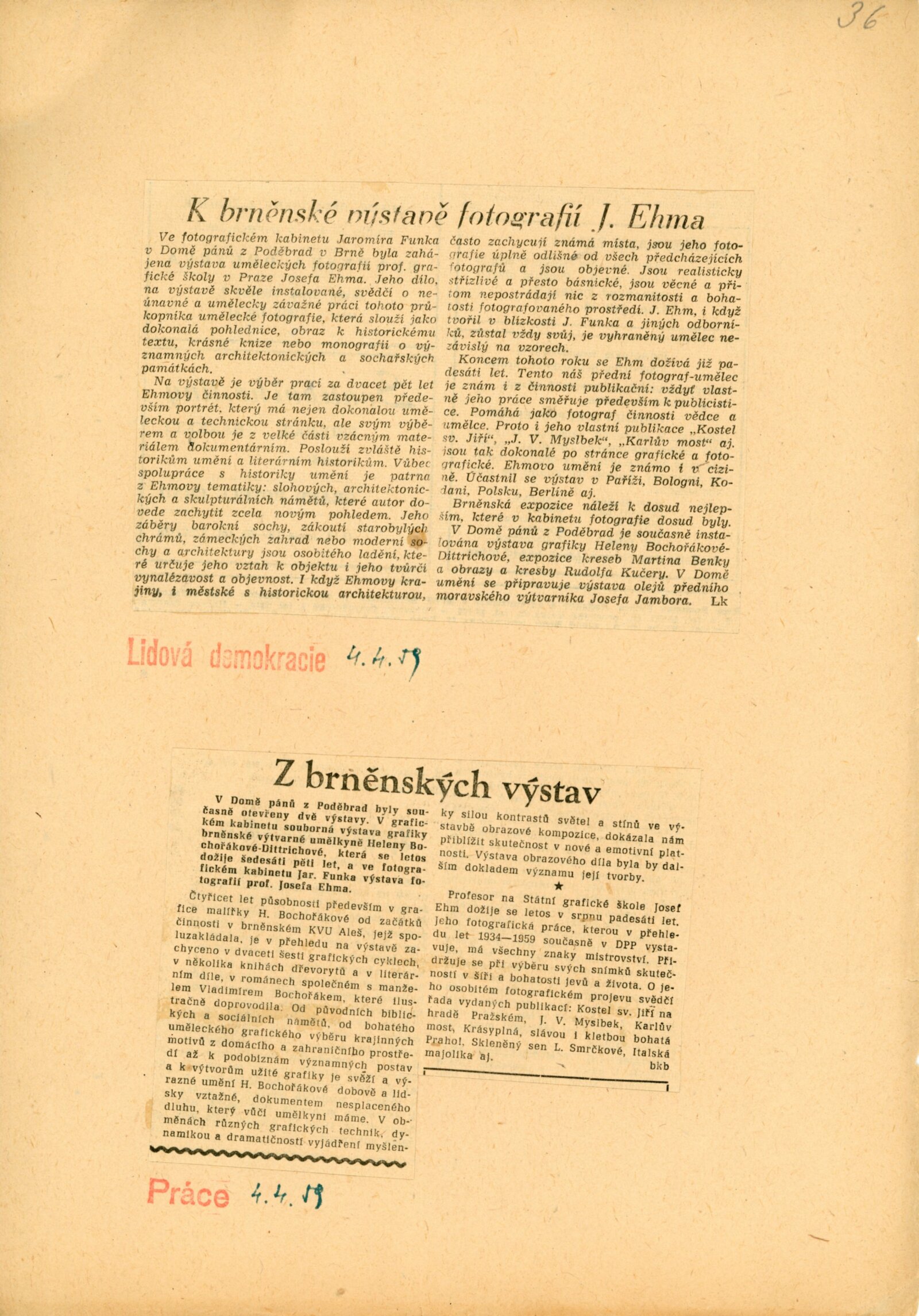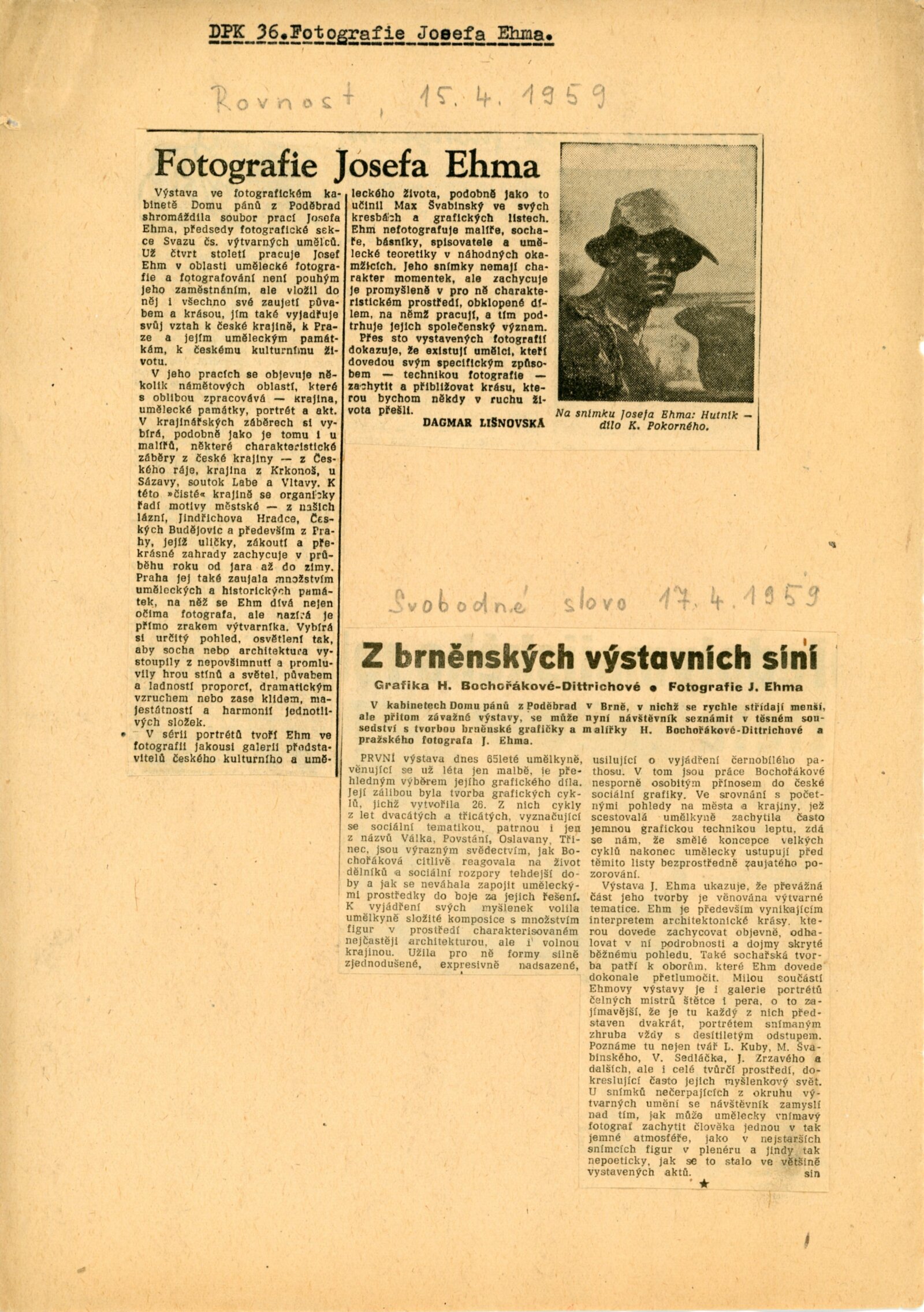 Josef Ehm. Fotografie: Dům umění města Brna / Dům pánů z Poděbrad, Kabinet fotografie J. Funka, 6. výstava, 2. 4. – 26. 4. 1959 / Text: Jiří Jeníček. – Brno: DUmB, 1959. – skládačka, 6 s., obr., výstavy, publikace, DPK 36. – MG
