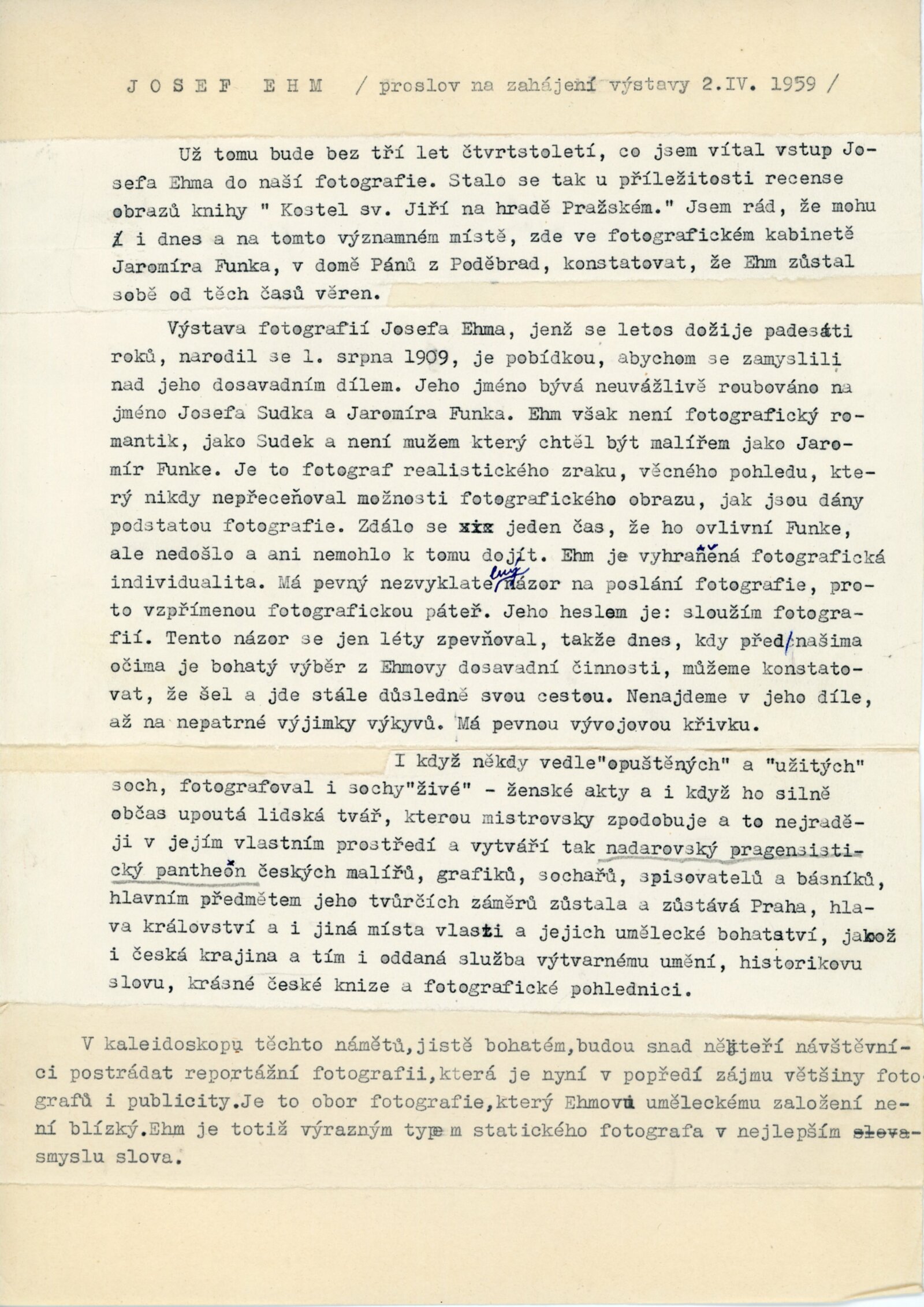 pozvánka, katalog, seznam vystavených fotografií, strojopis textu pro katalog, úvodní slovo na vernisáži (Jiří Jeníček), báseň „Fotografie“ (Oldřich Mikulášek), autorská fotografie a náhledy reprodukcí pro katalog, korespondence (Josef Ehm s DU), recenze v tisku