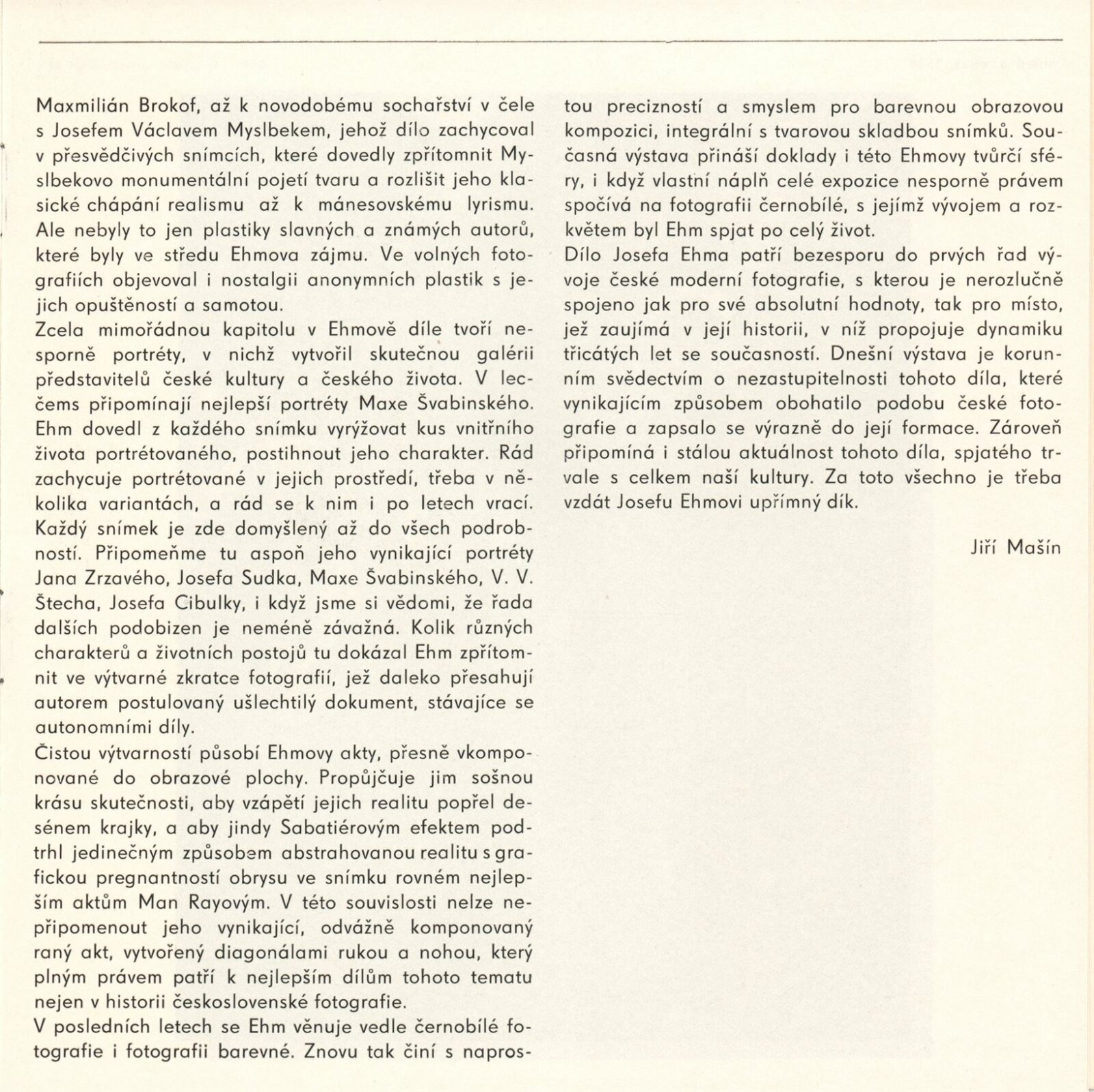 Josef Ehm. Fotografie: Dům umění města Brna, hala, 30. 11. 1984 – 1. 1. 1985 / Text: Jiří Mašín. – Brno: DUmB, 1984. – 12 s., obr., životní data, publikace, DU 789. – MZK; MG