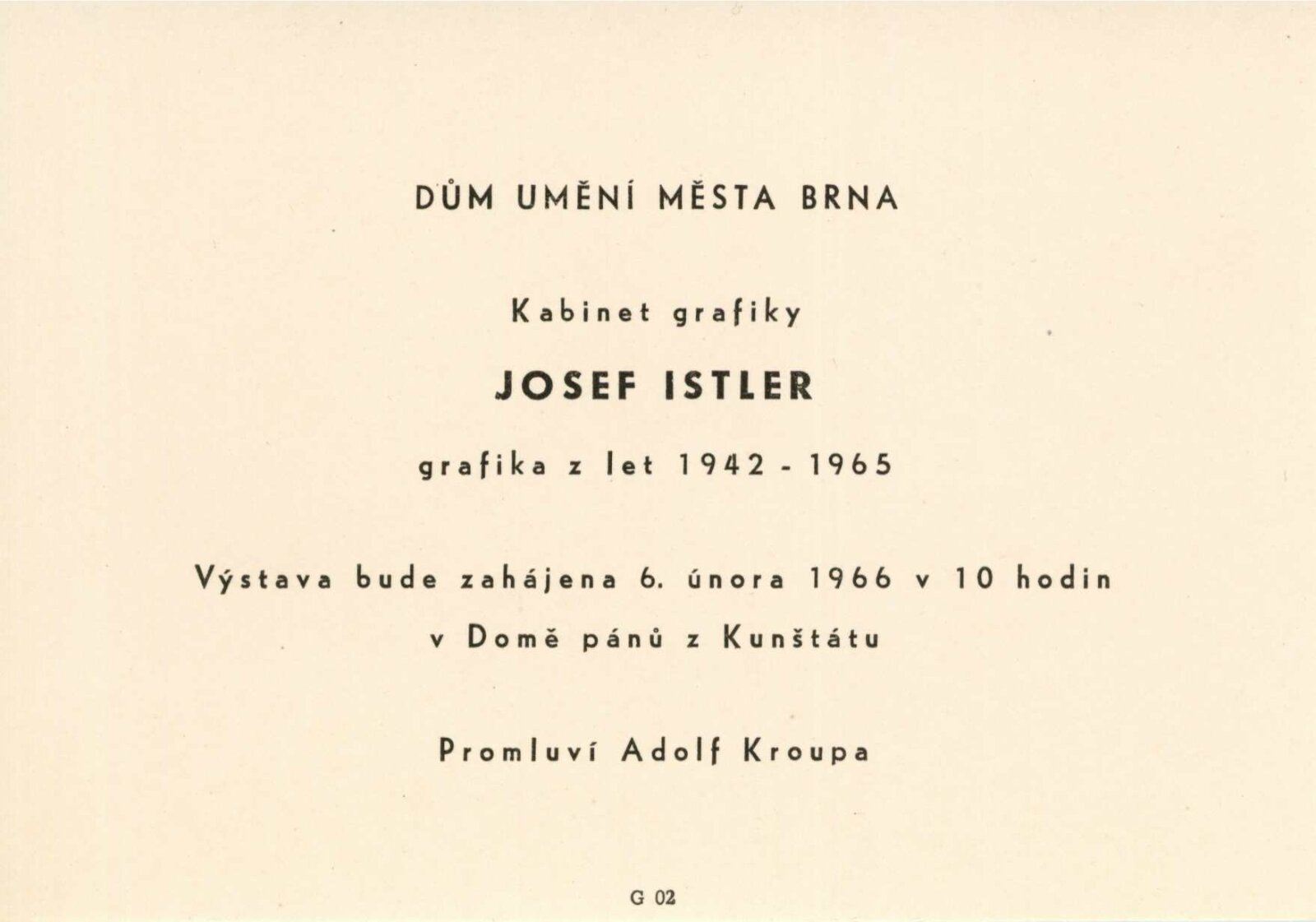 Josef Istler. Grafika z let 1942–1965: Dům umění města Brna / Dům pánů z Kunštátu, 72. výstava Kabinetu grafiky, 6. 2. – 27. 2. 1966 / Text: Vratislav Effenberger. – Brno: DUmB, 1966. – 15 s., 8 s. obr. příl., překlad 2 s., DPK 295. – MZK; MG; MMB