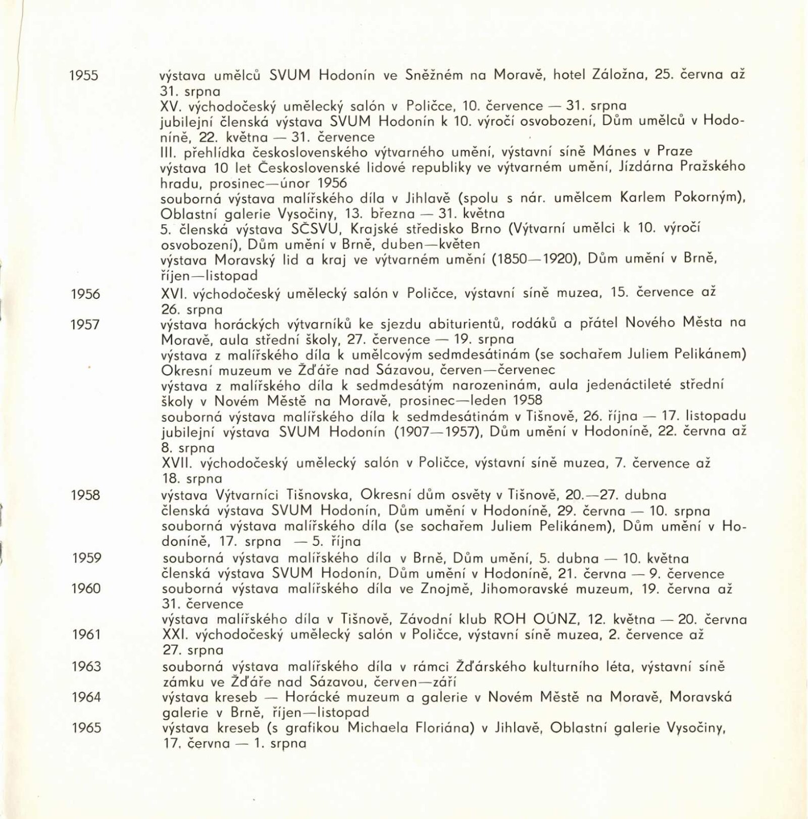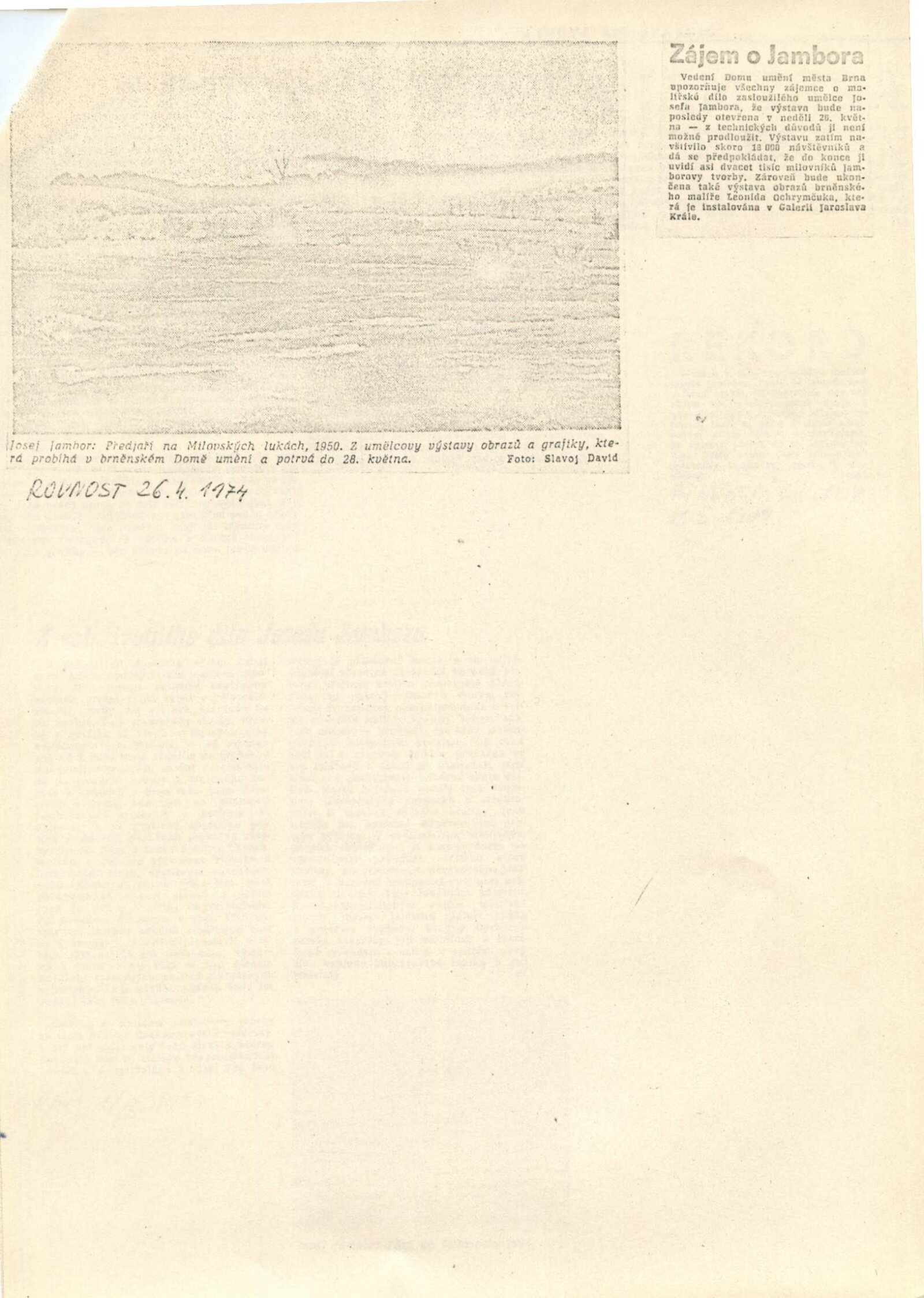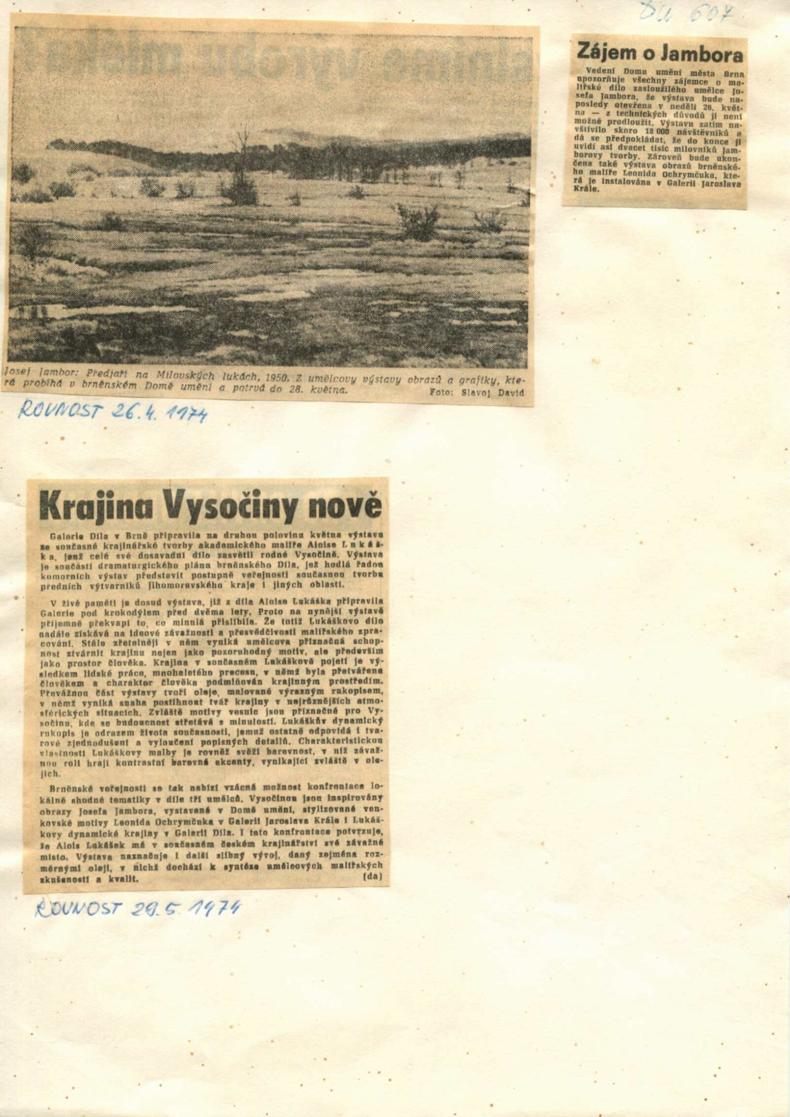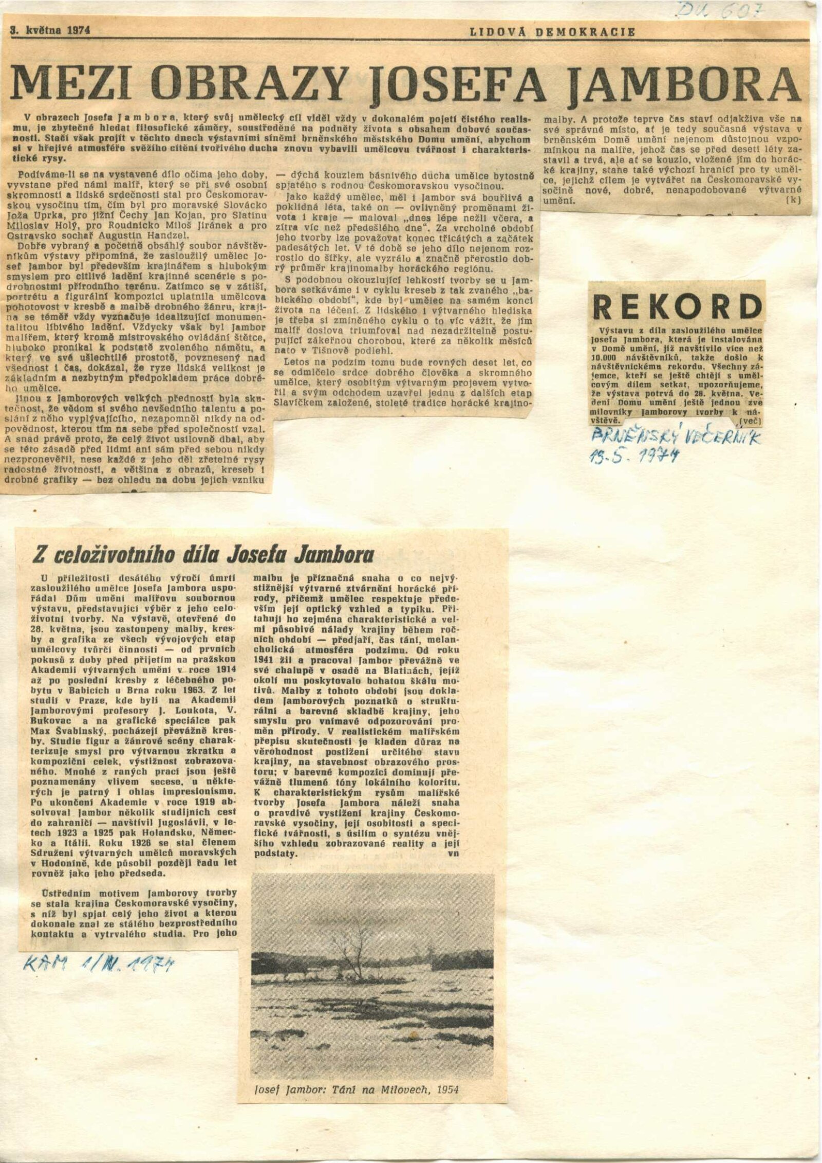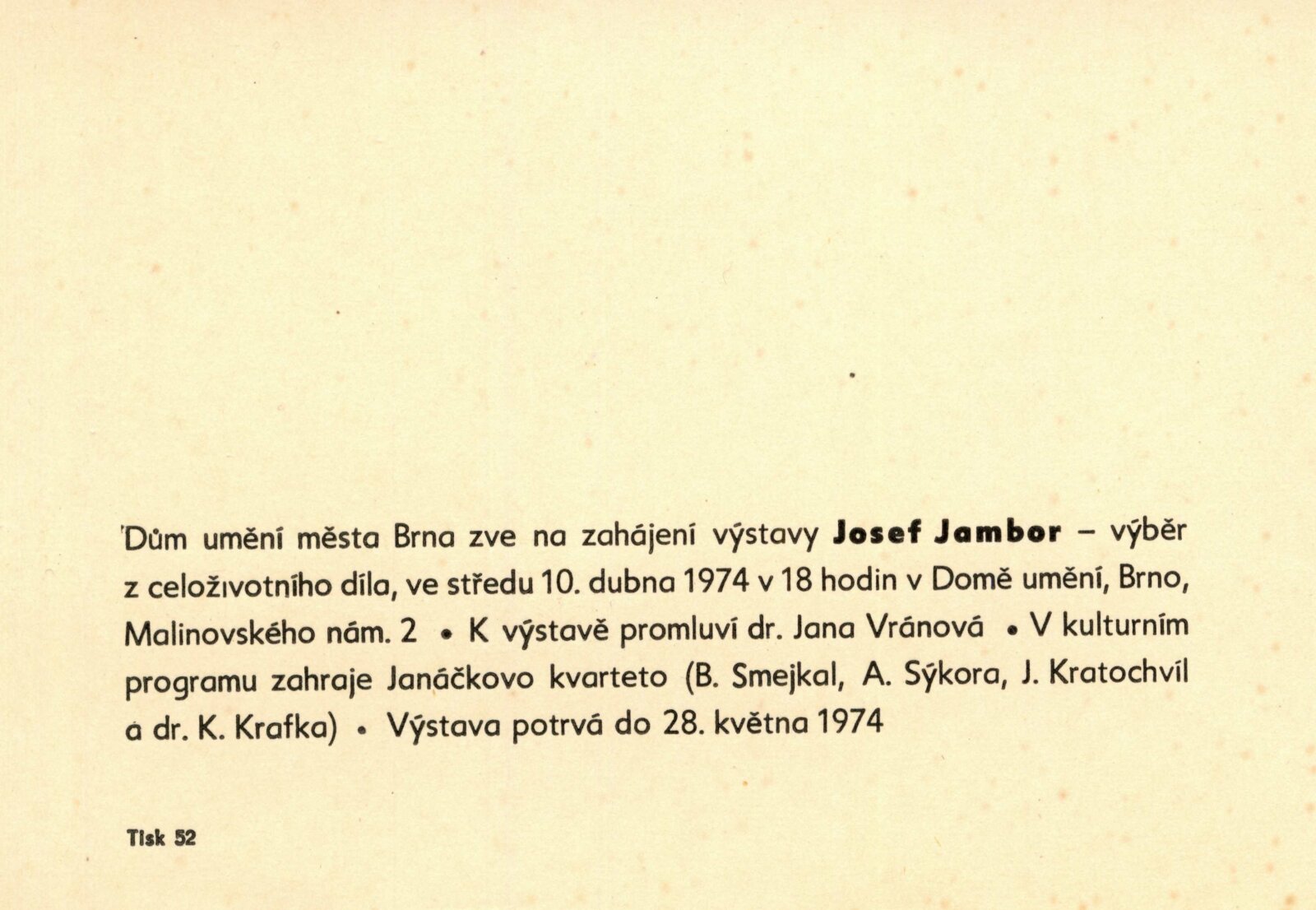 pozvánka, katalog, strojopis, fotografie z vernisáže, hlášení o vernisáži, text k výstavě, úvodní slovo (Jana Vránová), seznamy vystavených děl, pojistný seznam, soupis obrazů (dr. Mirko Rosenbaum), žádost a schválení tisku katalogu, hospodářská smlouva, seznam adres pro pozvánky, básně J. Palata, provozní korespondence (Jana Vránová s majiteli děl o výpůjčkách), reversy, recenze v tisku (vč. Tišnovského kulturního zpravodaje), žádost o povolení výstavy, katalogy výstav Josefa Jambora (Vysokém Mýto, Nové Město na Moravě)