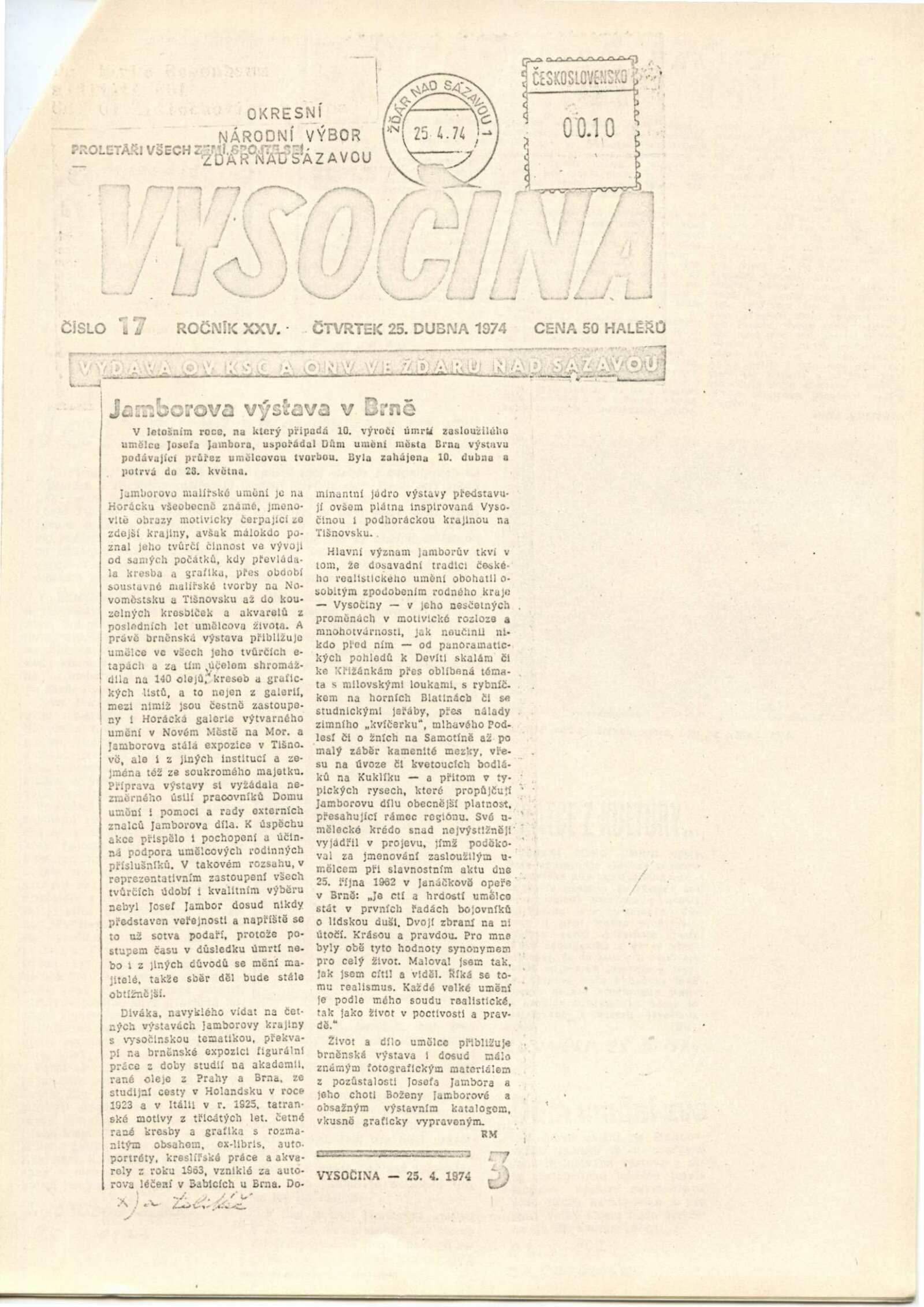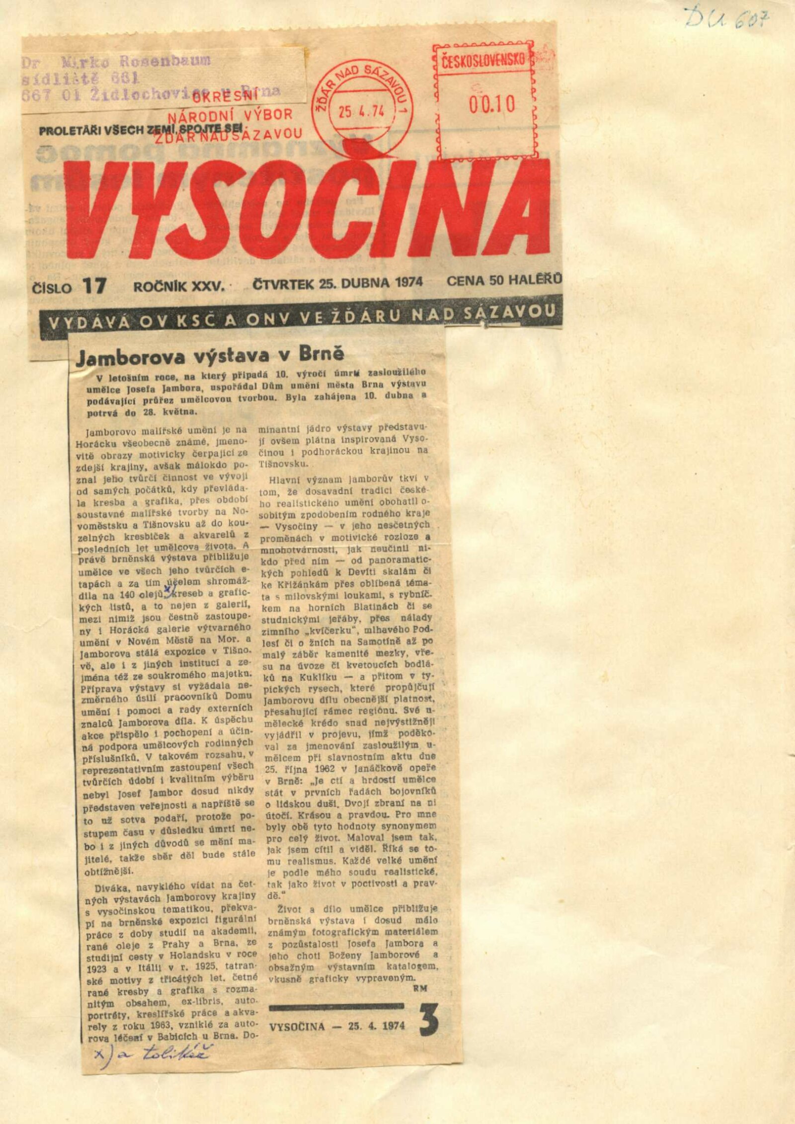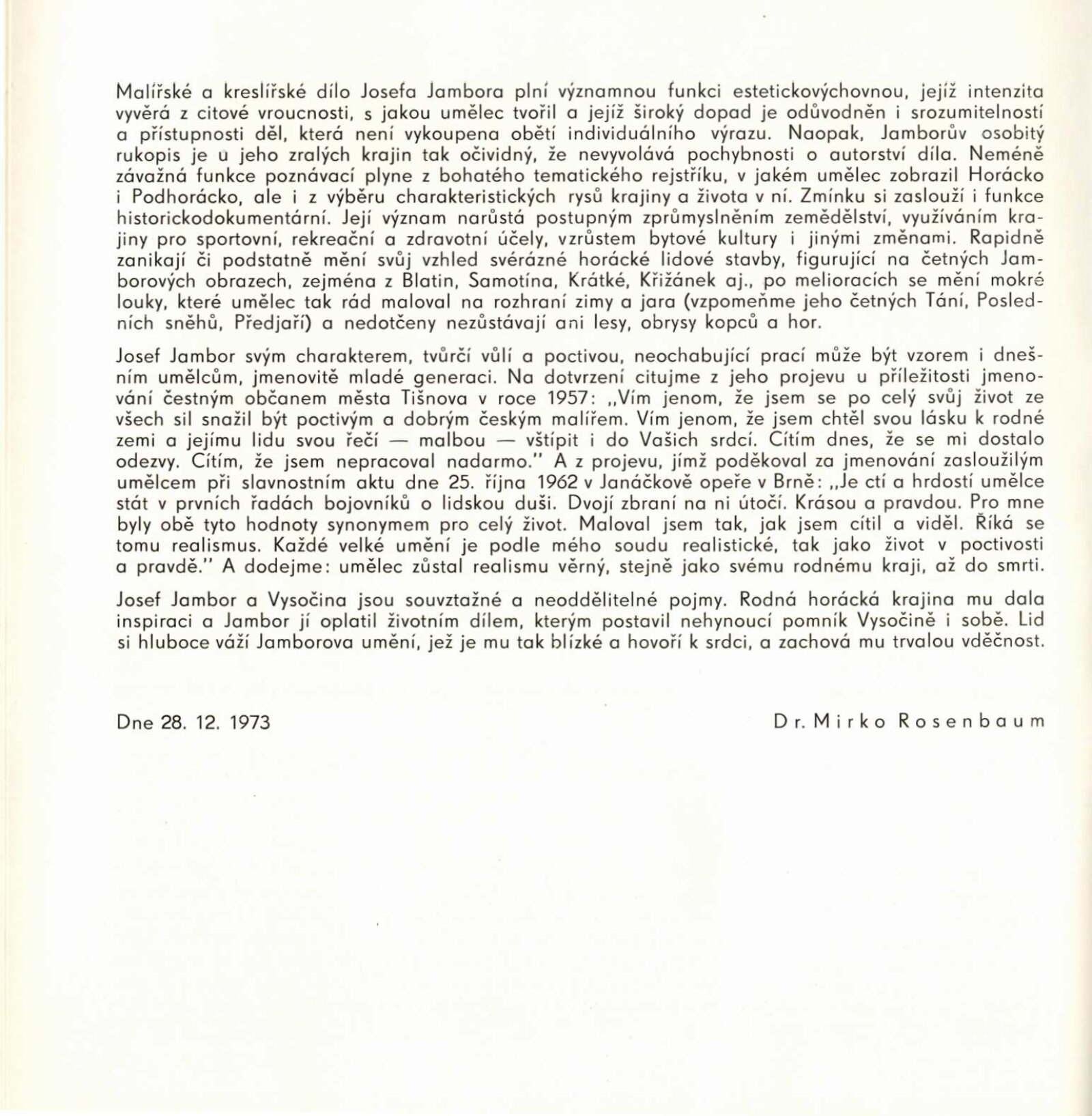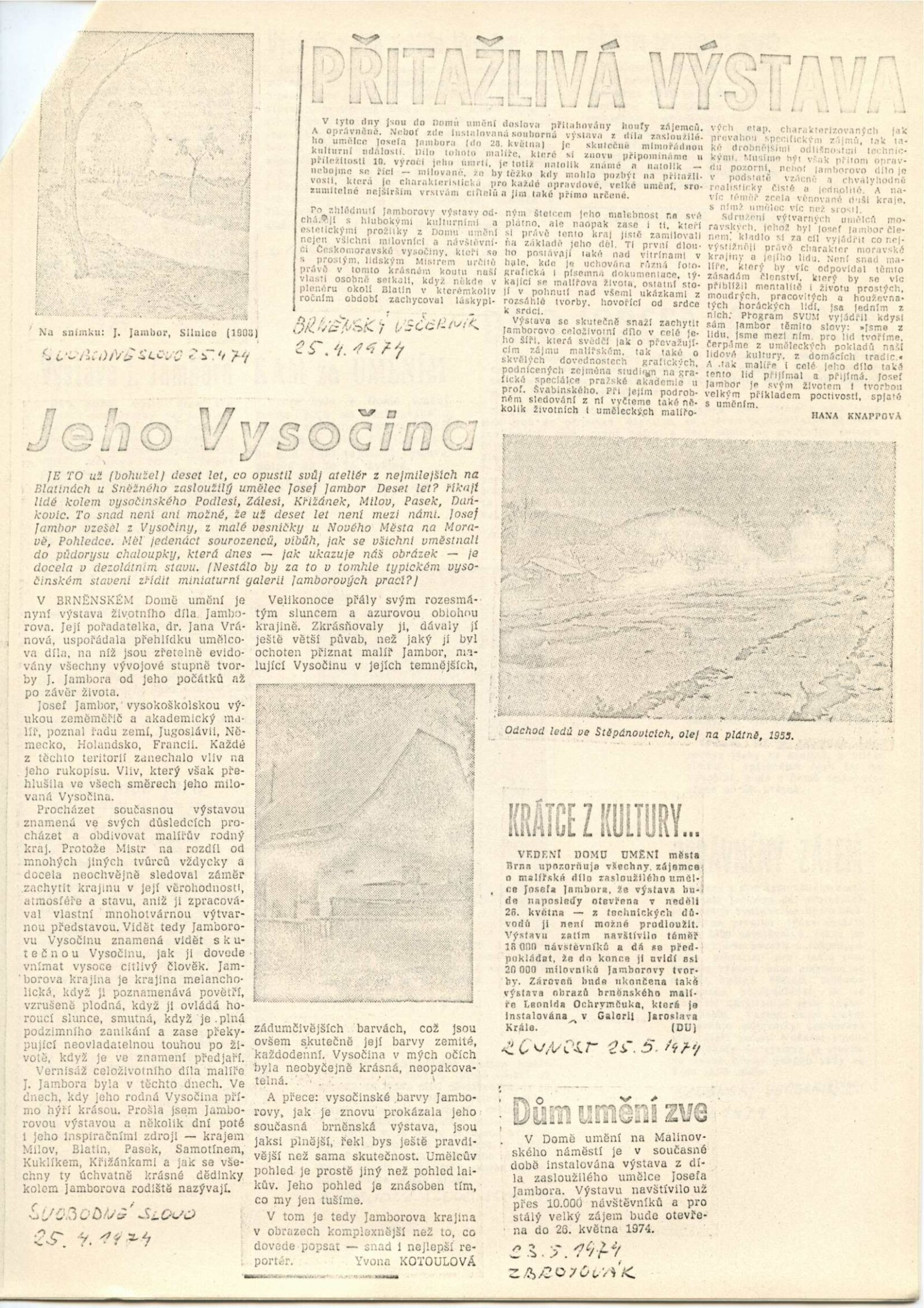 Josef Jambor (1887–1964): Dům umění města Brna, 10. 4. – 28. 5. 1974 / Texty: Jana Vránová, Mirko Rosenbaum. – Brno: DUmB, 1974. – 28 s., obr., seznam vystavených prací 8 s., životní data, výstavy, DU 607. – MZK; MG; MMB