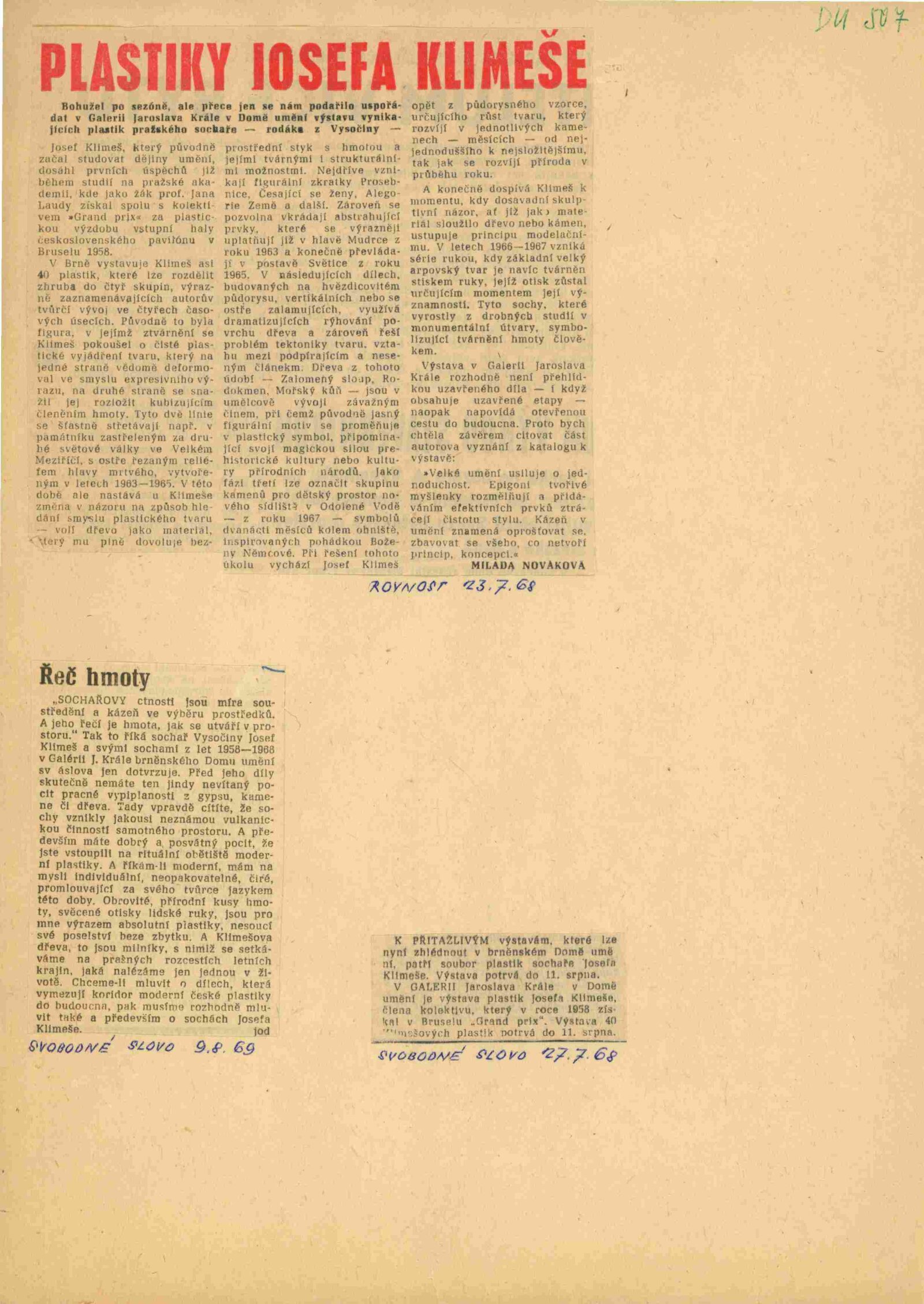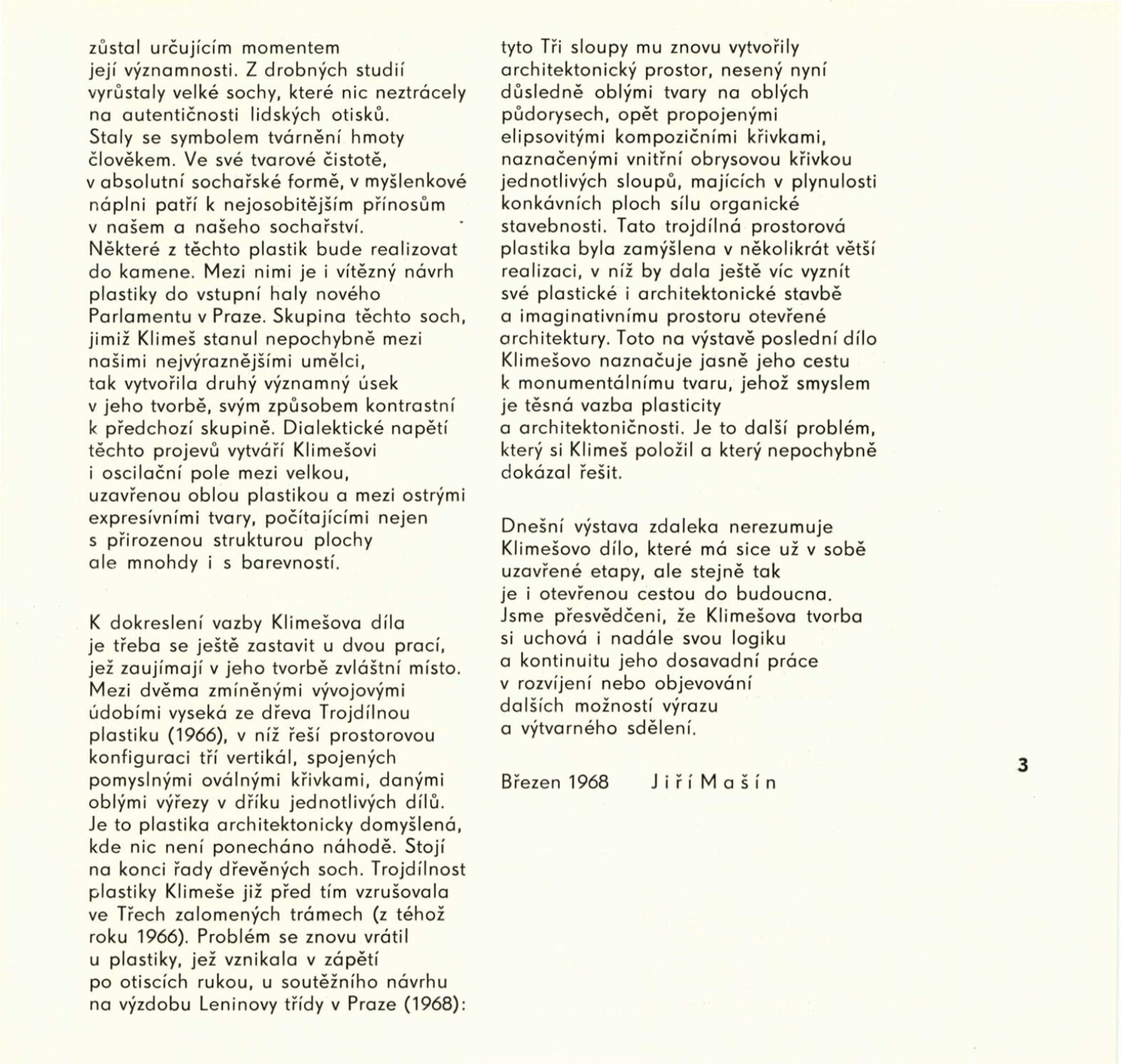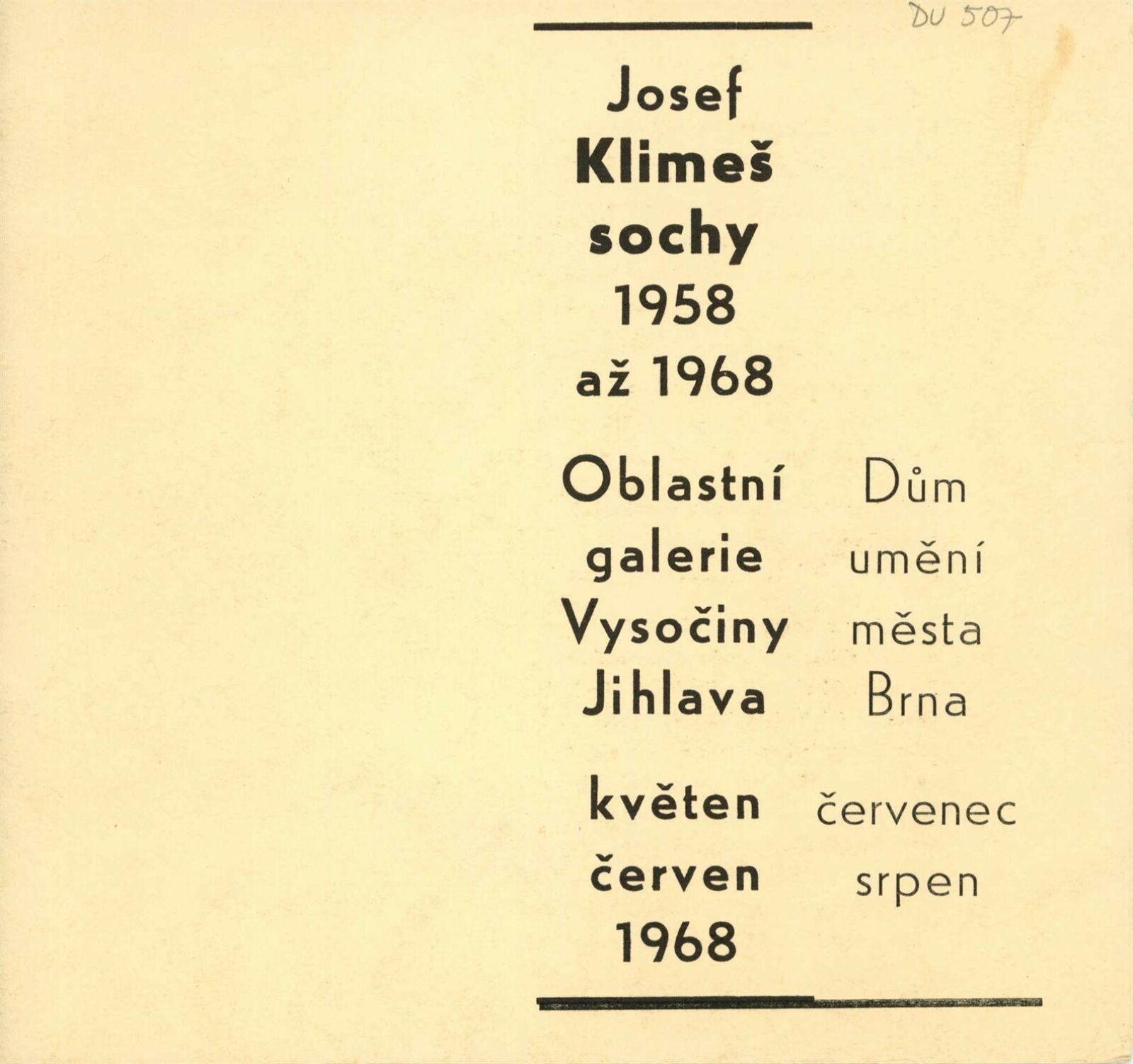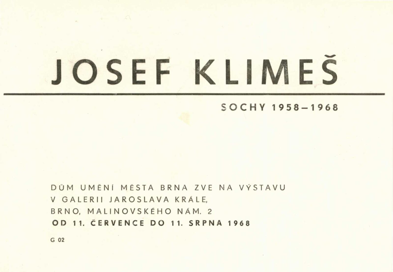 Josef Klimeš. Sochy 1958 až 1968: Dům umění města Brna, Galerie Jaroslava Krále, 11. 7. – 11. 8. 1968 / Texty: Jiří Mašín a autor. – Jihlava: Oblastní galerie Vysočiny, 1968. – 20 s., obr., seznam vystavených prací 2 s. portrét, životní data, studijní cesty, realizace, zastoupení ve sbírkách, bibliografie, DU 507. – MZK; MG