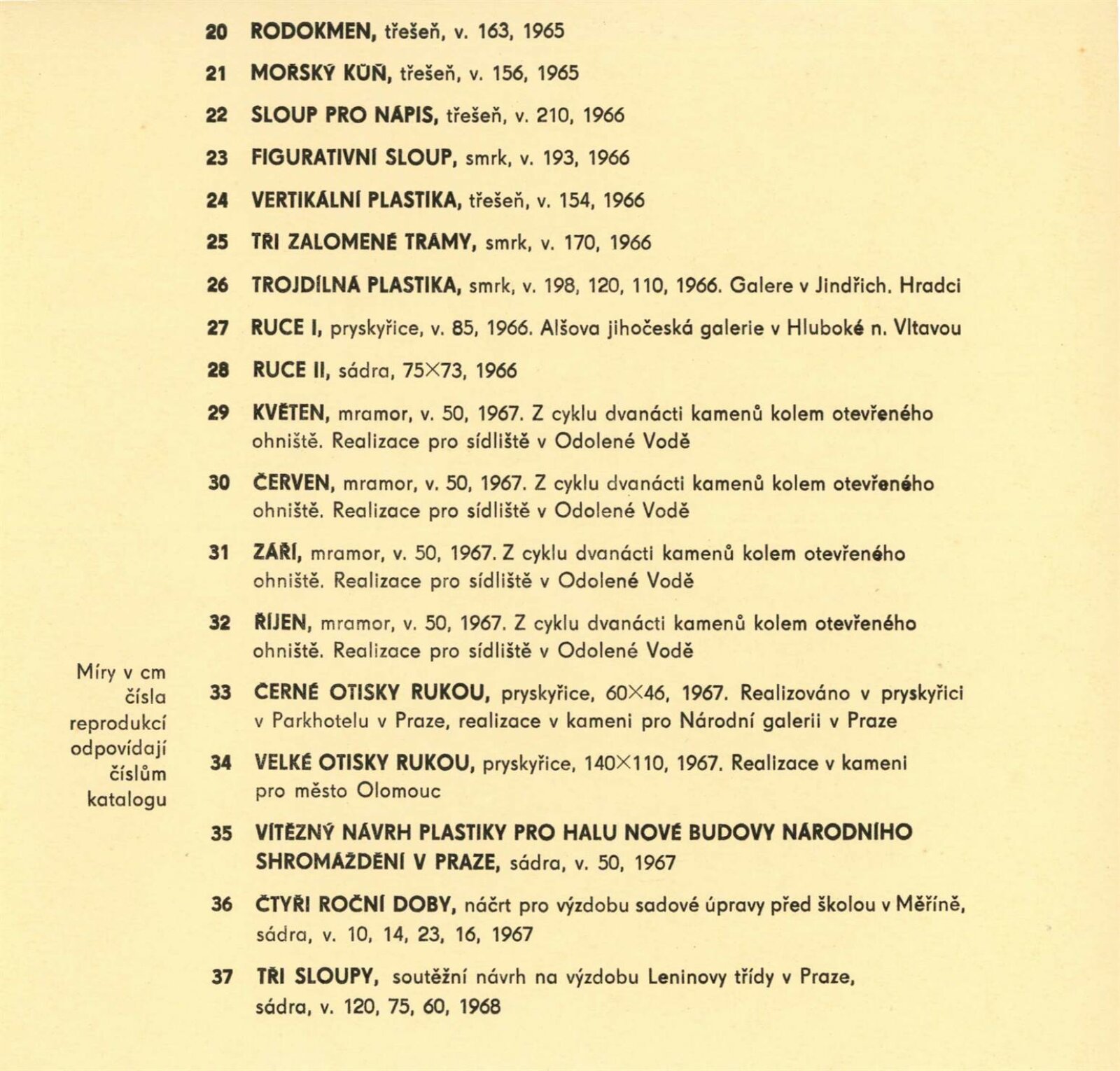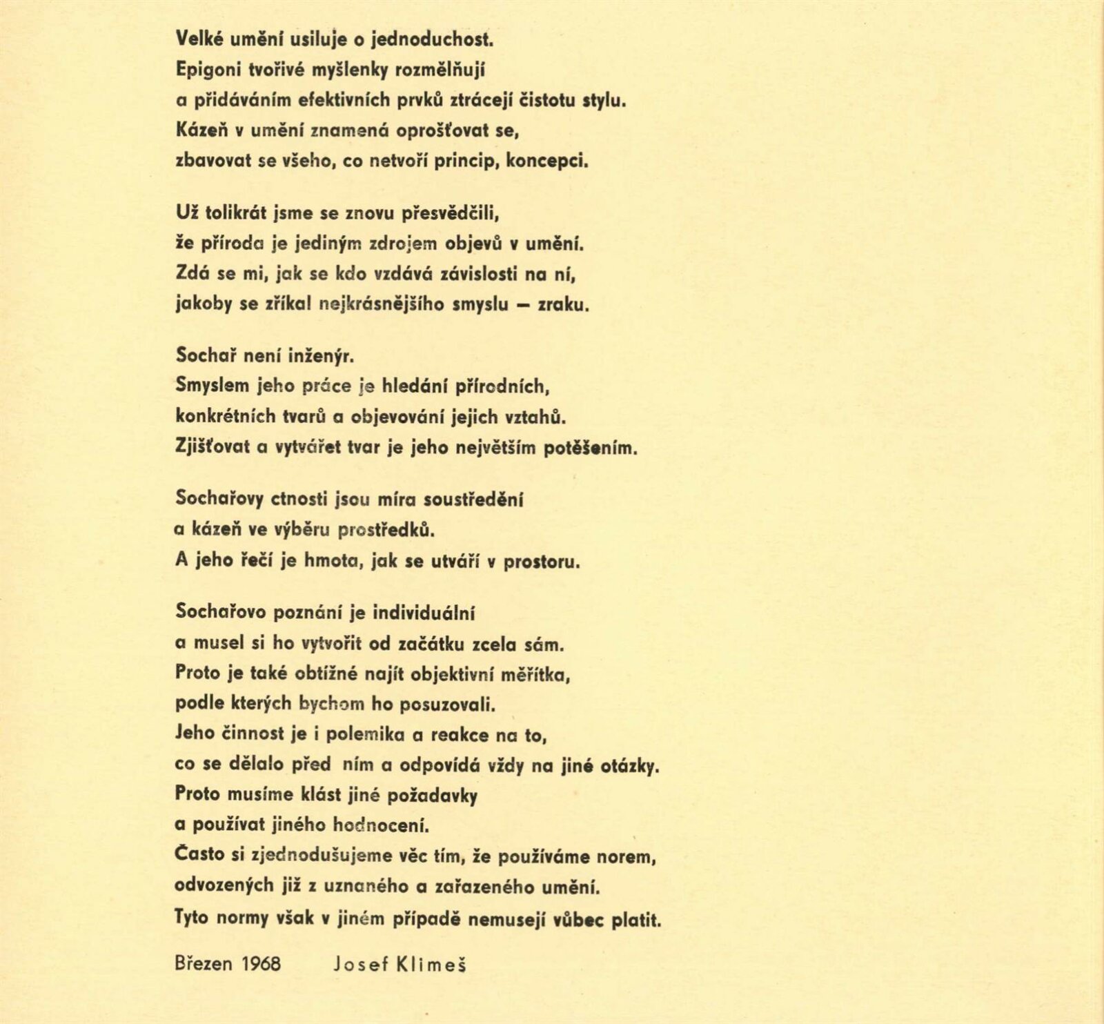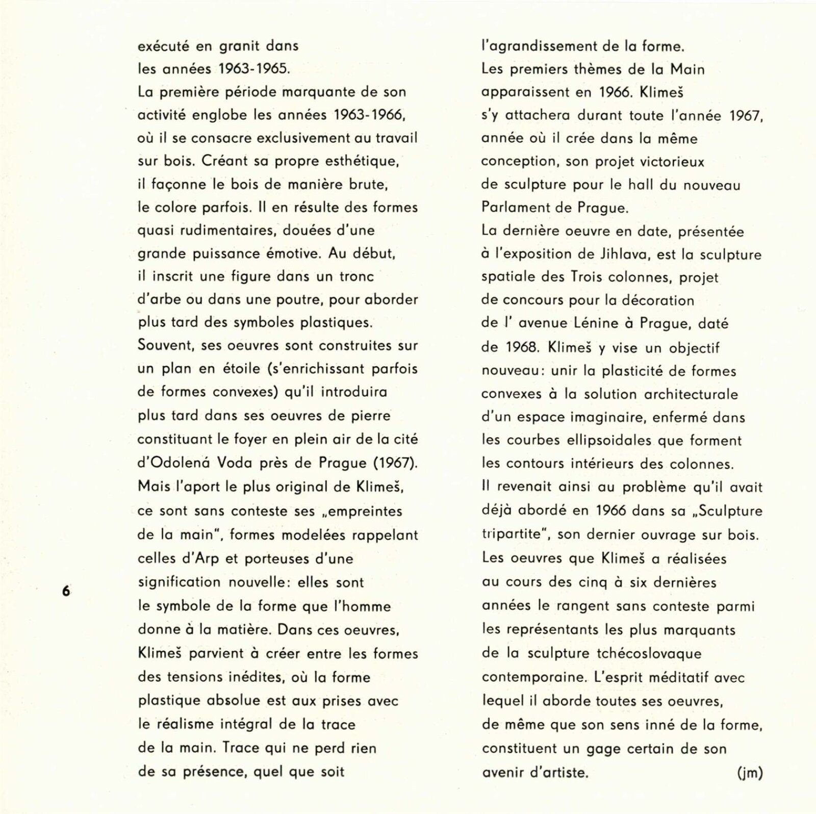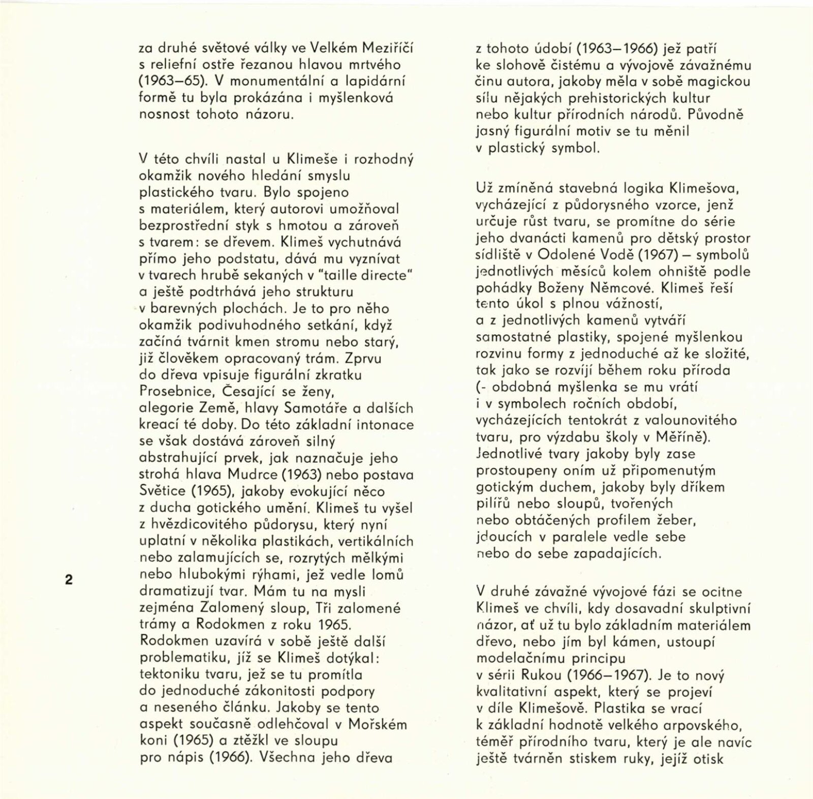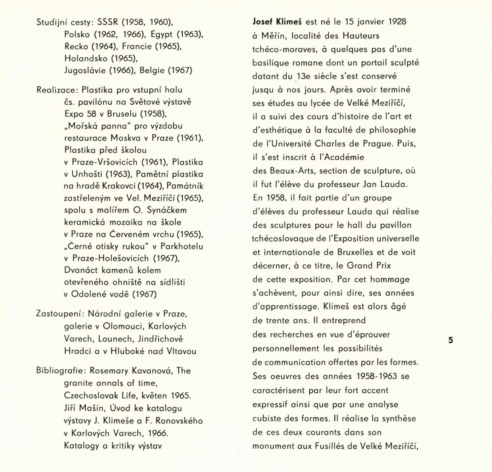 Josef Klimeš. Sochy 1958 až 1968: Dům umění města Brna, Galerie Jaroslava Krále, 11. 7. – 11. 8. 1968 / Texty: Jiří Mašín a autor. – Jihlava: Oblastní galerie Vysočiny, 1968. – 20 s., obr., seznam vystavených prací 2 s. portrét, životní data, studijní cesty, realizace, zastoupení ve sbírkách, bibliografie, DU 507. – MZK; MG
