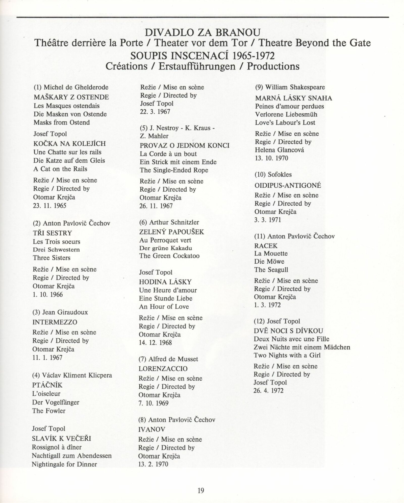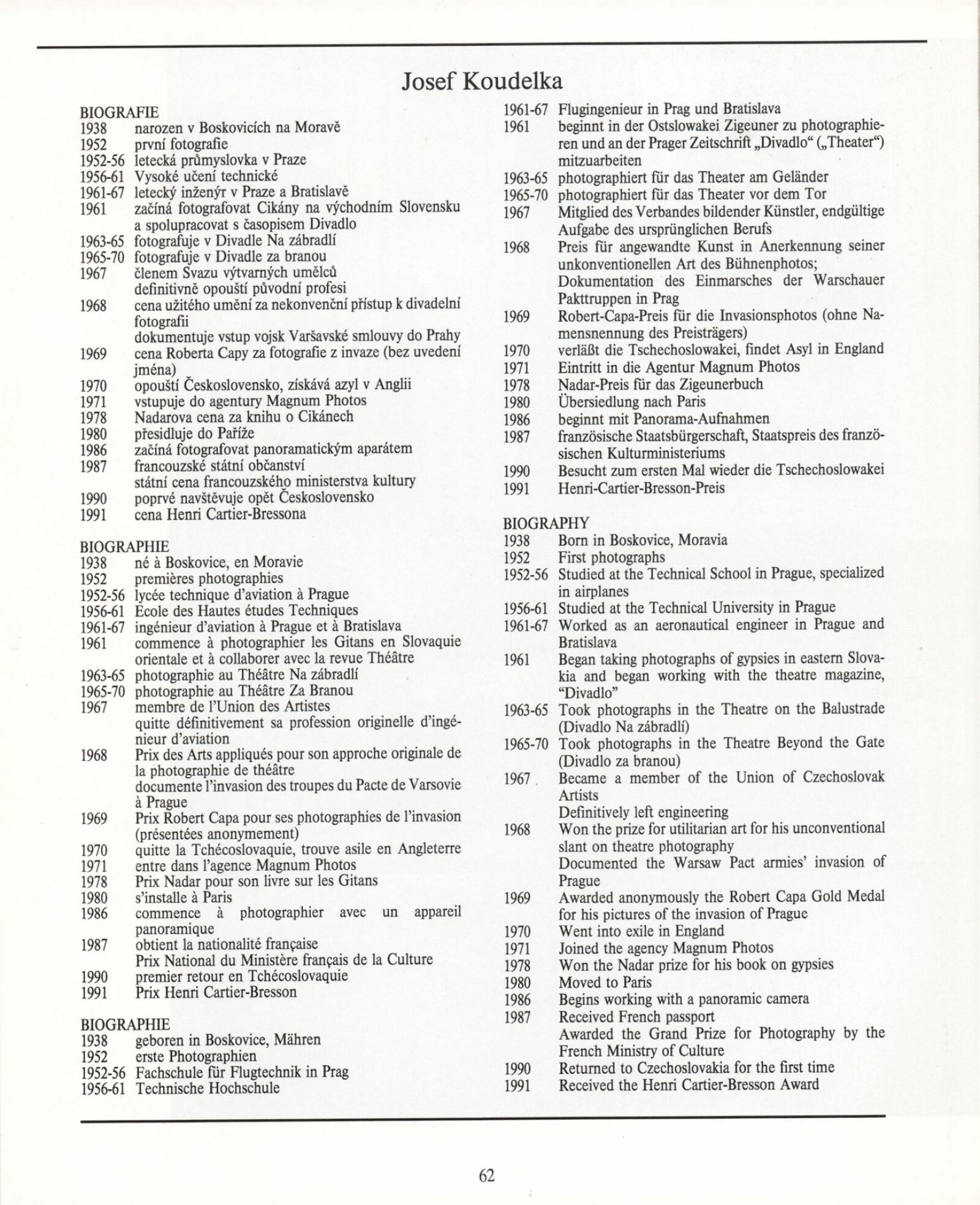 Josef Koudelka. Fotografie: hala DU 6. 1. – 6. 2. 1994 Převzatý katalog Josef Koudelka. Fotografie: Divadlo za branou 1965-1970: Divadlo za branou, Praha od 29.1993 / Text Otomar Krejča, Anna Fárová. - Praha: Divadlo za branou, - 63 s., obr. Životní data, výstavy, bibliografie DU 959