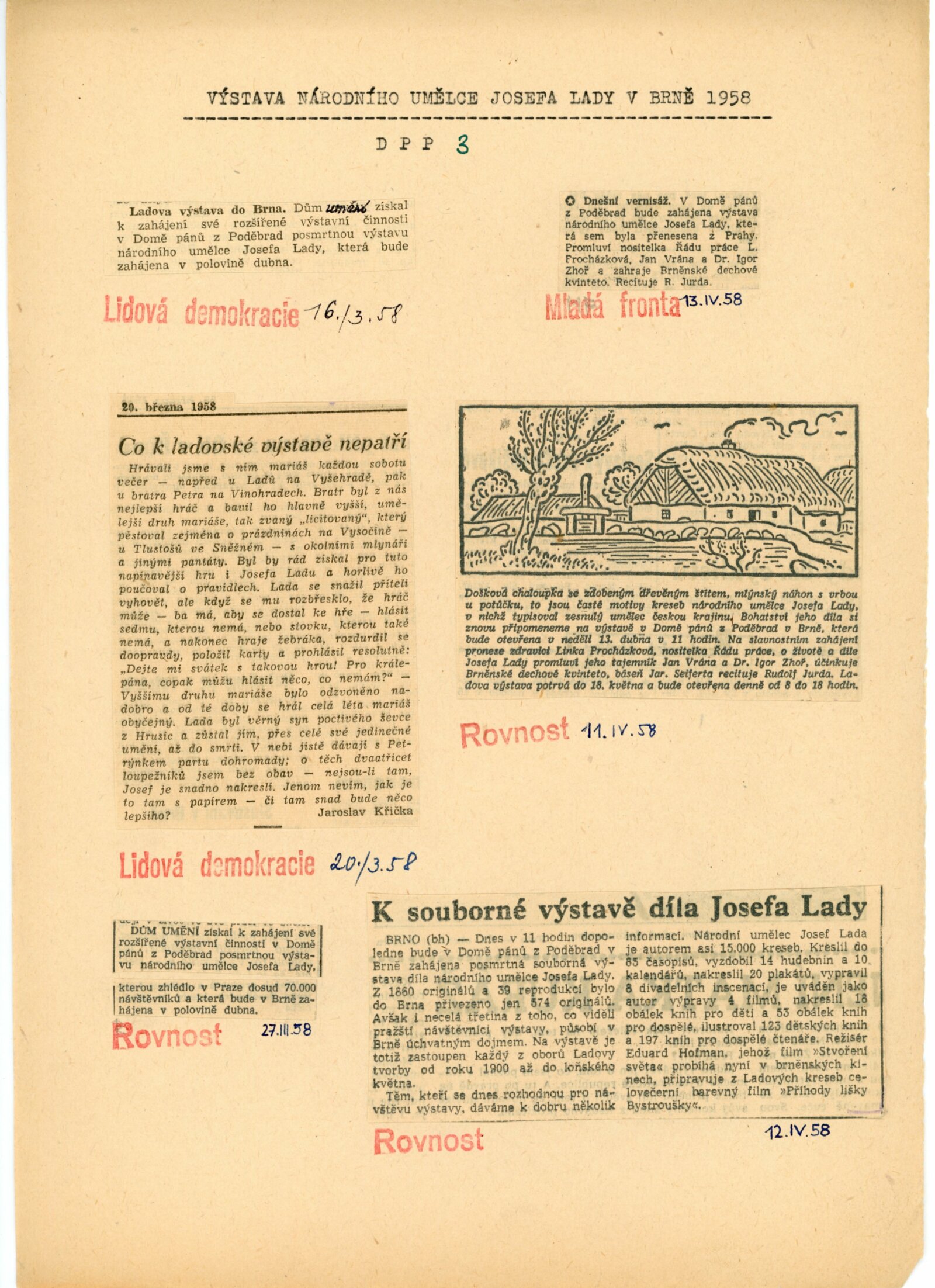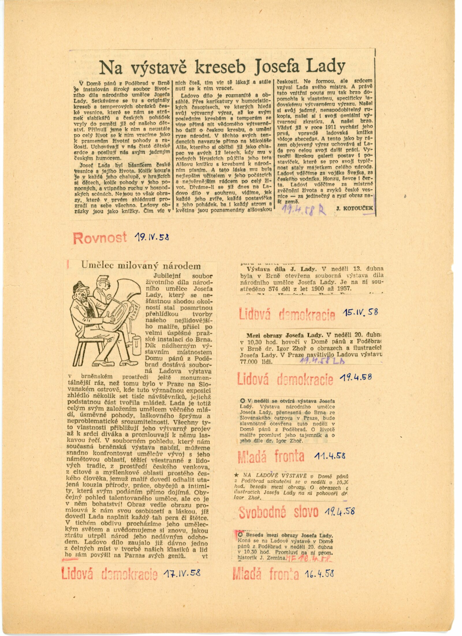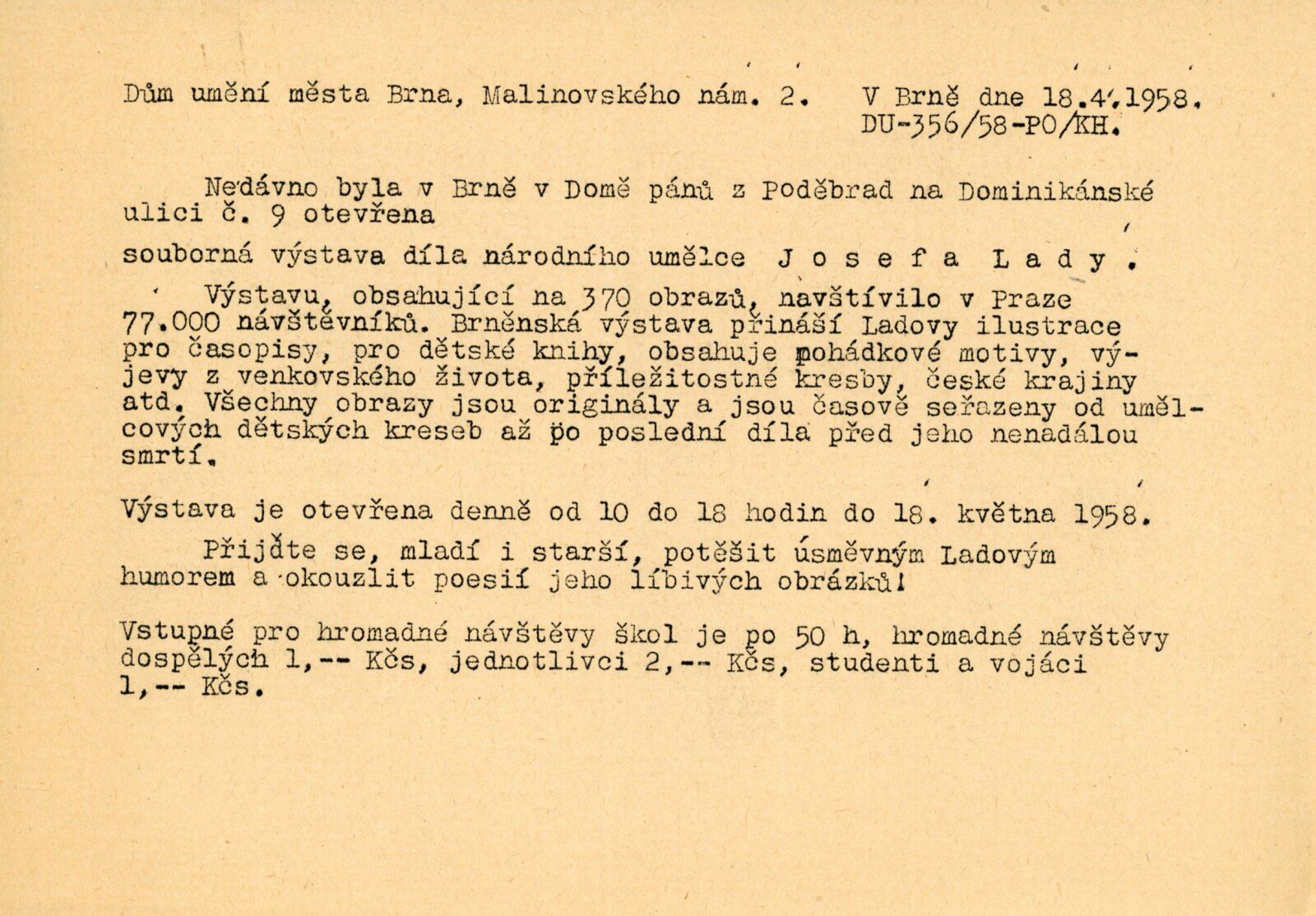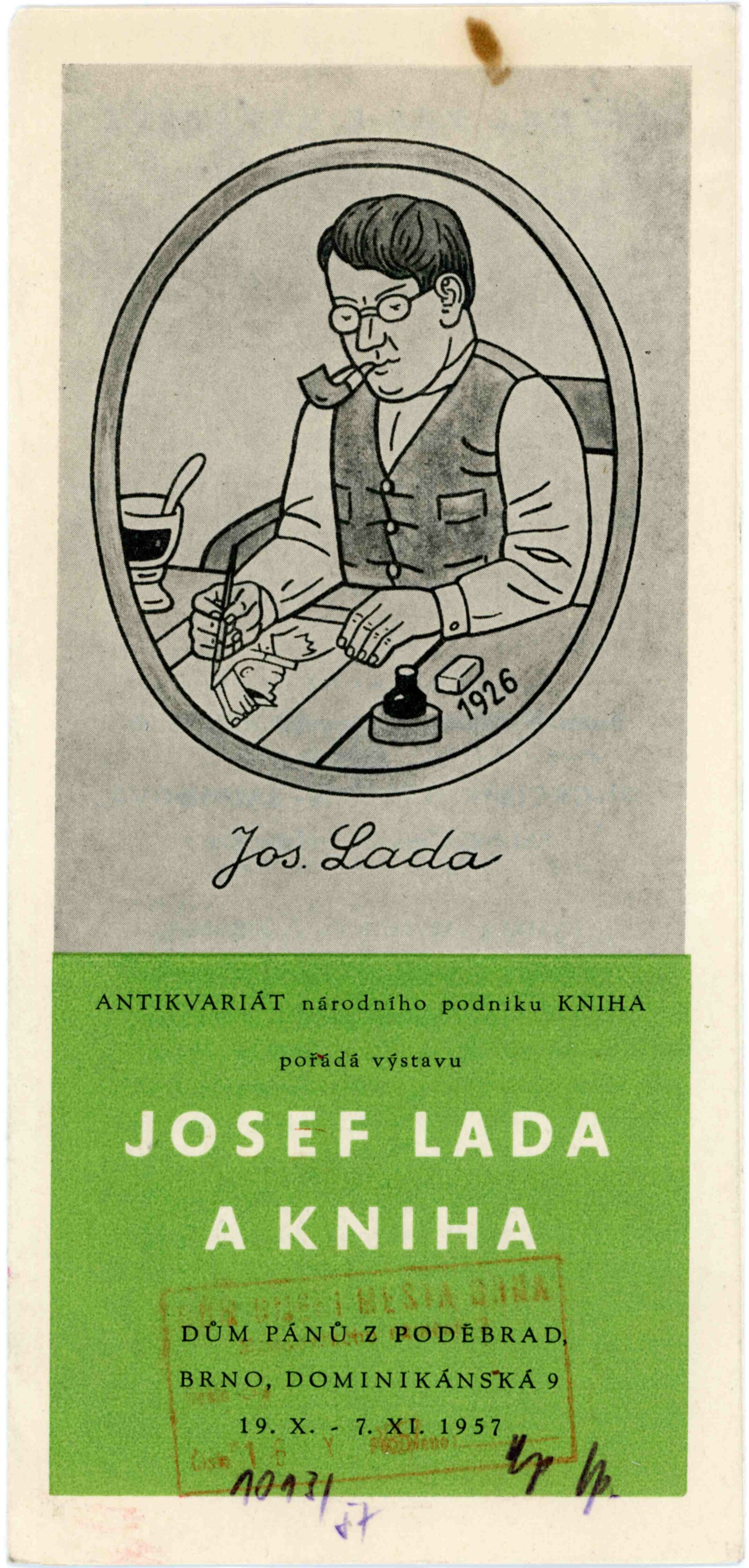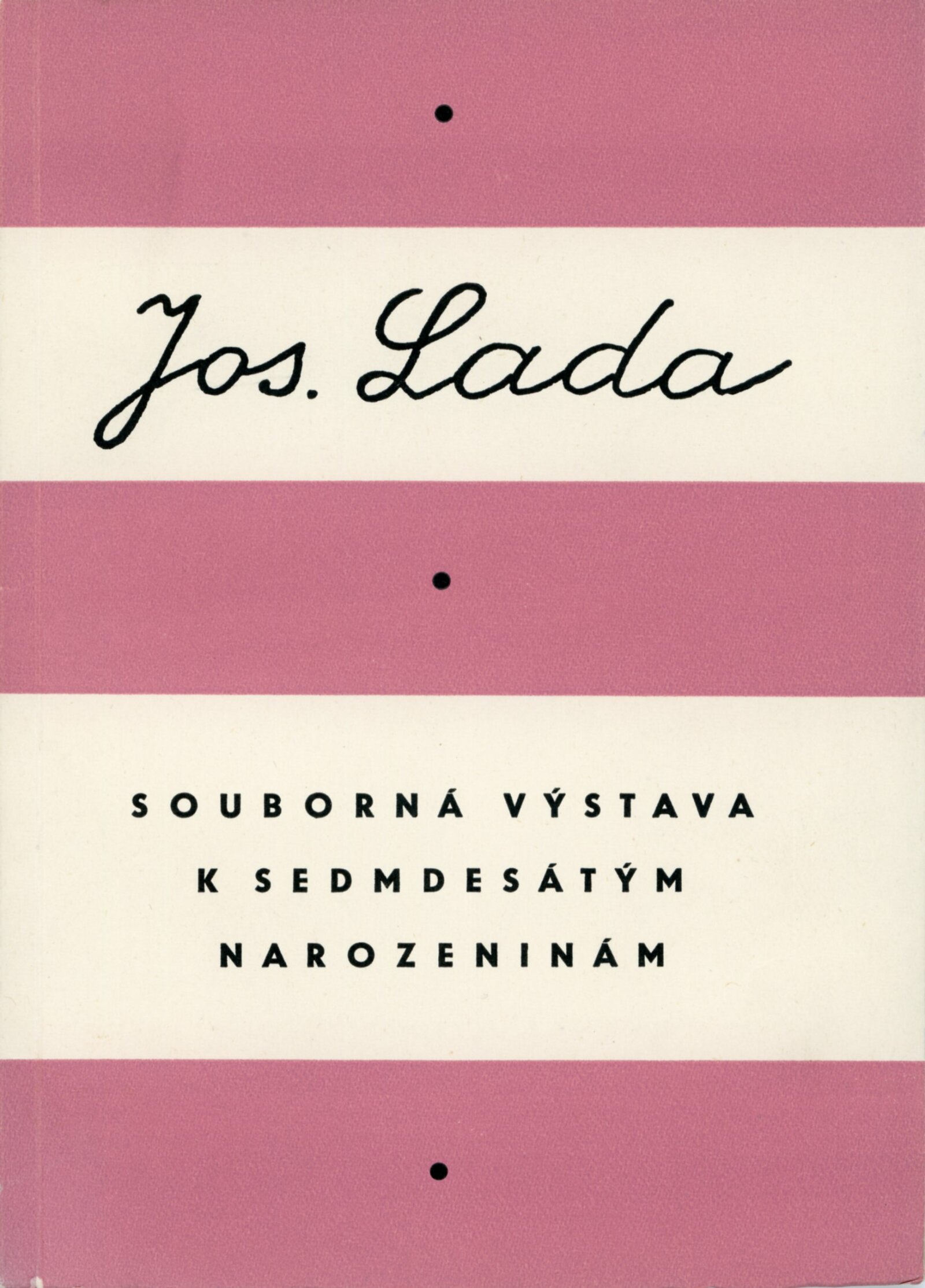 Josef Lada: Dům umění v Brně / Dům pánů z Poděbrad, 13. 4. – 18. 5. 1958 / Převzatý katalog. Národní umělec Josef Lada. Souborná výstava k jeho sedmdesátým narozeninám: Slovanský ostrov, Praha, prosinec 1957 – únor 1958 / Text: Jaromír Pečírka. – Praha: SČSVU, 1958. – 40 s., 32 s. obr. přil. 2 s. jednobar. obr. přil., báseň Ladislav Stehlík, DPK 3. – MG