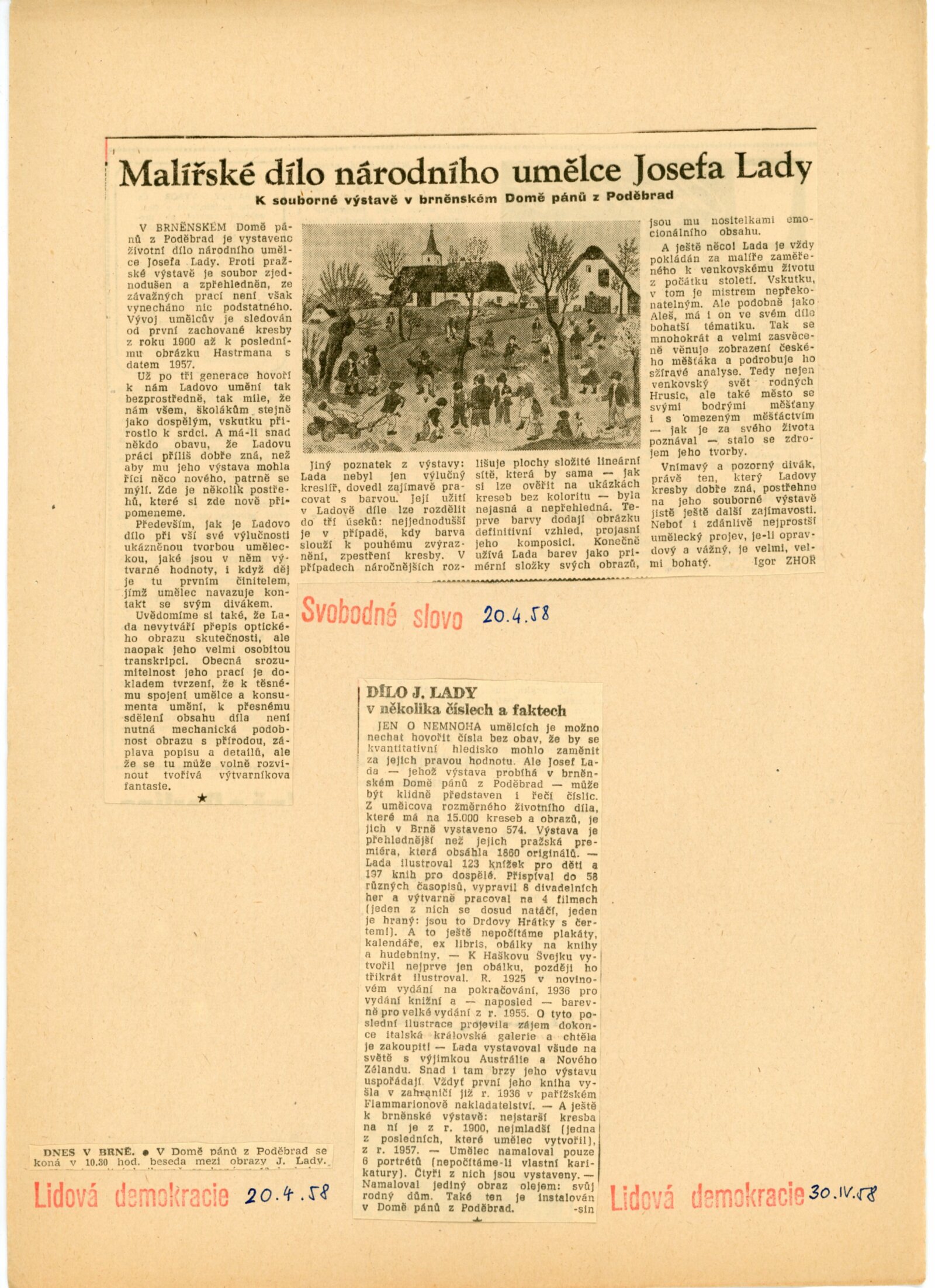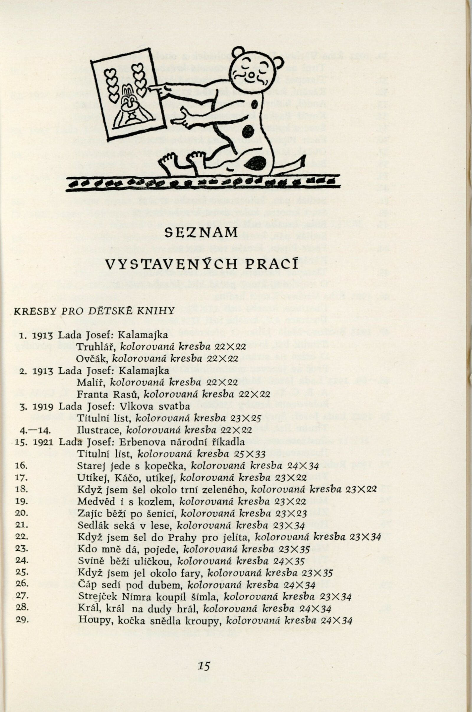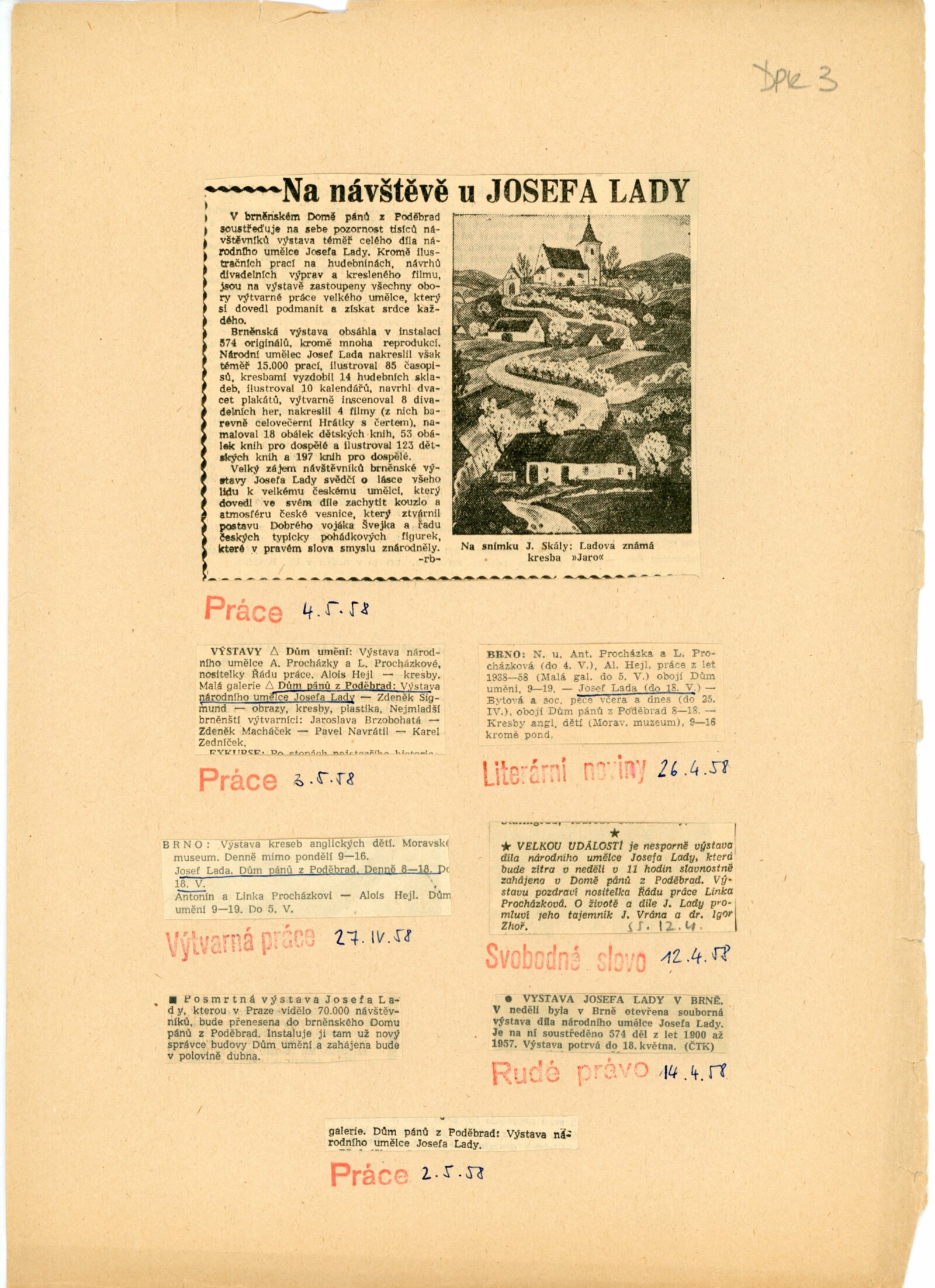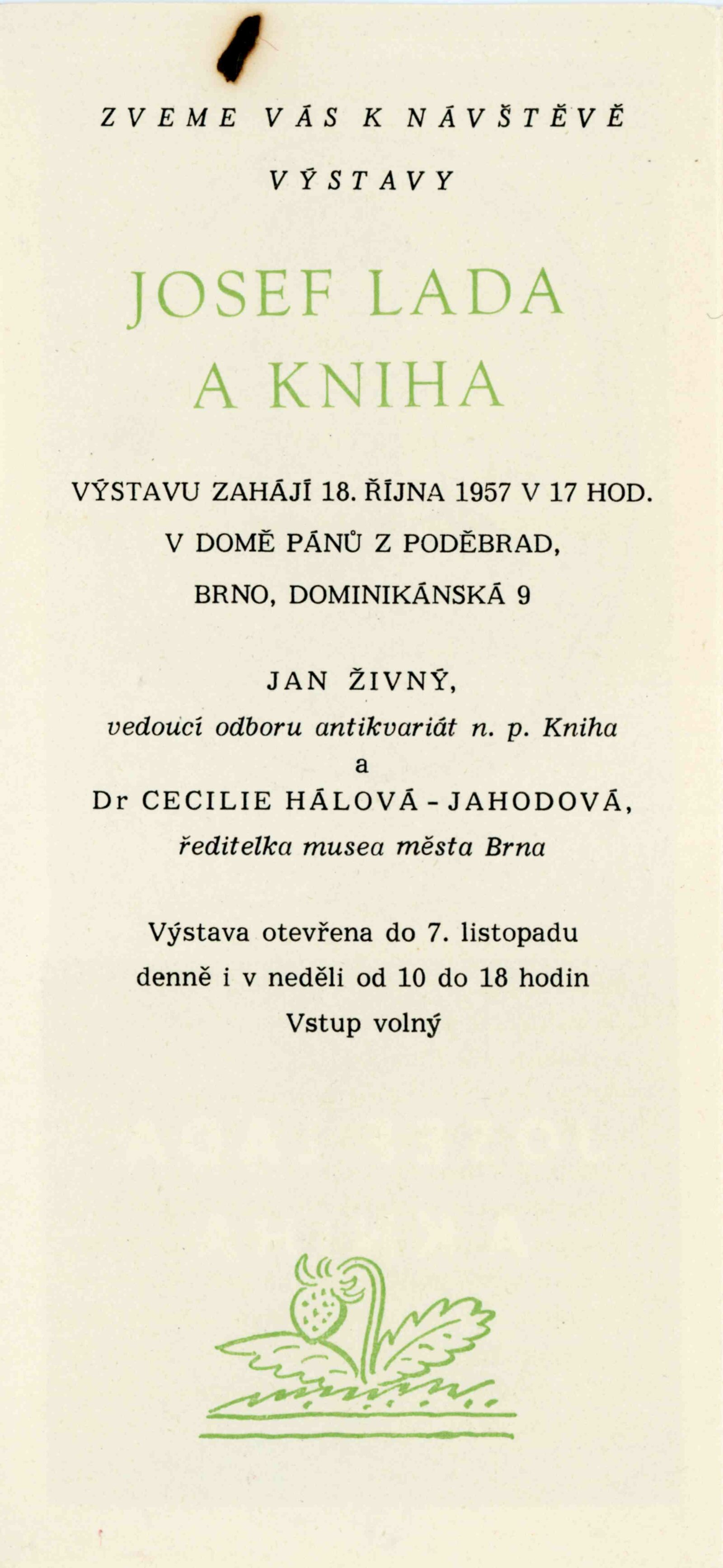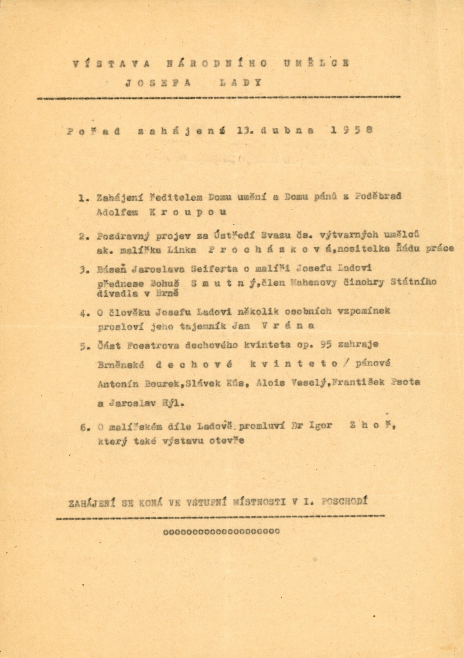 Josef Lada: Dům umění v Brně / Dům pánů z Poděbrad, 13. 4. – 18. 5. 1958 / Převzatý katalog. Národní umělec Josef Lada. Souborná výstava k jeho sedmdesátým narozeninám: Slovanský ostrov, Praha, prosinec 1957 – únor 1958 / Text: Jaromír Pečírka. – Praha: SČSVU, 1958. – 40 s., 32 s. obr. přil. 2 s. jednobar. obr. přil., báseň Ladislav Stehlík, DPK 3. – MG