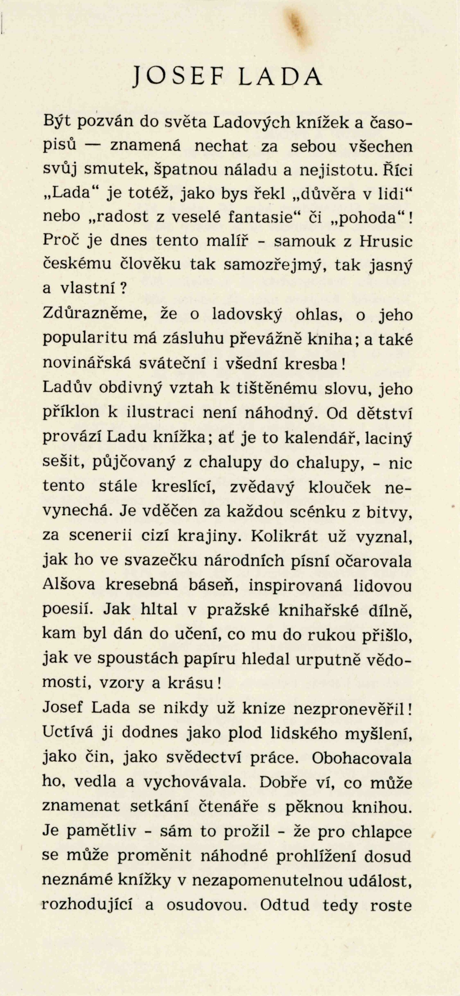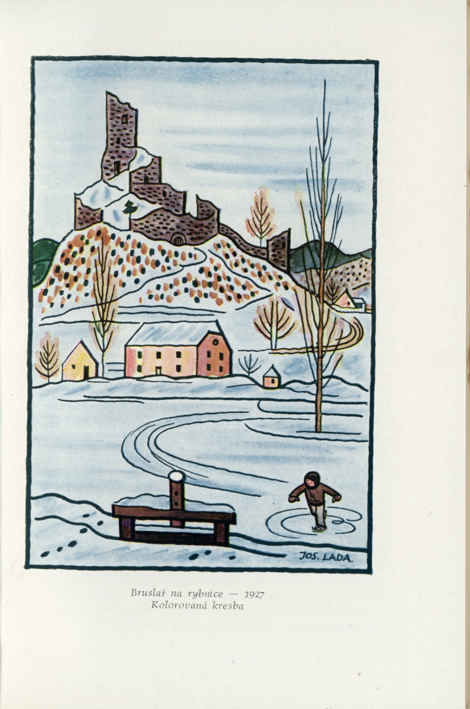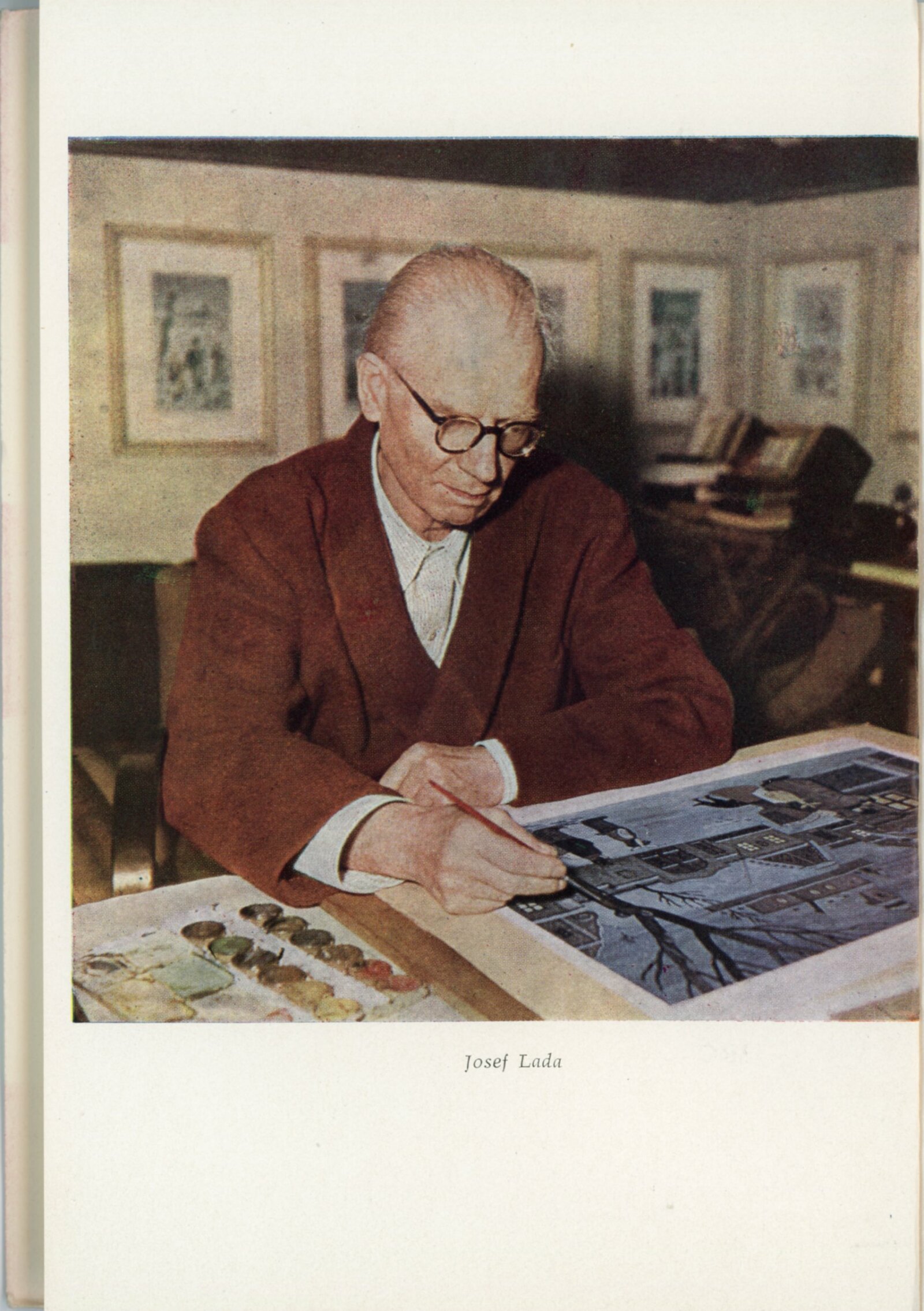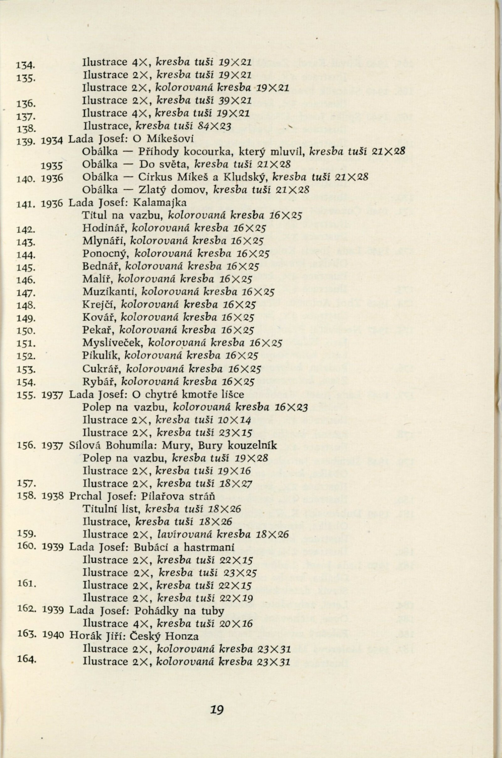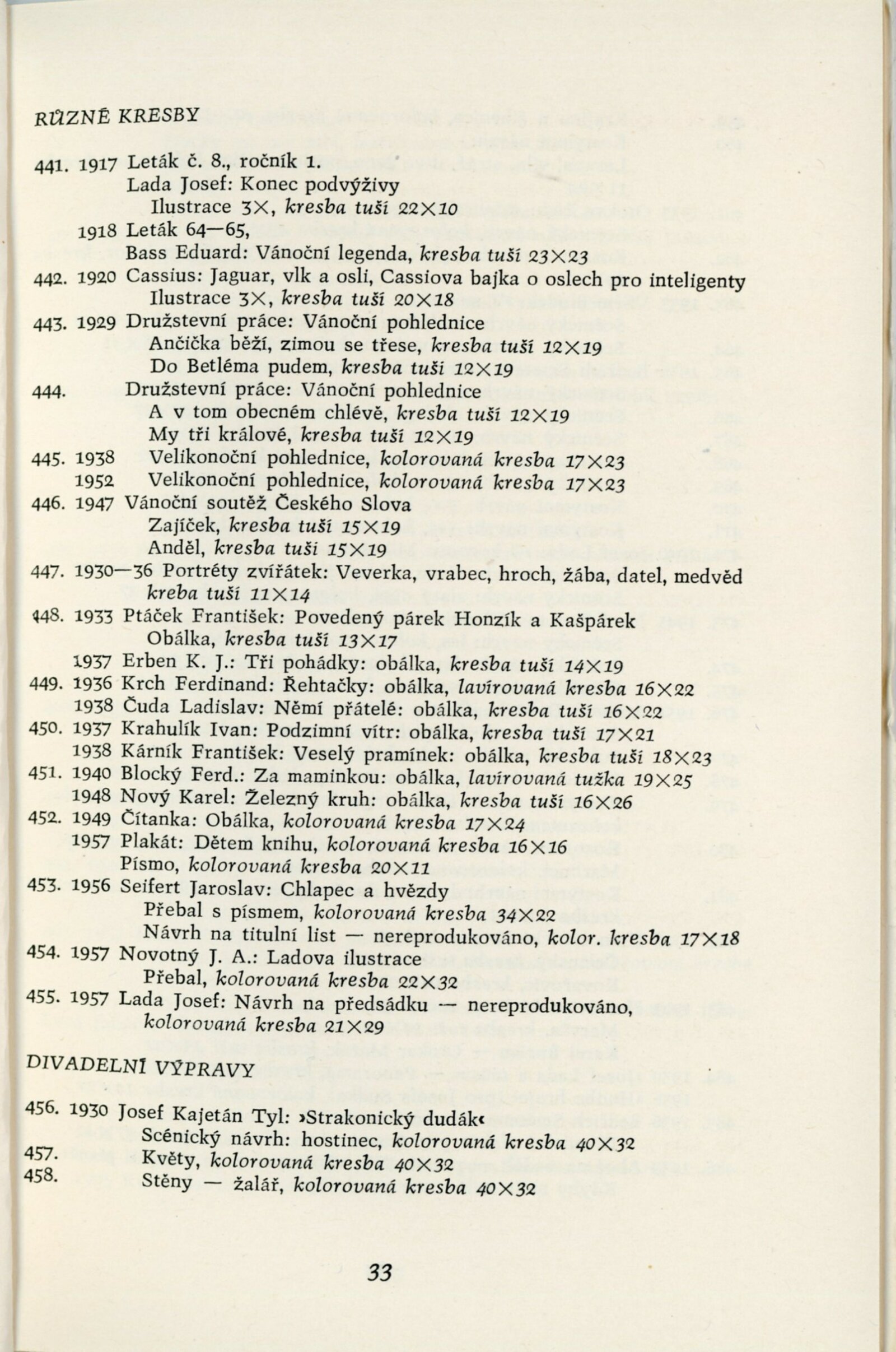 Josef Lada: Dům umění v Brně / Dům pánů z Poděbrad, 13. 4. – 18. 5. 1958 / Převzatý katalog. Národní umělec Josef Lada. Souborná výstava k jeho sedmdesátým narozeninám: Slovanský ostrov, Praha, prosinec 1957 – únor 1958 / Text: Jaromír Pečírka. – Praha: SČSVU, 1958. – 40 s., 32 s. obr. přil. 2 s. jednobar. obr. přil., báseň Ladislav Stehlík, DPK 3. – MG