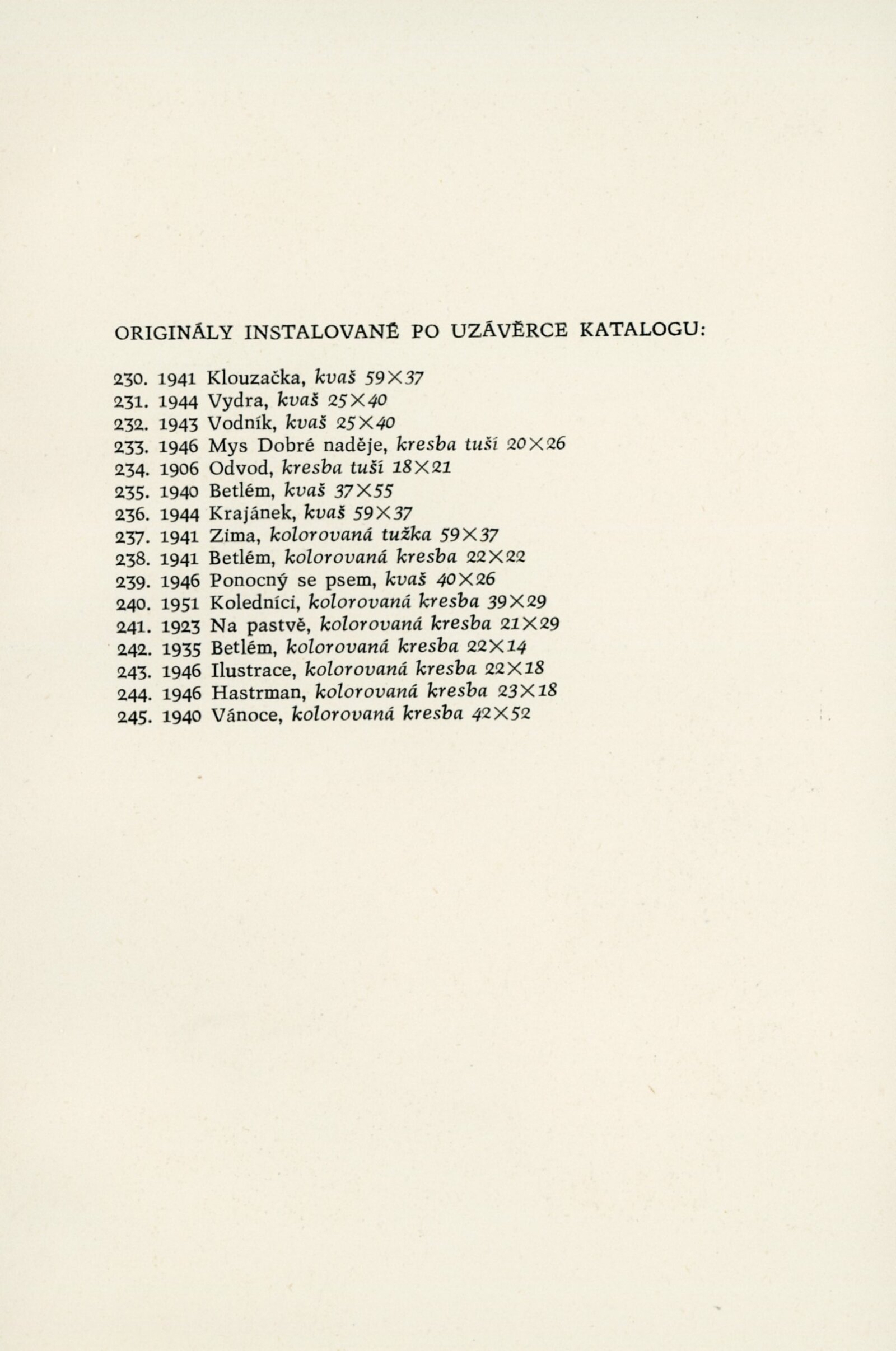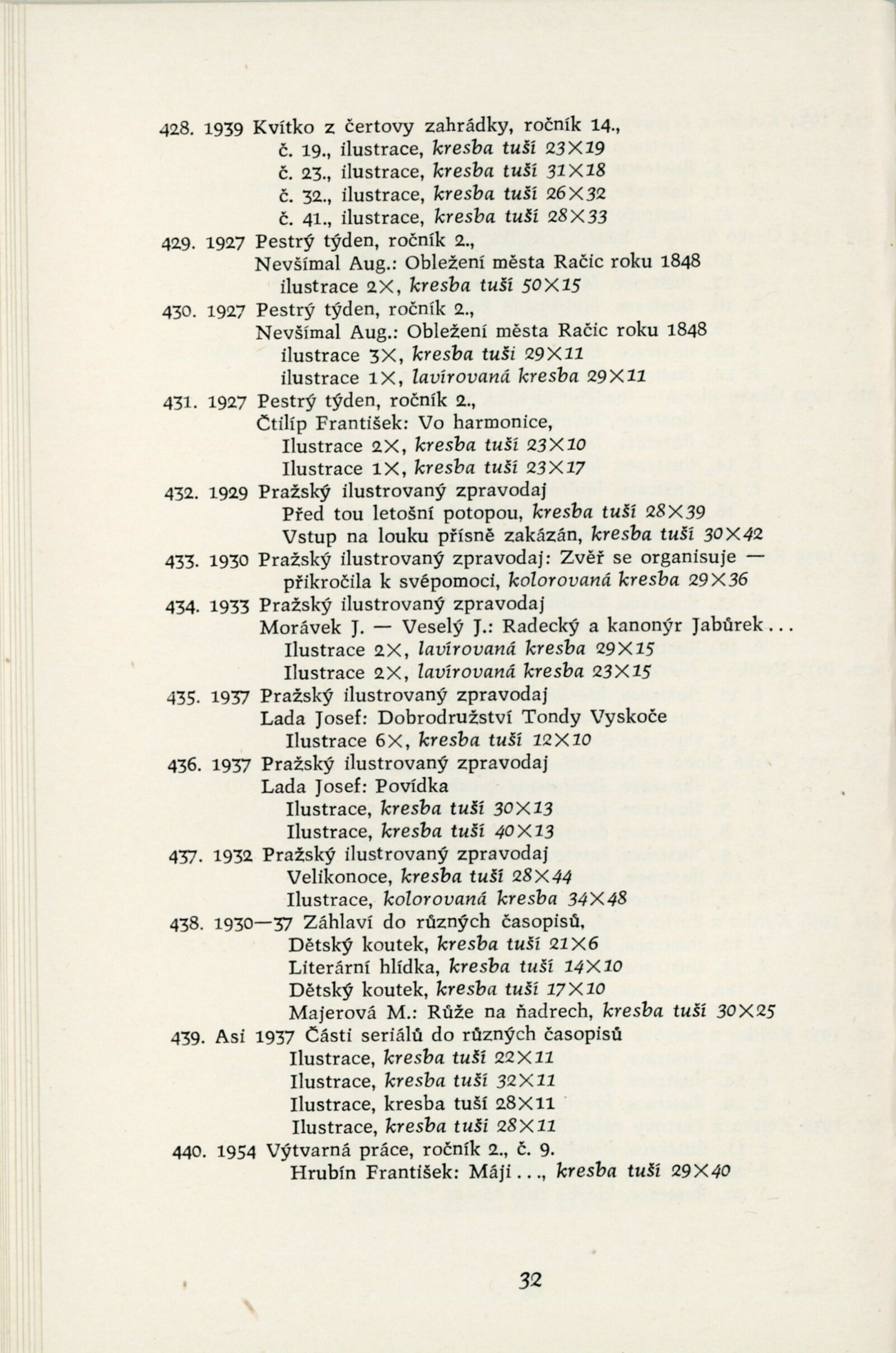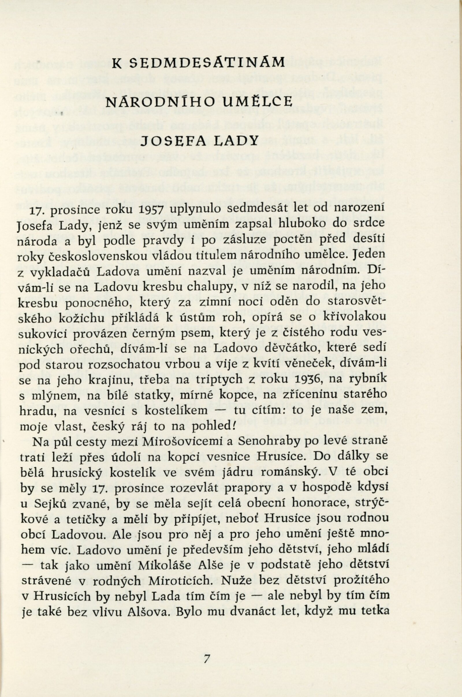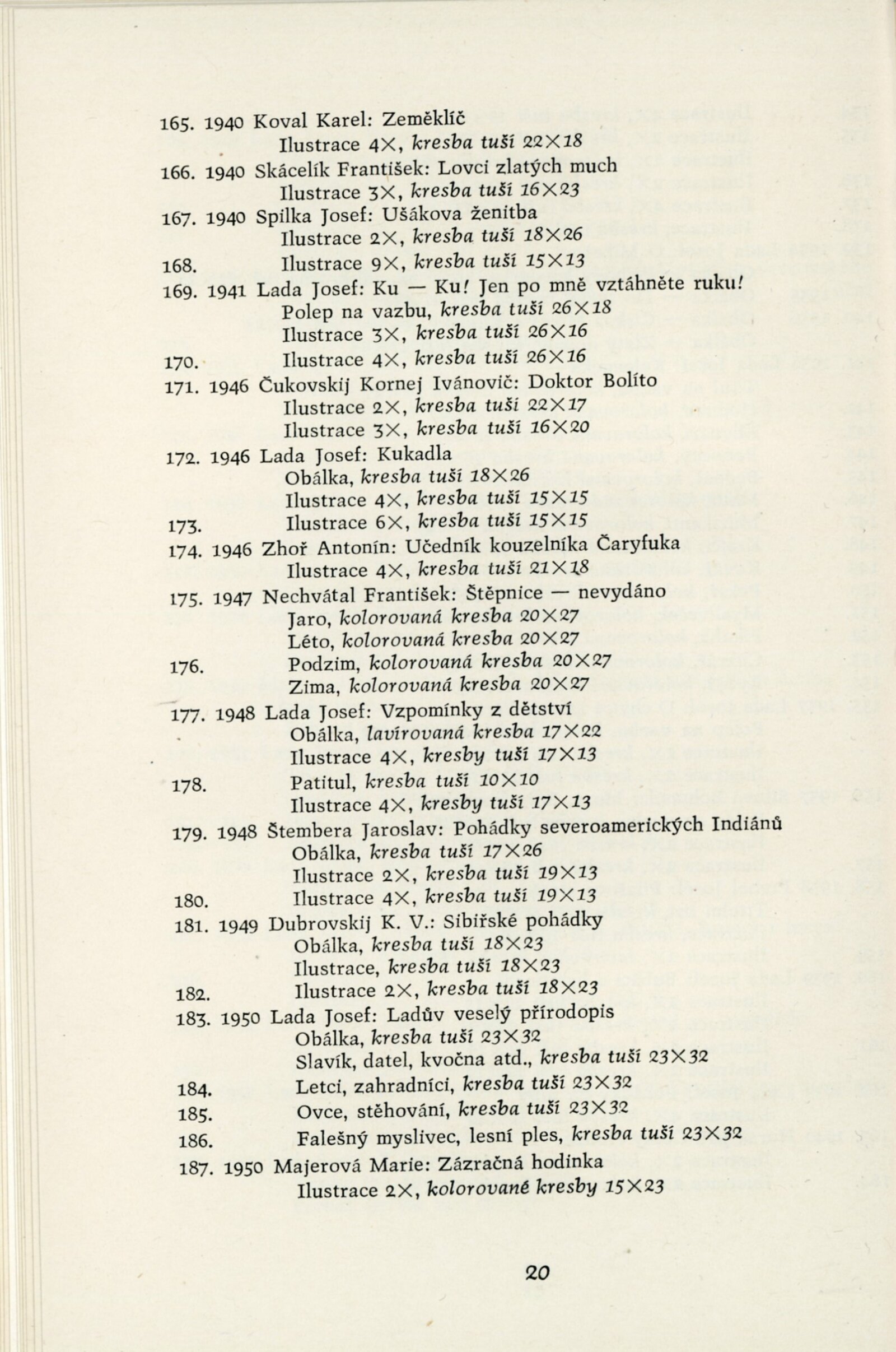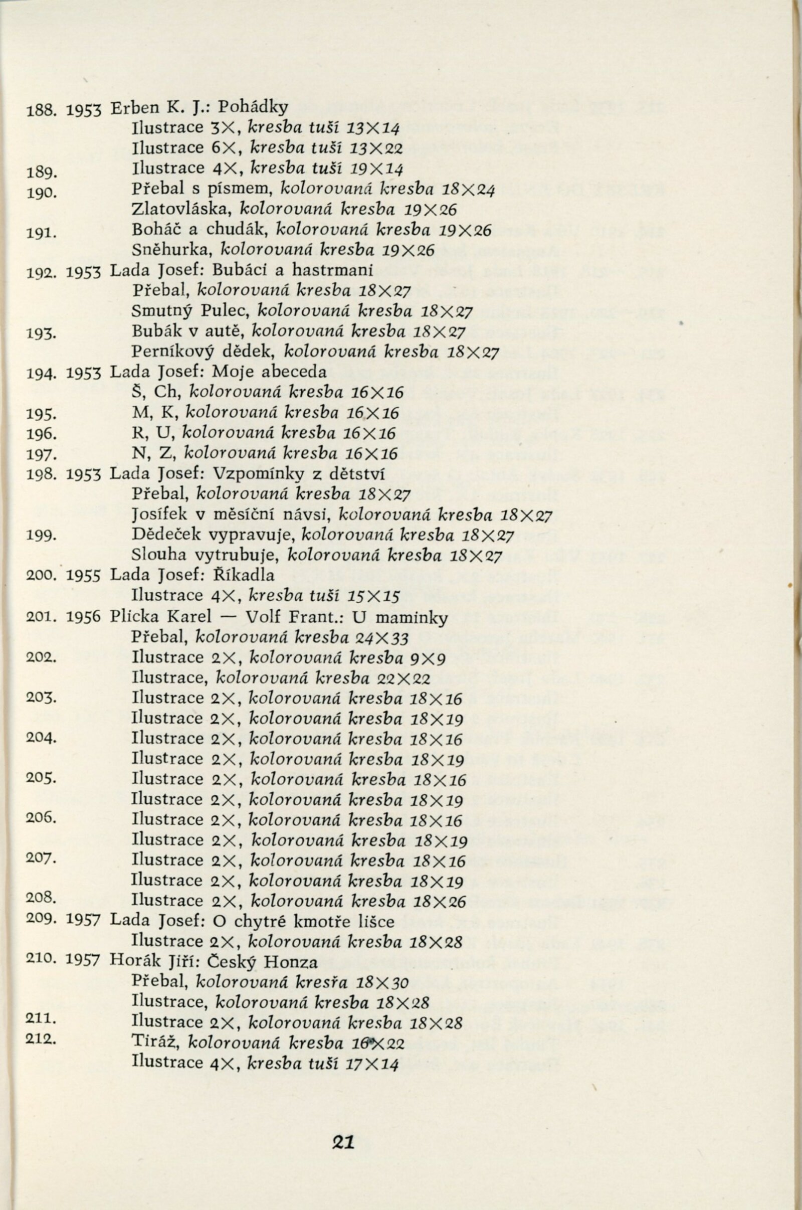 Josef Lada: Dům umění v Brně / Dům pánů z Poděbrad, 13. 4. – 18. 5. 1958 / Převzatý katalog. Národní umělec Josef Lada. Souborná výstava k jeho sedmdesátým narozeninám: Slovanský ostrov, Praha, prosinec 1957 – únor 1958 / Text: Jaromír Pečírka. – Praha: SČSVU, 1958. – 40 s., 32 s. obr. přil. 2 s. jednobar. obr. přil., báseň Ladislav Stehlík, DPK 3. – MG