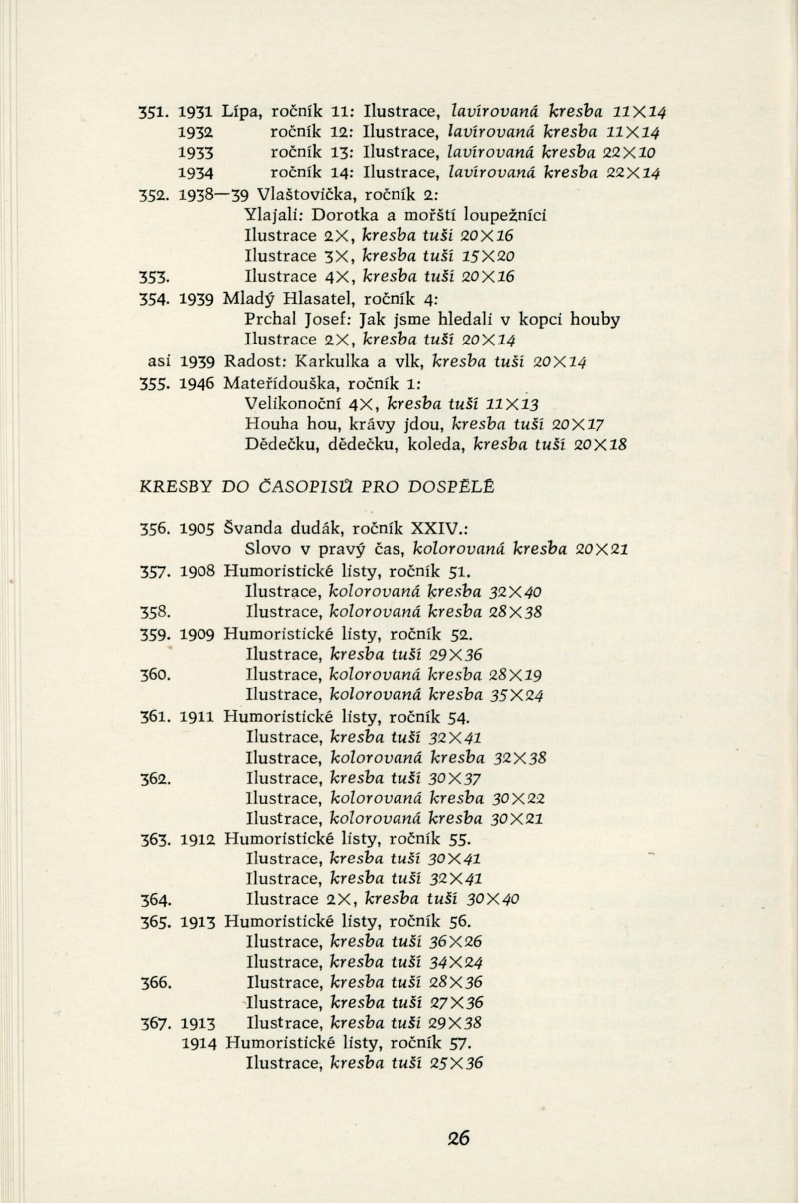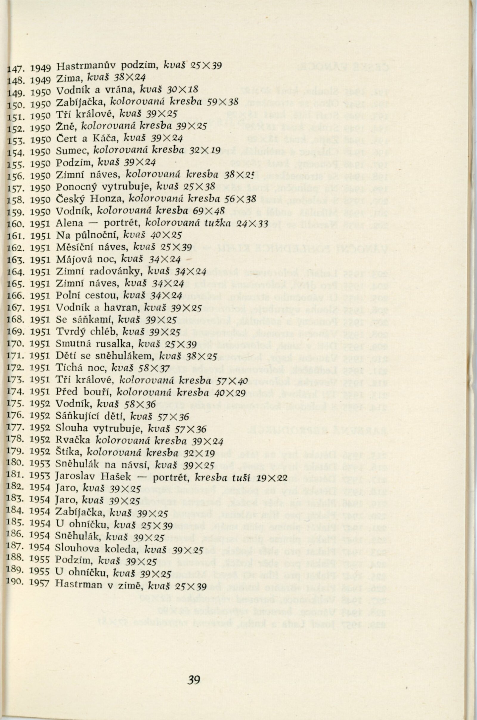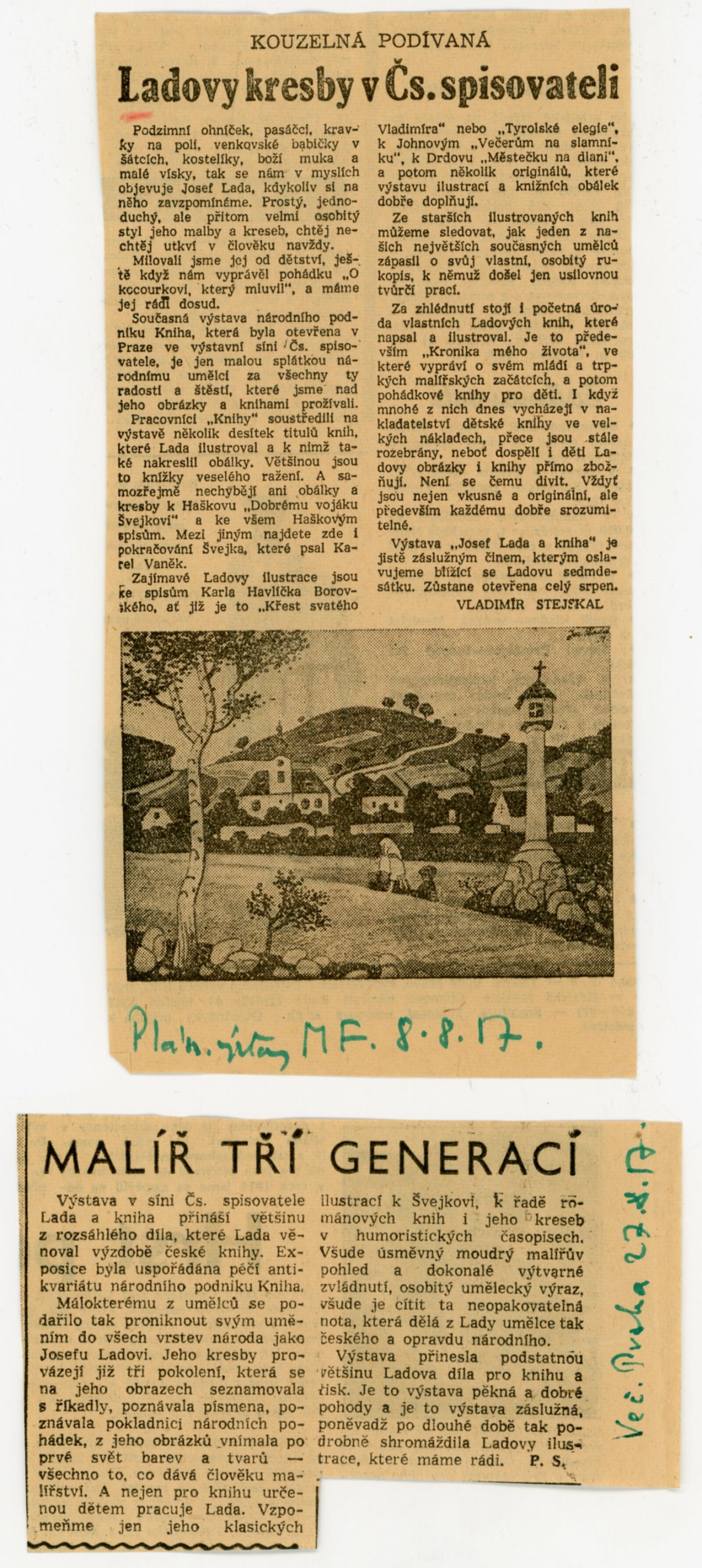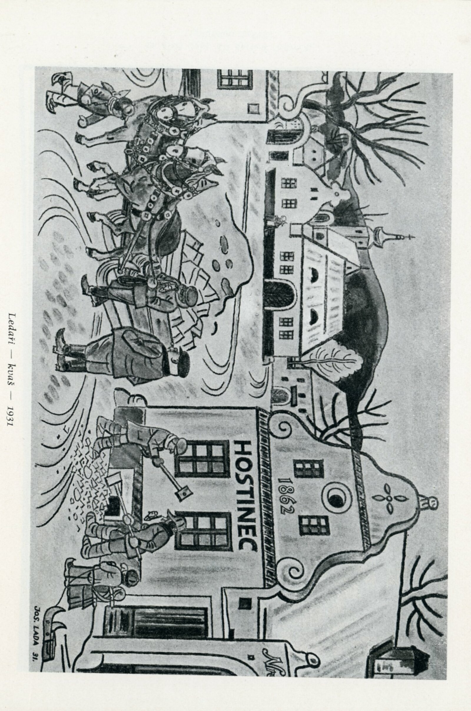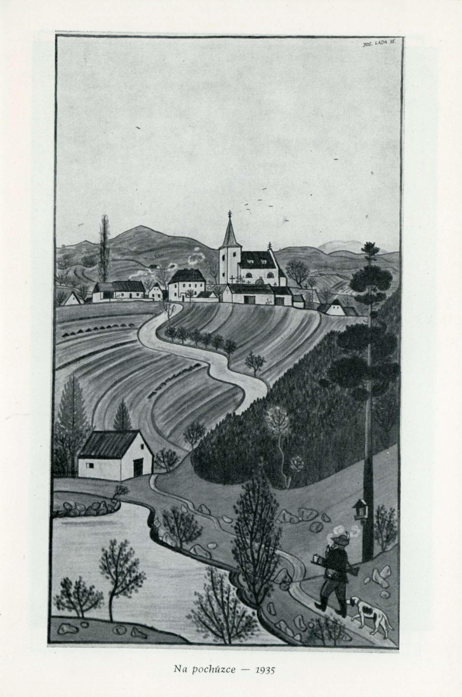 Josef Lada: Dům umění v Brně / Dům pánů z Poděbrad, 13. 4. – 18. 5. 1958 / Převzatý katalog. Národní umělec Josef Lada. Souborná výstava k jeho sedmdesátým narozeninám: Slovanský ostrov, Praha, prosinec 1957 – únor 1958 / Text: Jaromír Pečírka. – Praha: SČSVU, 1958. – 40 s., 32 s. obr. přil. 2 s. jednobar. obr. přil., báseň Ladislav Stehlík, DPK 3. – MG