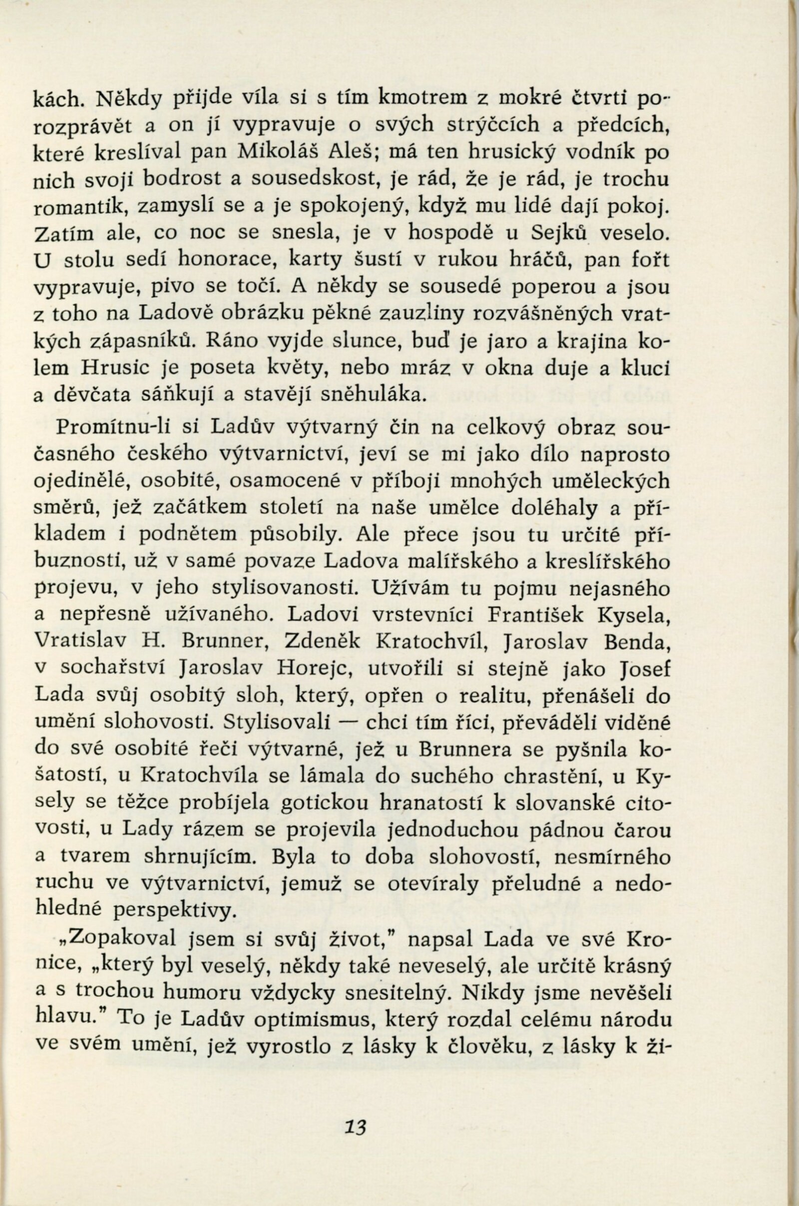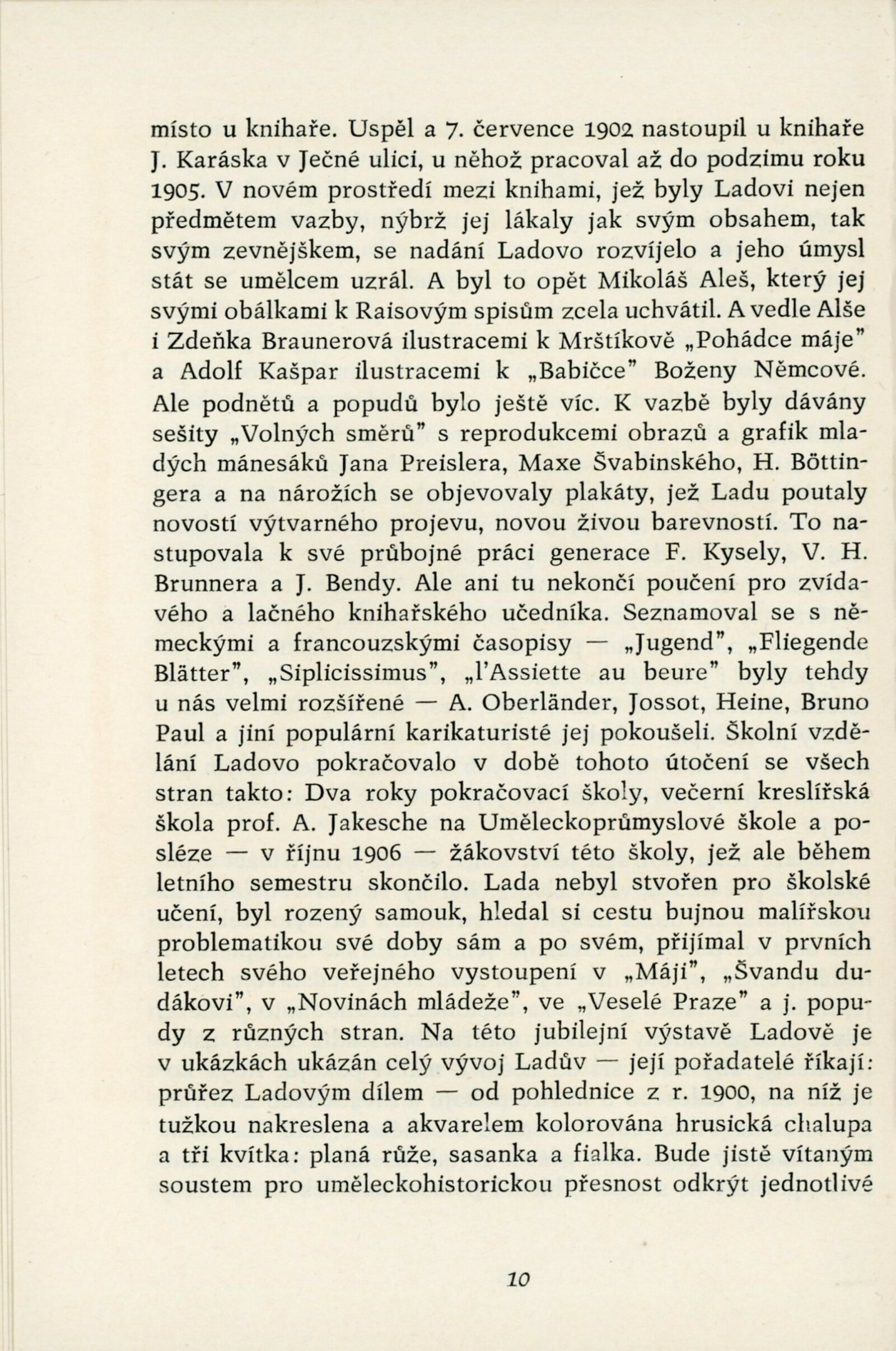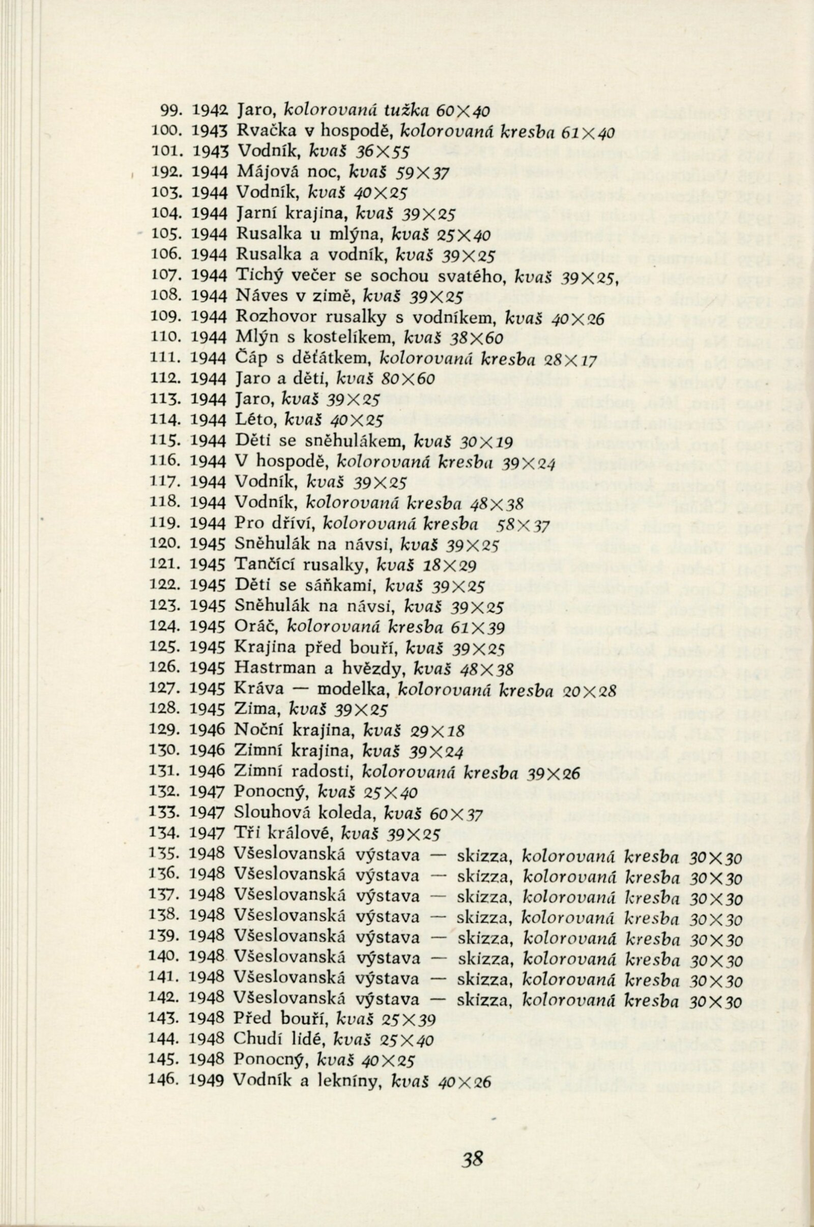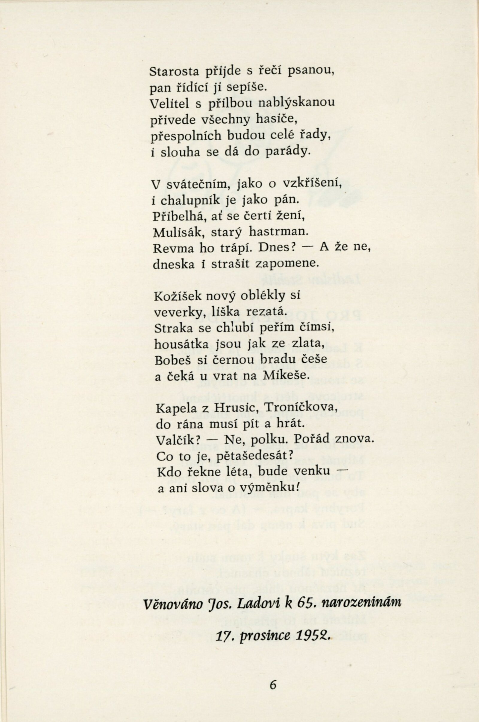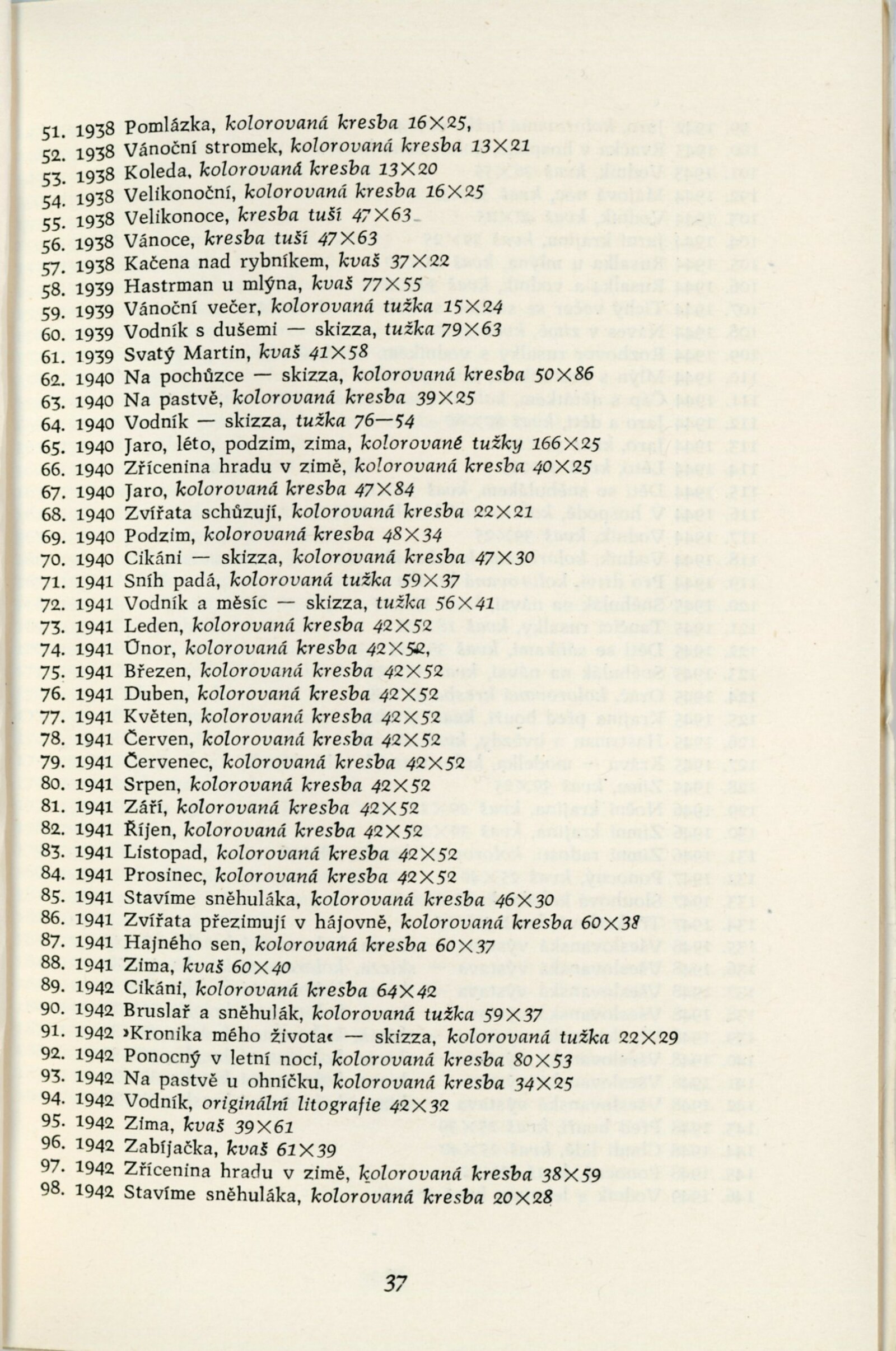 Josef Lada: Dům umění v Brně / Dům pánů z Poděbrad, 13. 4. – 18. 5. 1958 / Převzatý katalog. Národní umělec Josef Lada. Souborná výstava k jeho sedmdesátým narozeninám: Slovanský ostrov, Praha, prosinec 1957 – únor 1958 / Text: Jaromír Pečírka. – Praha: SČSVU, 1958. – 40 s., 32 s. obr. přil. 2 s. jednobar. obr. přil., báseň Ladislav Stehlík, DPK 3. – MG