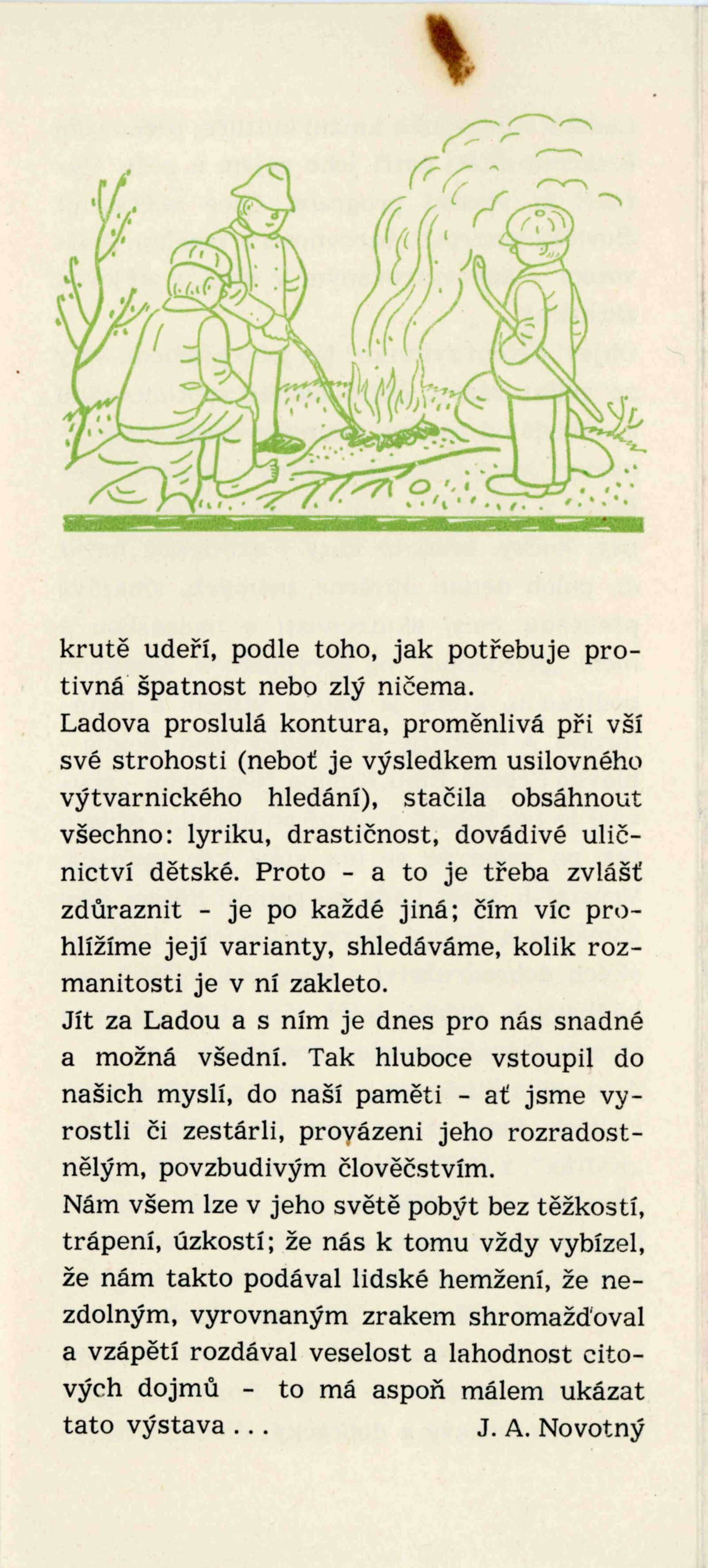 Díla vybral, uspořádal a sepsal Jan Vrána. Instalaci navrhl a provedl Josef Brož, výstavu zahájila Linka Procházková. Promluvili Ladův tajemník Jan Vrána a Igor Zhoř.
