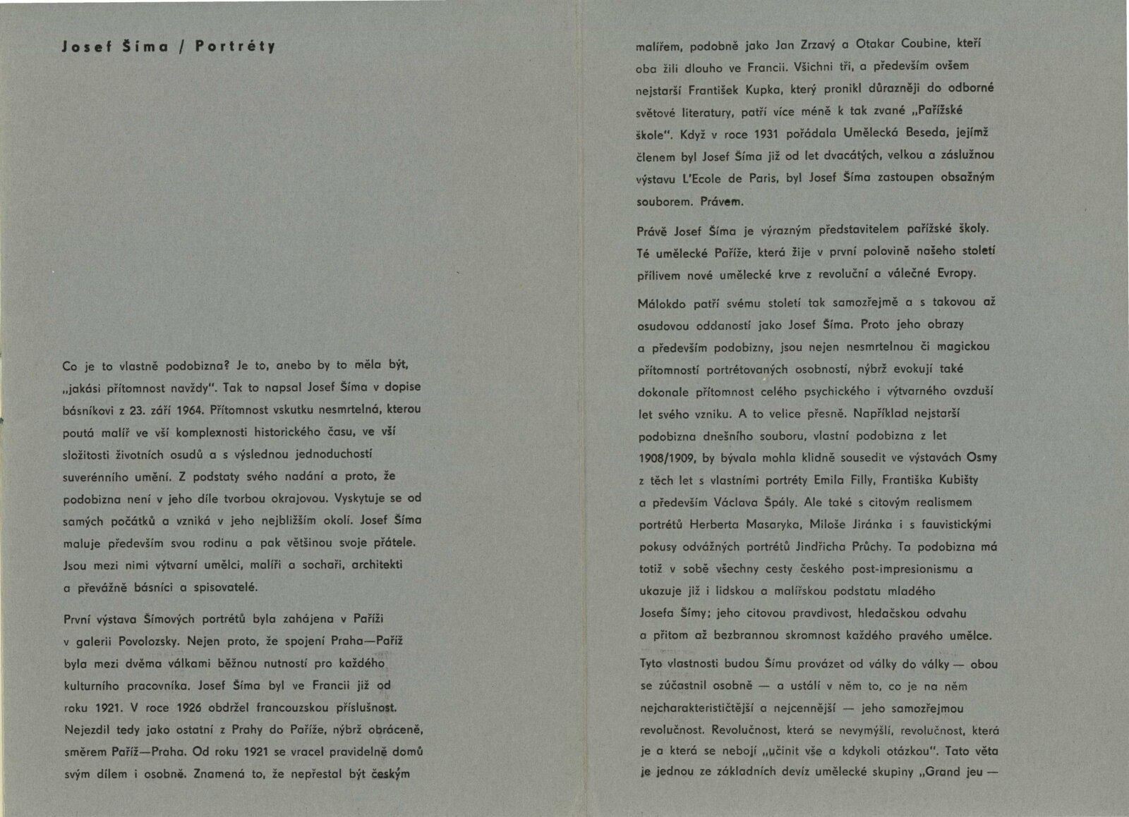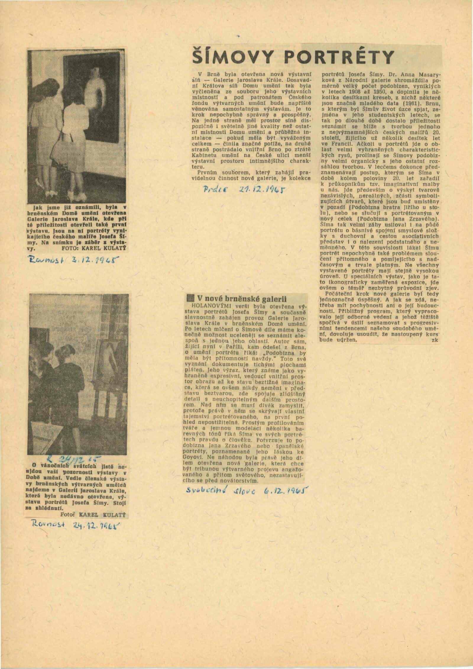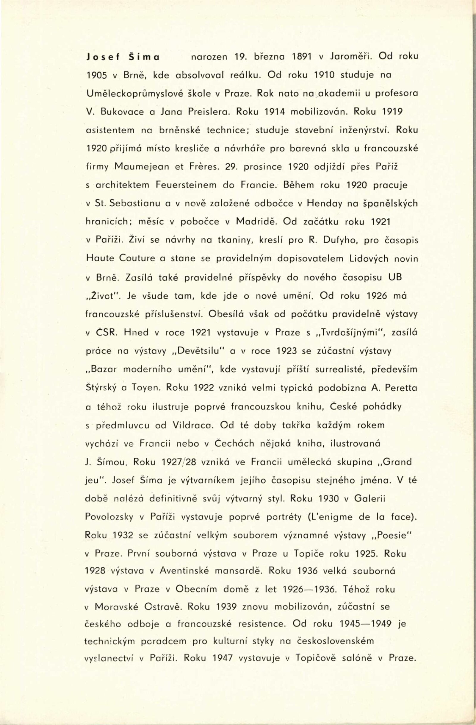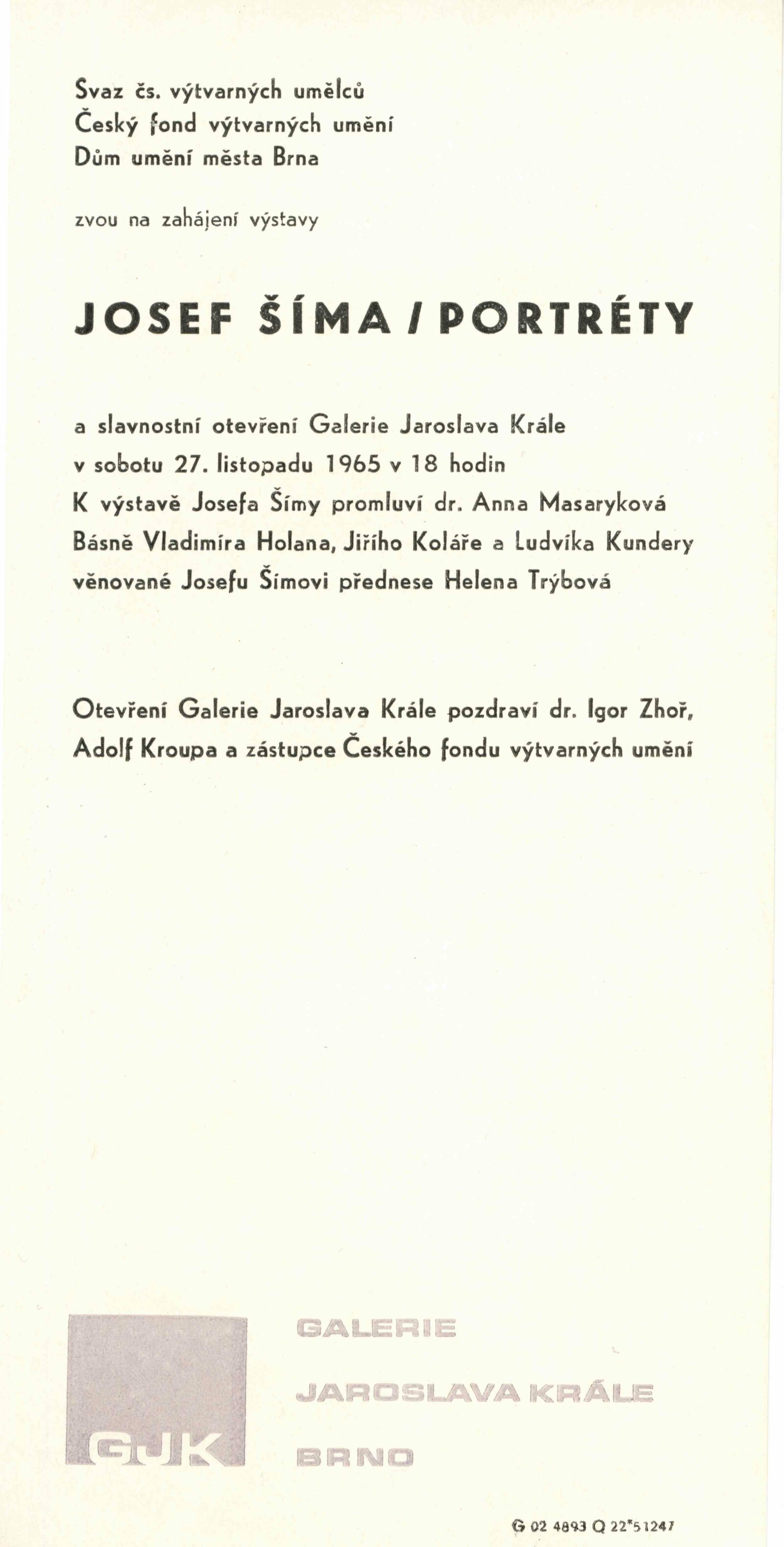 Josef Šíma. Portréty: Dům umění, Galerie Jaroslava Krále, 27. 11. 1965 – 3. 1. 1966 / Text: Anna Fárová. – Brno: ČFVU, 1965. – 18 s., obr., životopis, DU 448. – MZK; MG; MMB