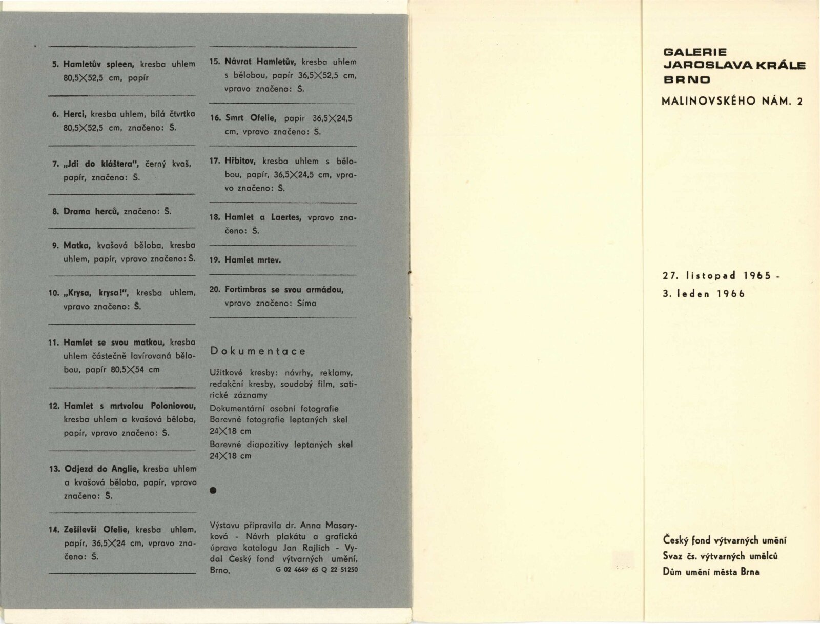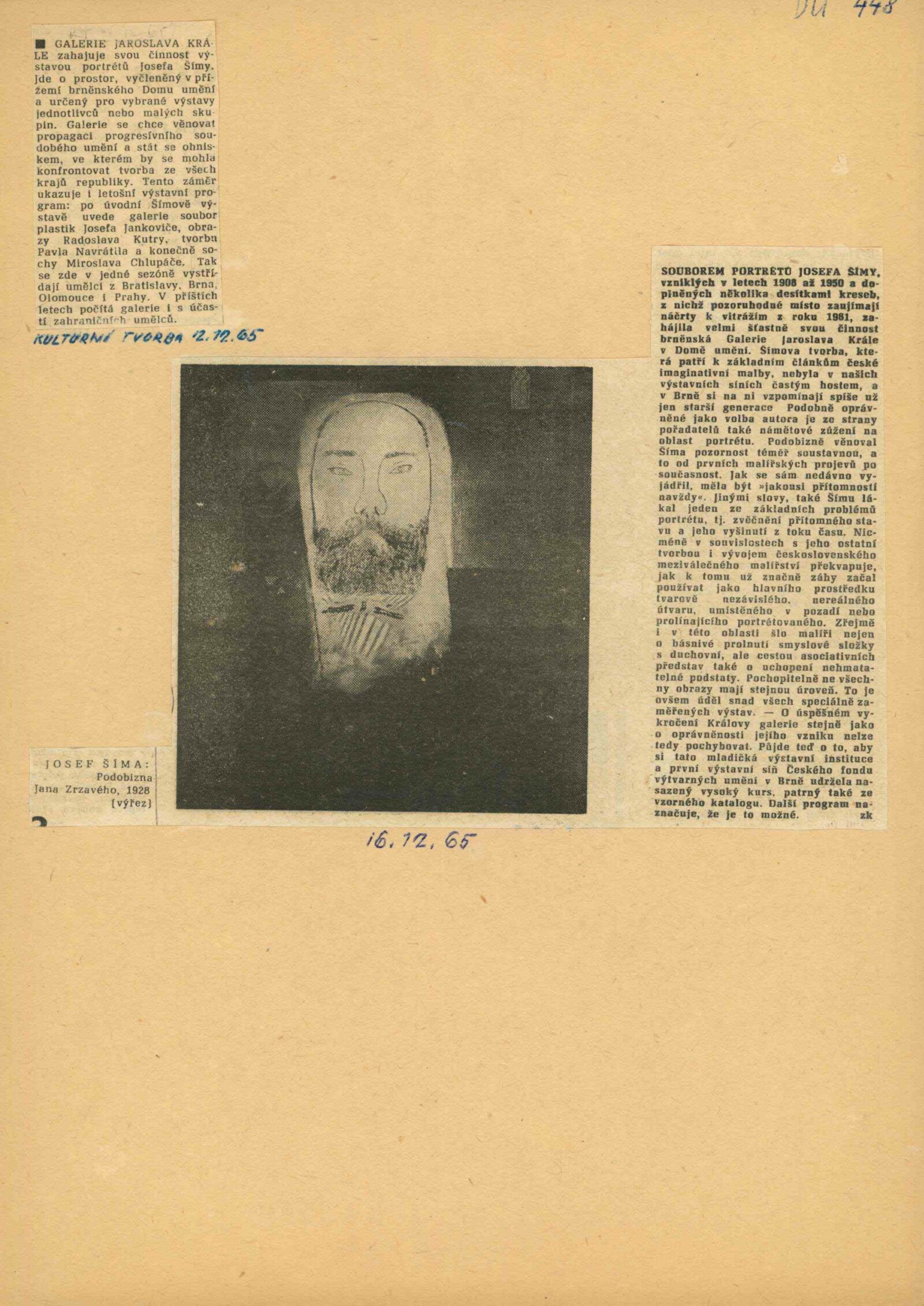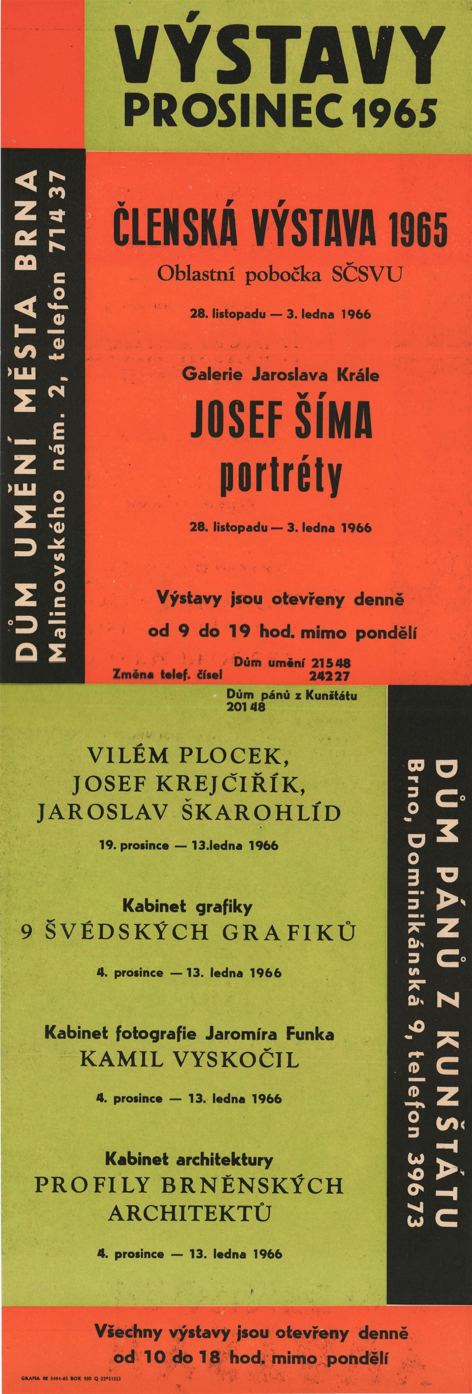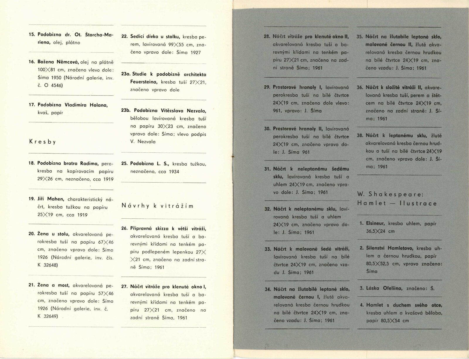Josef Šíma. Portréty: Dům umění, Galerie Jaroslava Krále, 27. 11. 1965 – 3. 1. 1966 / Text: Anna Fárová. – Brno: ČFVU, 1965. – 18 s., obr., životopis, DU 448. – MZK; MG; MMB