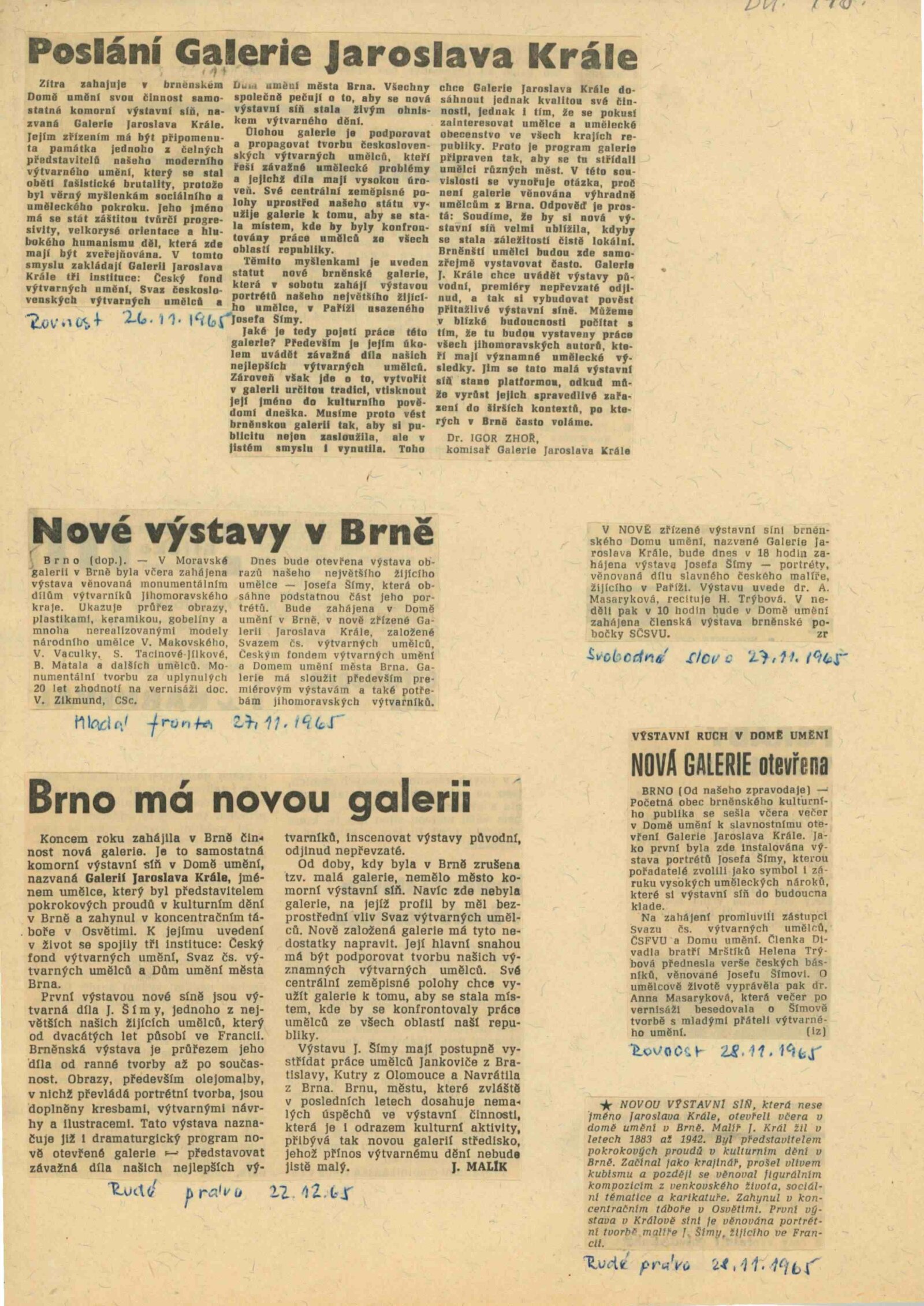 Byla zahájena činnost Galerie Jaroslava Krále. Pořadateli výstavy se stali ČFVU, SČVU a Dům umění. V rámci slavnostního otevření pozdravili Igor Zhoř a Adolf Kroupa.