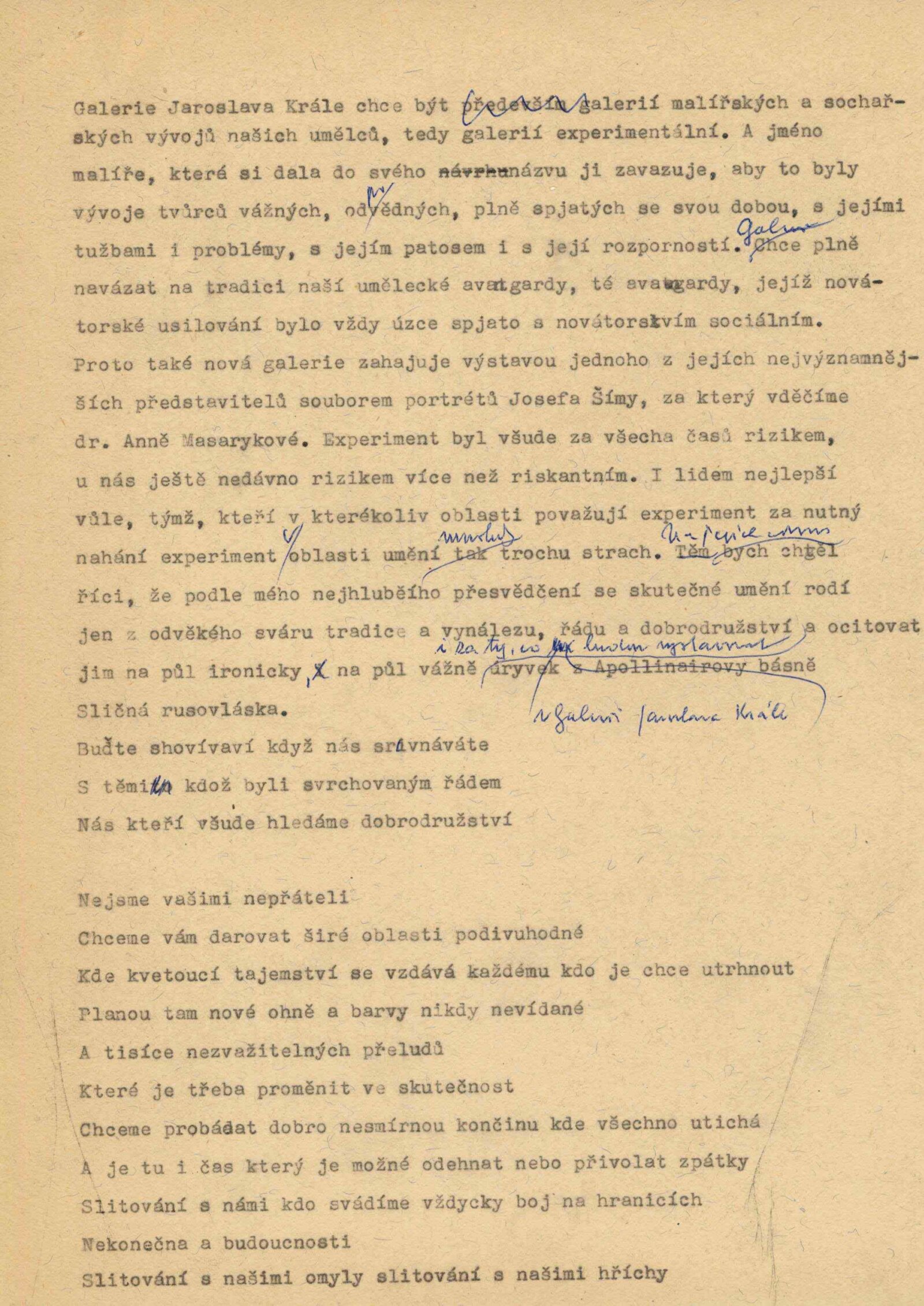 pozvánka, pozvánka na slavnostní otevření GJK, katalog, karta, měsíční plakát (DU + DPK), proslov Anny Masarykové při zahájení, texty o Josefu Šímovi, úvod při zahájení činnosti GJK (Adolf Kroupa a Igor Zhoř), adresy majitelů, seznam vystavených děl, fotografie děl, z vernisáže, korespondence (pohledy a dopisy od Anny Masarykové, korespondence o převzetí děl), reverzy, recenze a zprávy o otevření GJK, digitalizovaný videozáznam ČT - záběry z výstav 1963-1969