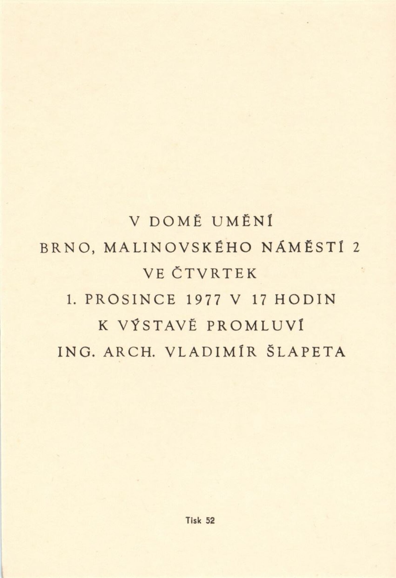 pozvánka, katalog, seznam děl, zápis z jednání s Vladimírem Šlapetou o možnosti realizace výstavy, korespondence (Vladimír Šlapeta, Národní technické muzeum), recenze v tisku