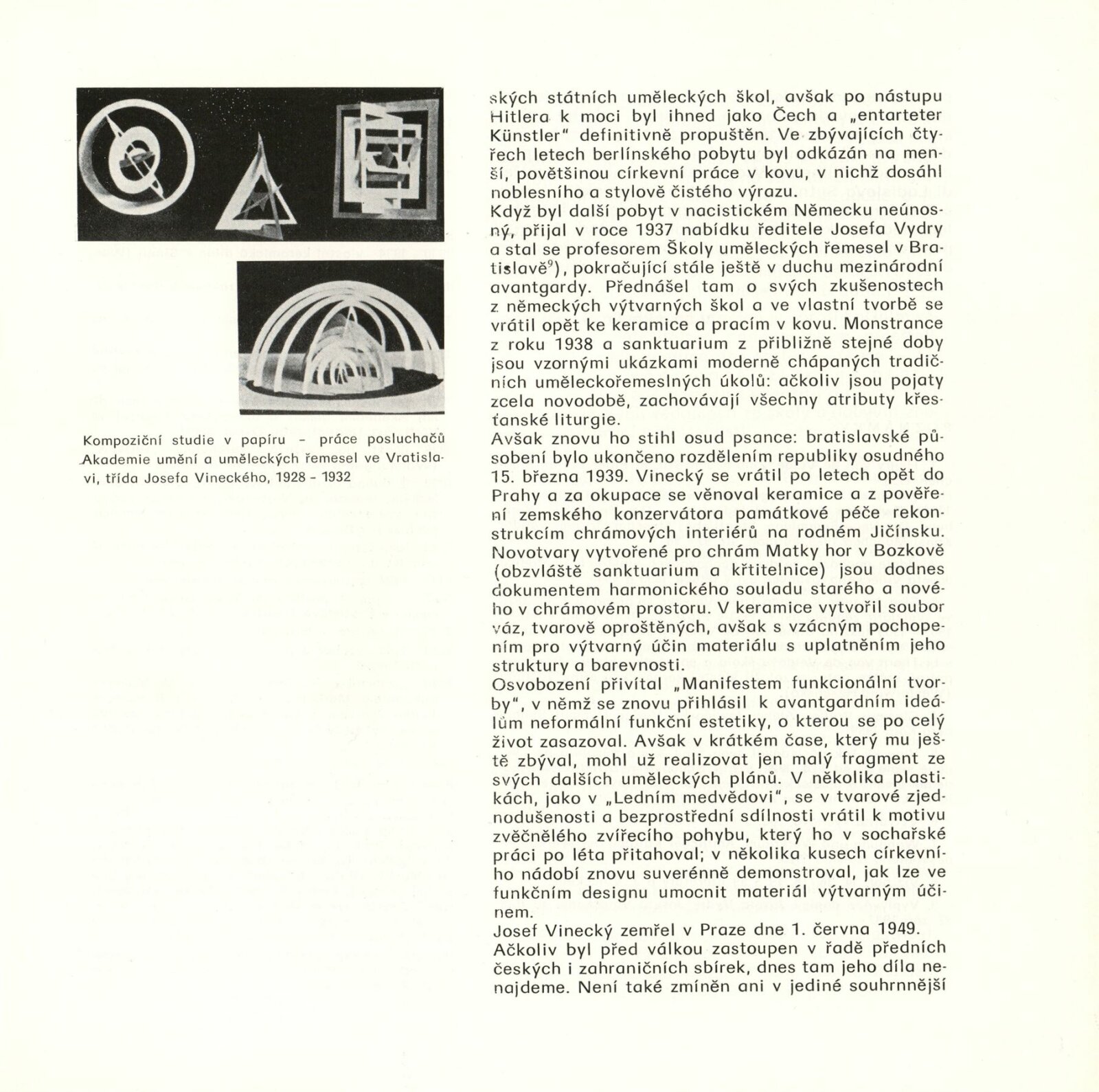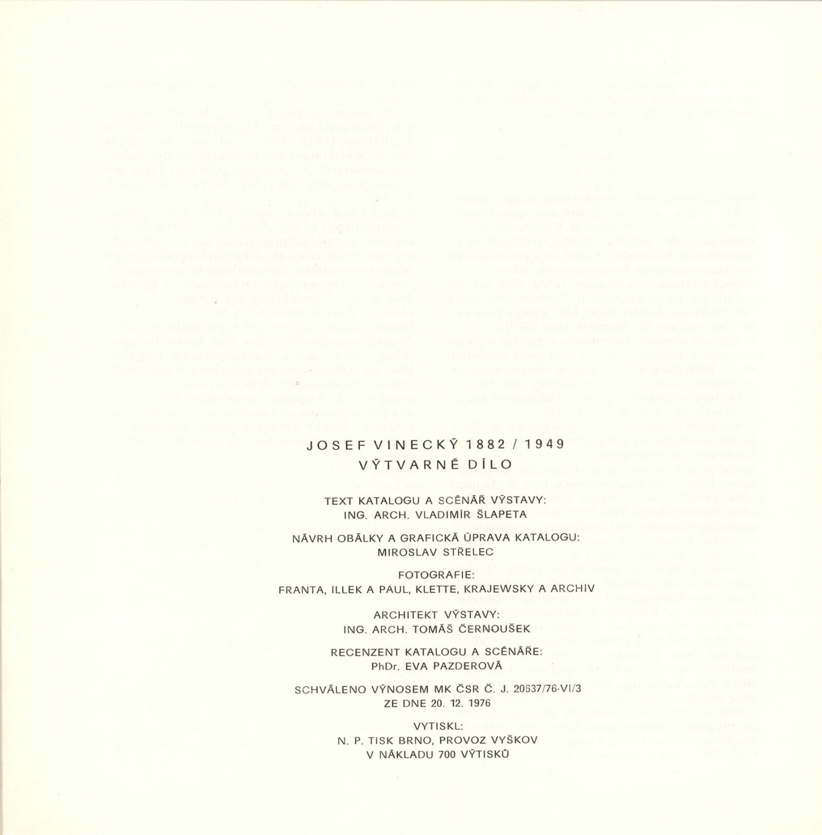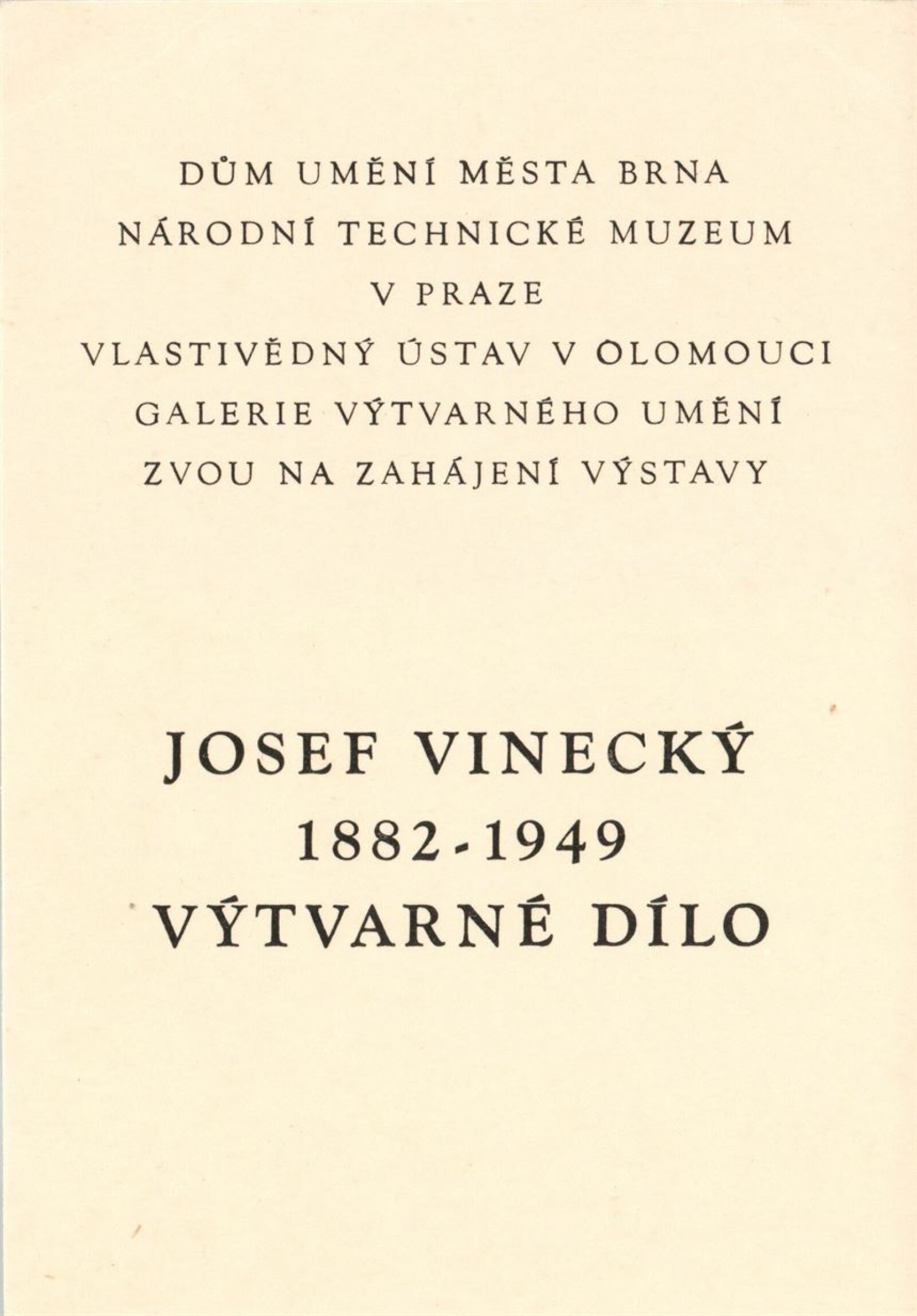Josef Vinecký 1882–1949. Výtvarné dílo: Dům umění města Brna, hala, listopad 1977 (spr. 1. 12.) – 9. 1. 1978 / Text: Vladimír Šlapeta a autor. – Olomouc: Vlastivědný ústav, 1977. – 38 s., obr., portrét, životní data, bibliografie, soupis výtvarného díla, DU 665. – MZK; MG; MMB
