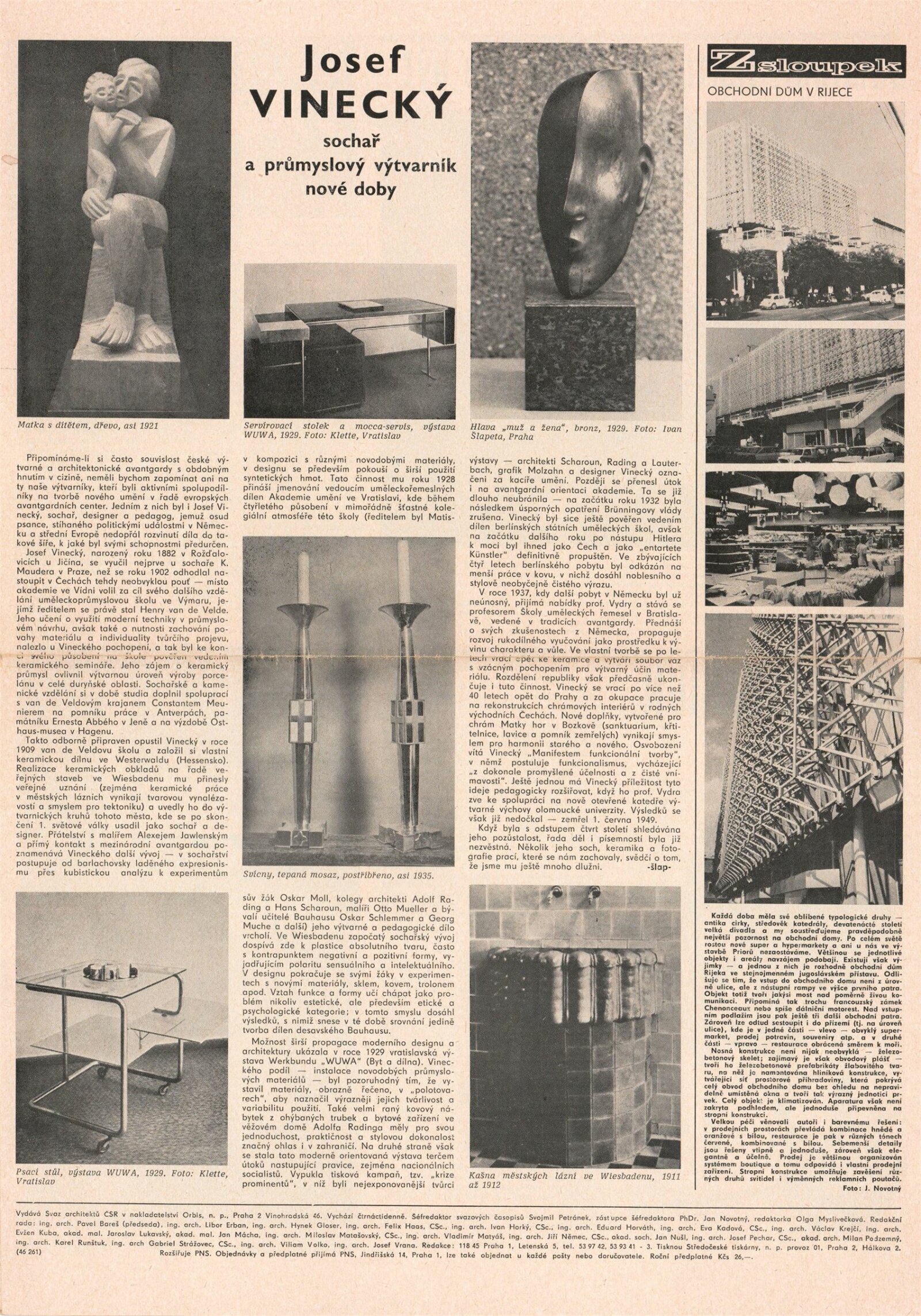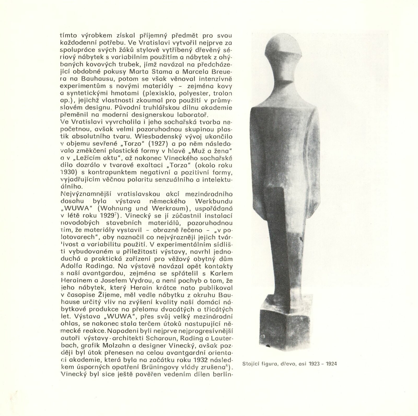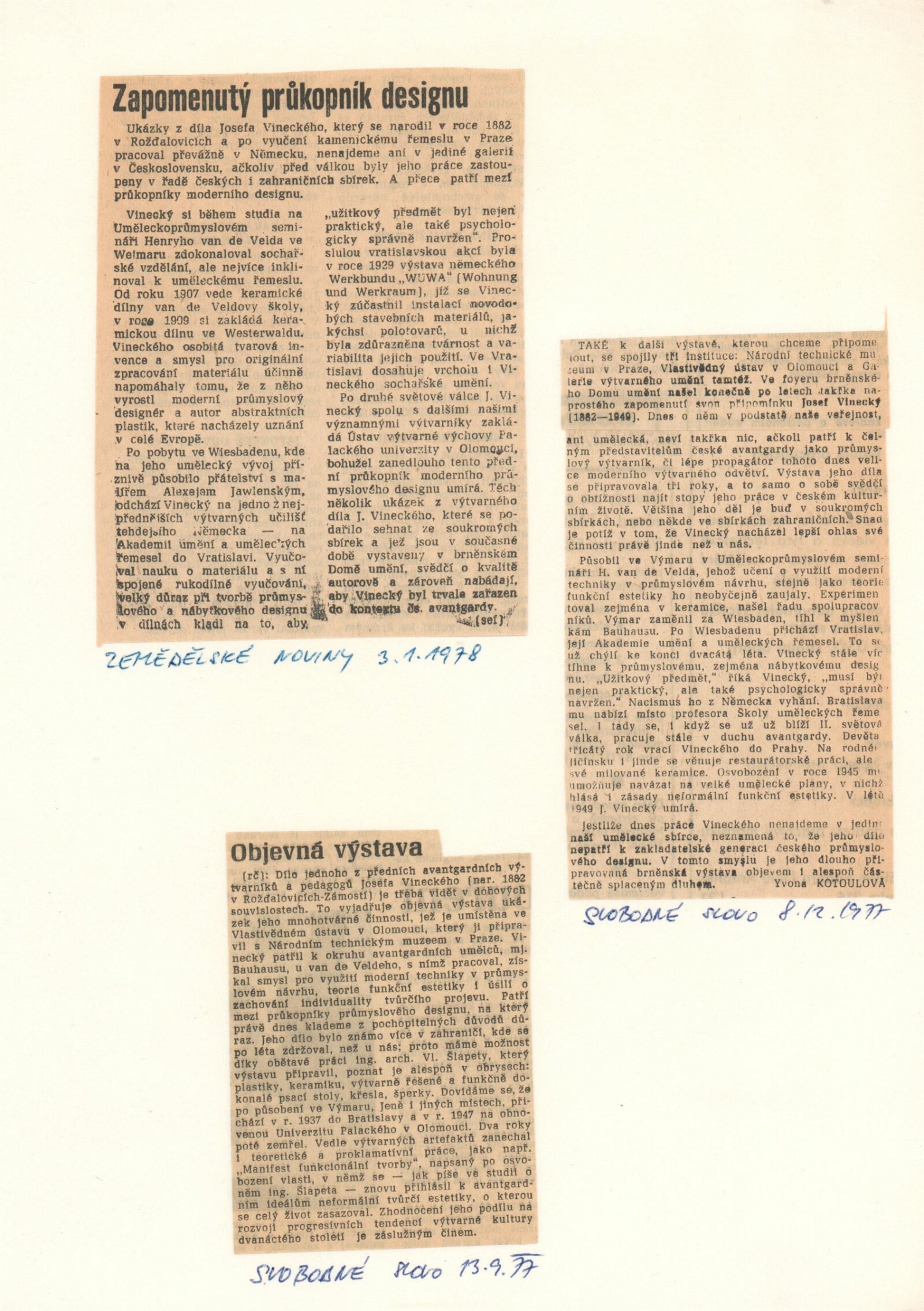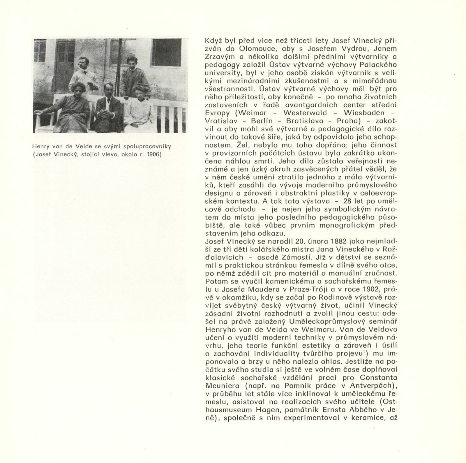Josef Vinecký 1882–1949. Výtvarné dílo: Dům umění města Brna, hala, listopad 1977 (spr. 1. 12.) – 9. 1. 1978 / Text: Vladimír Šlapeta a autor. – Olomouc: Vlastivědný ústav, 1977. – 38 s., obr., portrét, životní data, bibliografie, soupis výtvarného díla, DU 665. – MZK; MG; MMB