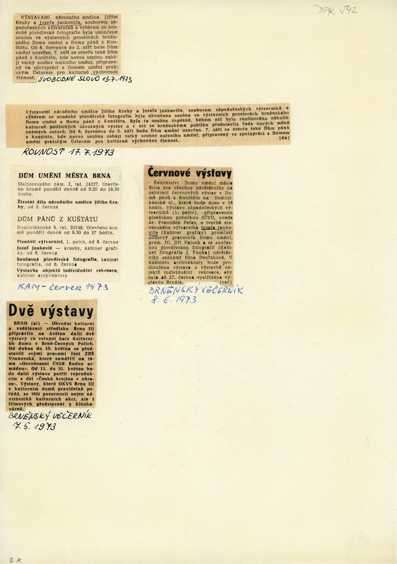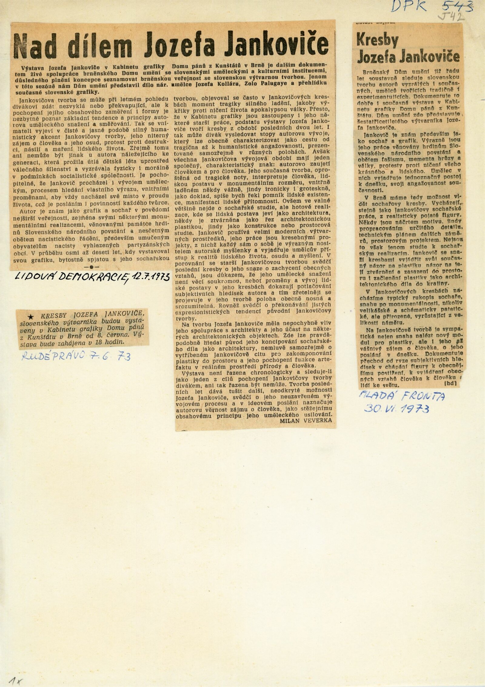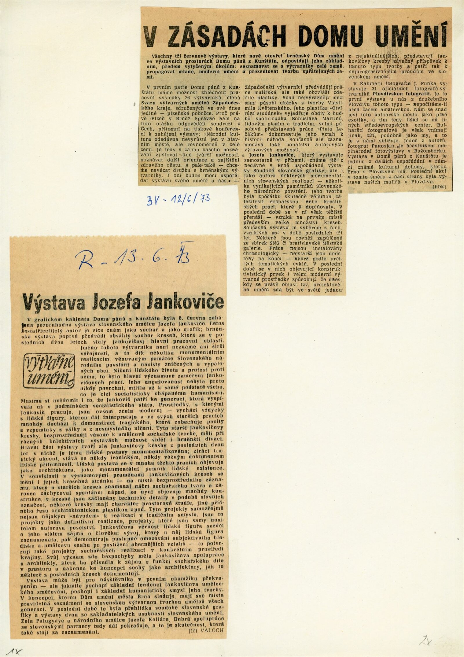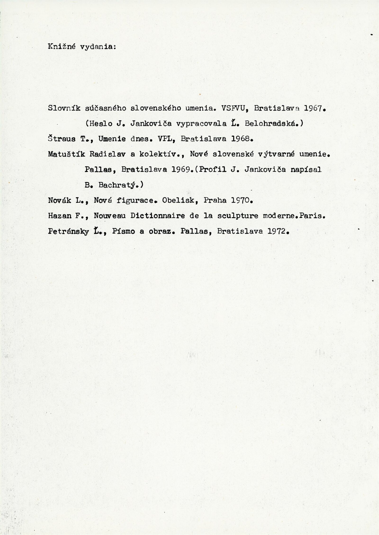 Jozef Jankovič. Kresby: Dům umění / Dům pánů z Kunštátu, 135. výstava Kabinetu grafiky, 8. 6. – 8. 7. 1973 / Texty: Jiří Valoch, Ľudo Petránsky. – B. m. n., 1973. – 26 l., 23 l. bar. obr. příl., životní data, výstavy, bibliografie, DPK 542. – MZK; MG