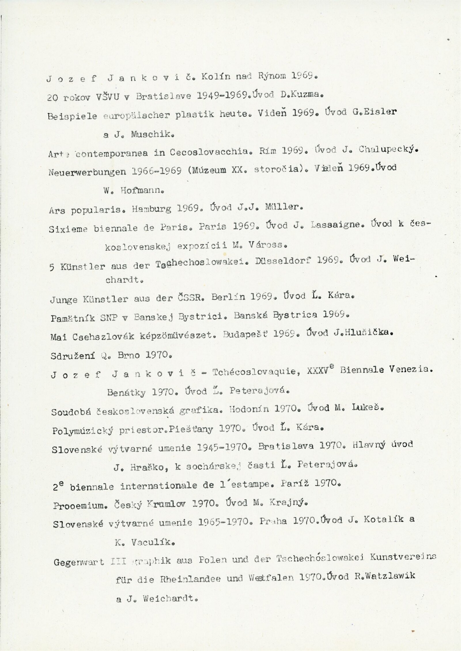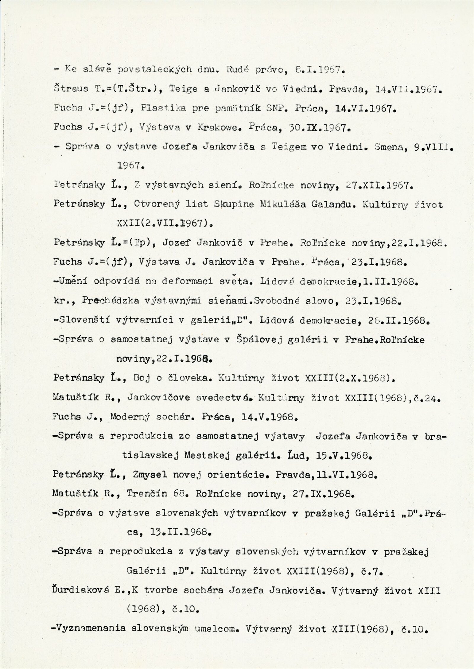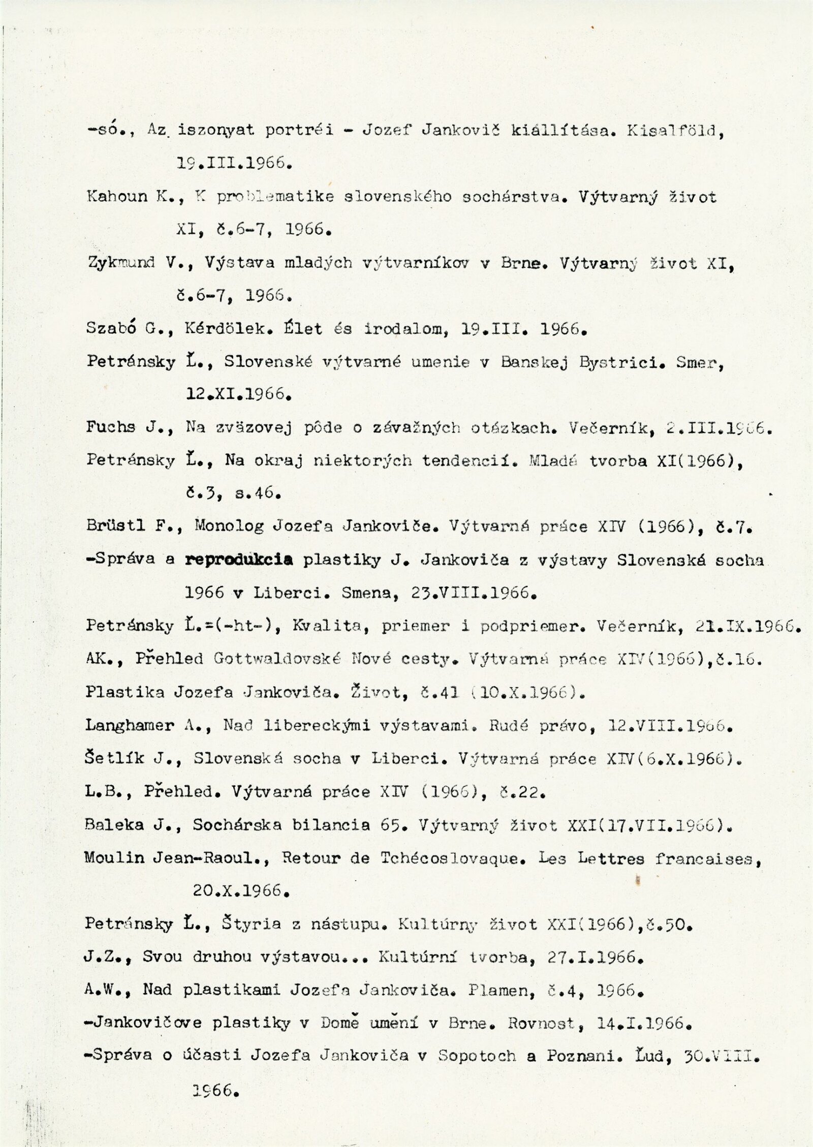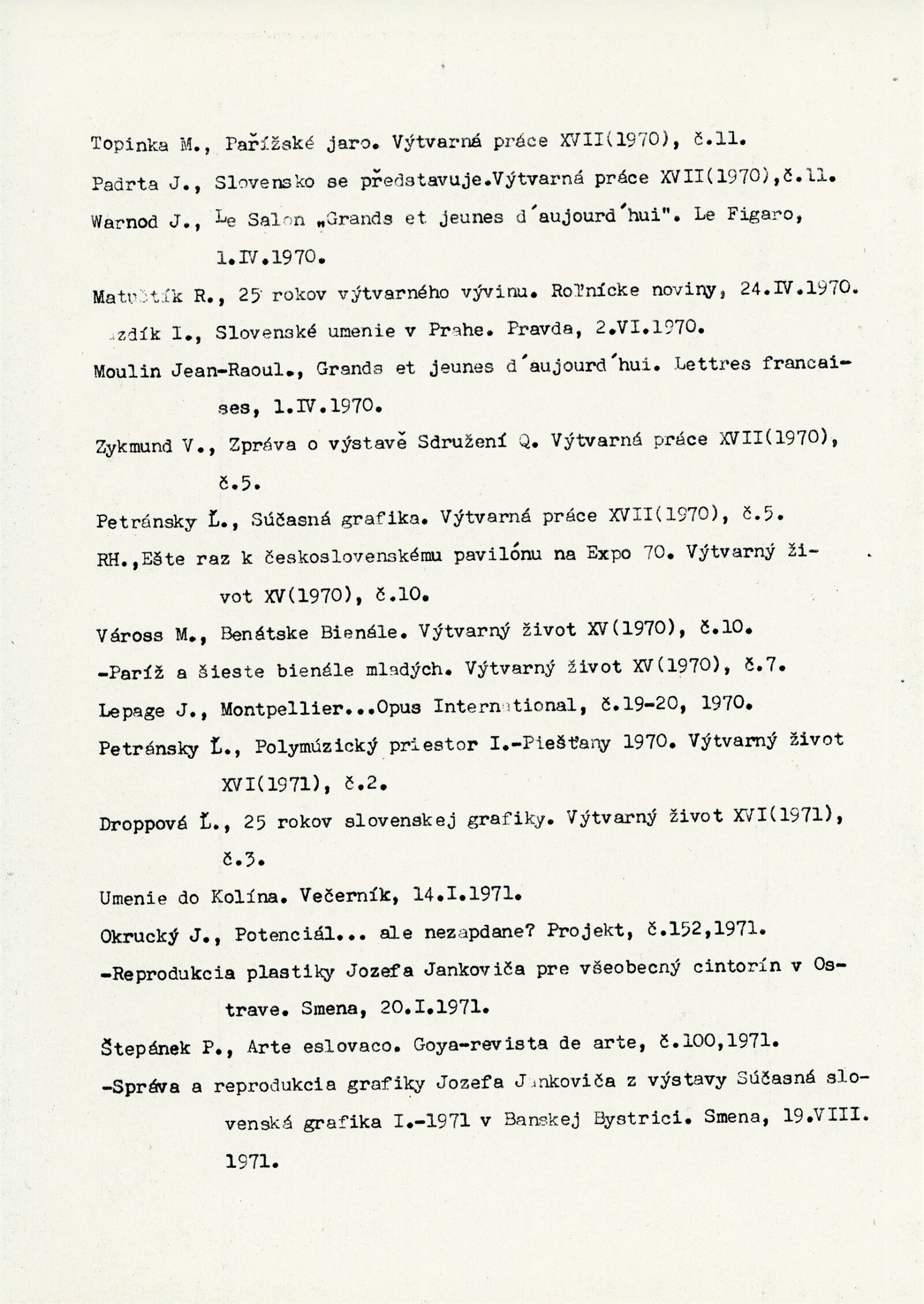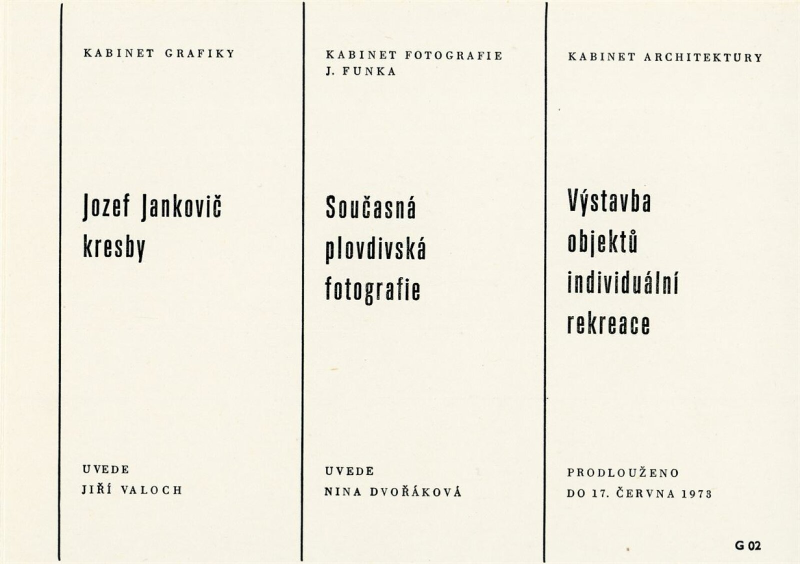 Jozef Jankovič. Kresby: Dům umění / Dům pánů z Kunštátu, 135. výstava Kabinetu grafiky, 8. 6. – 8. 7. 1973 / Texty: Jiří Valoch, Ľudo Petránsky. – B. m. n., 1973. – 26 l., 23 l. bar. obr. příl., životní data, výstavy, bibliografie, DPK 542. – MZK; MG