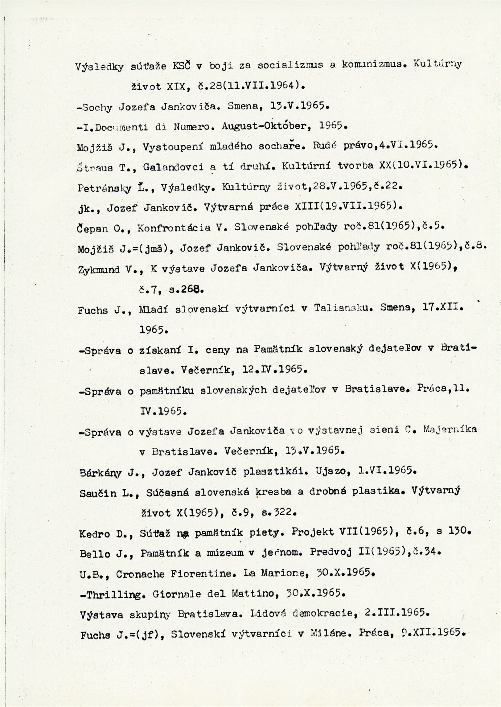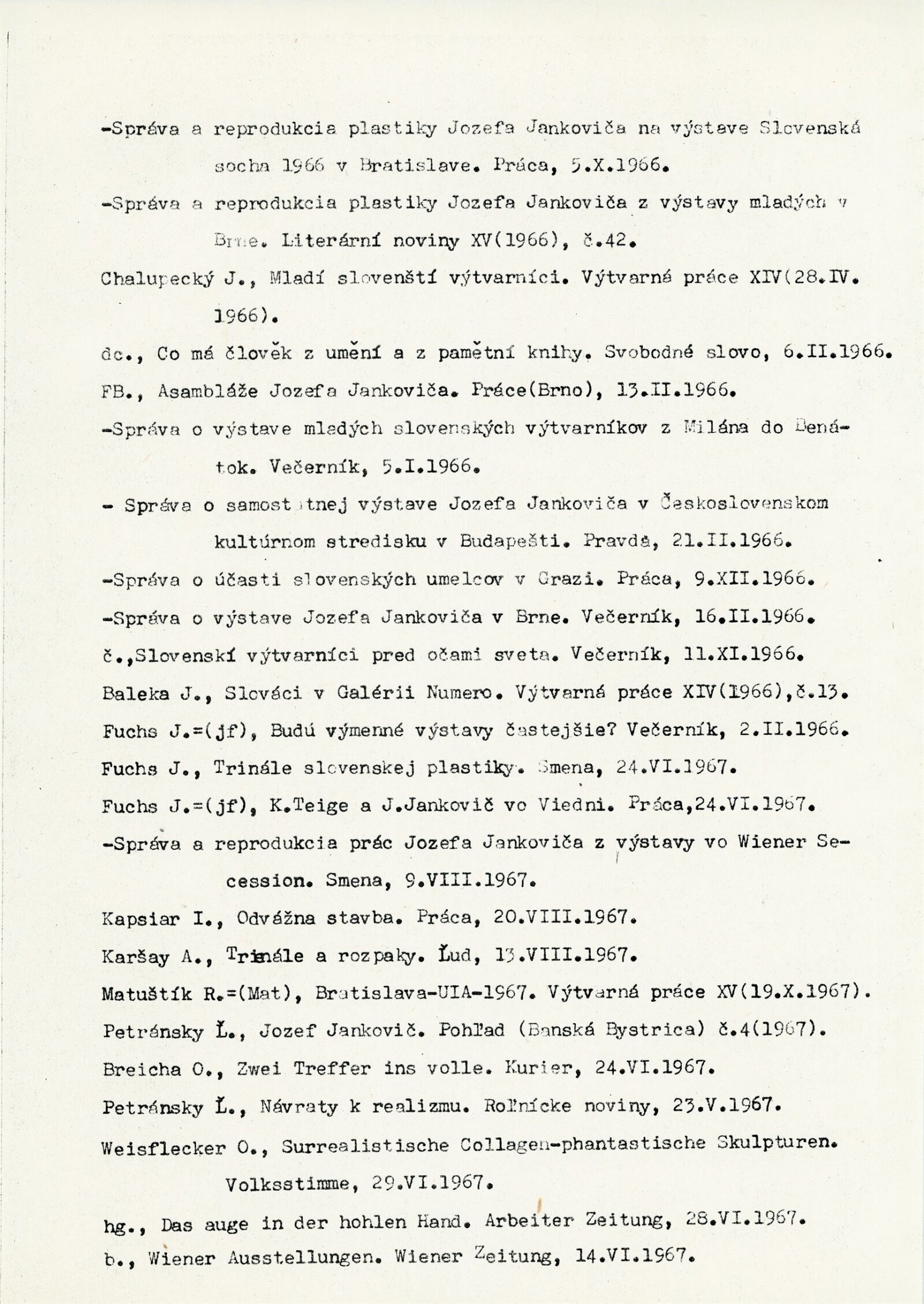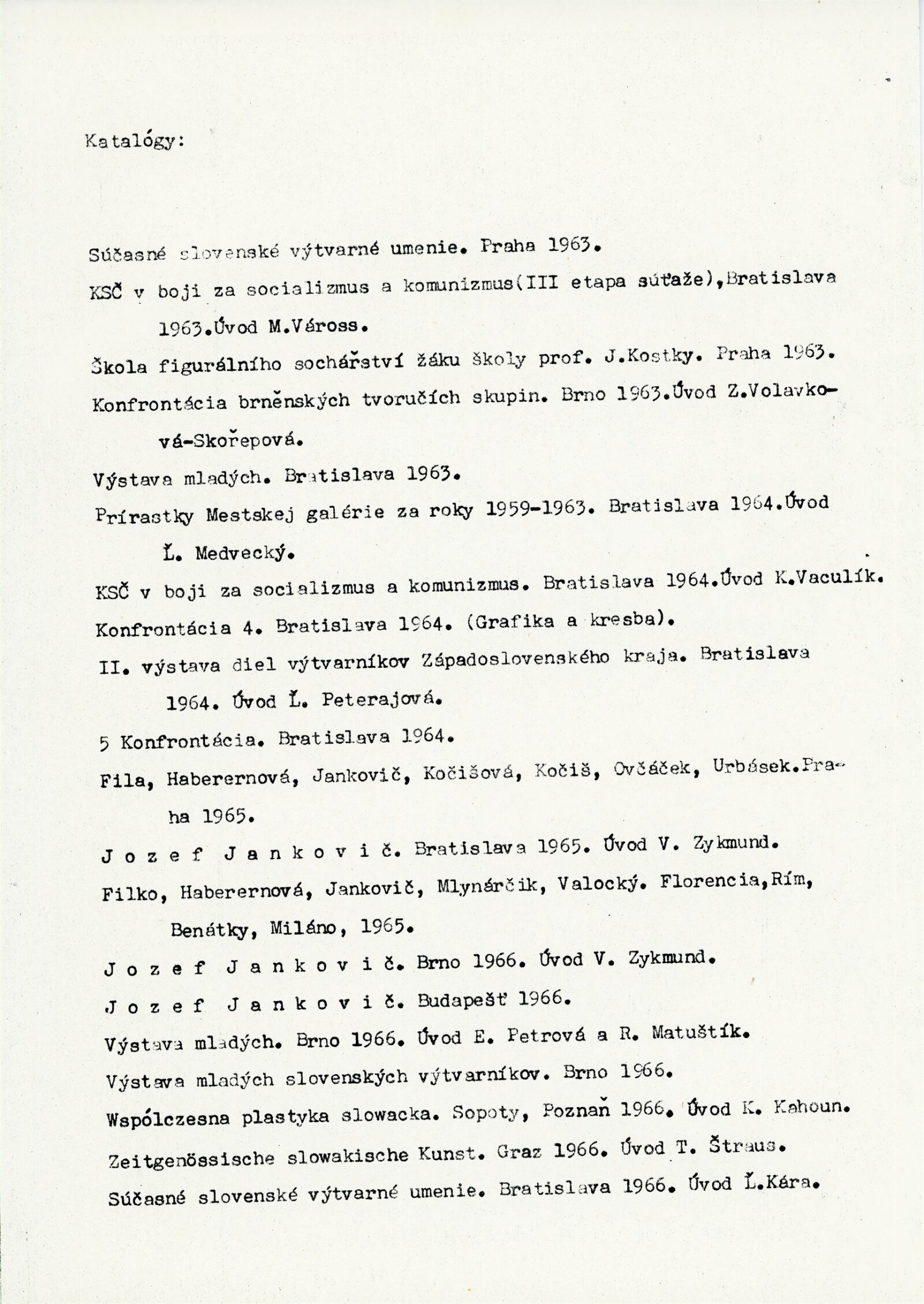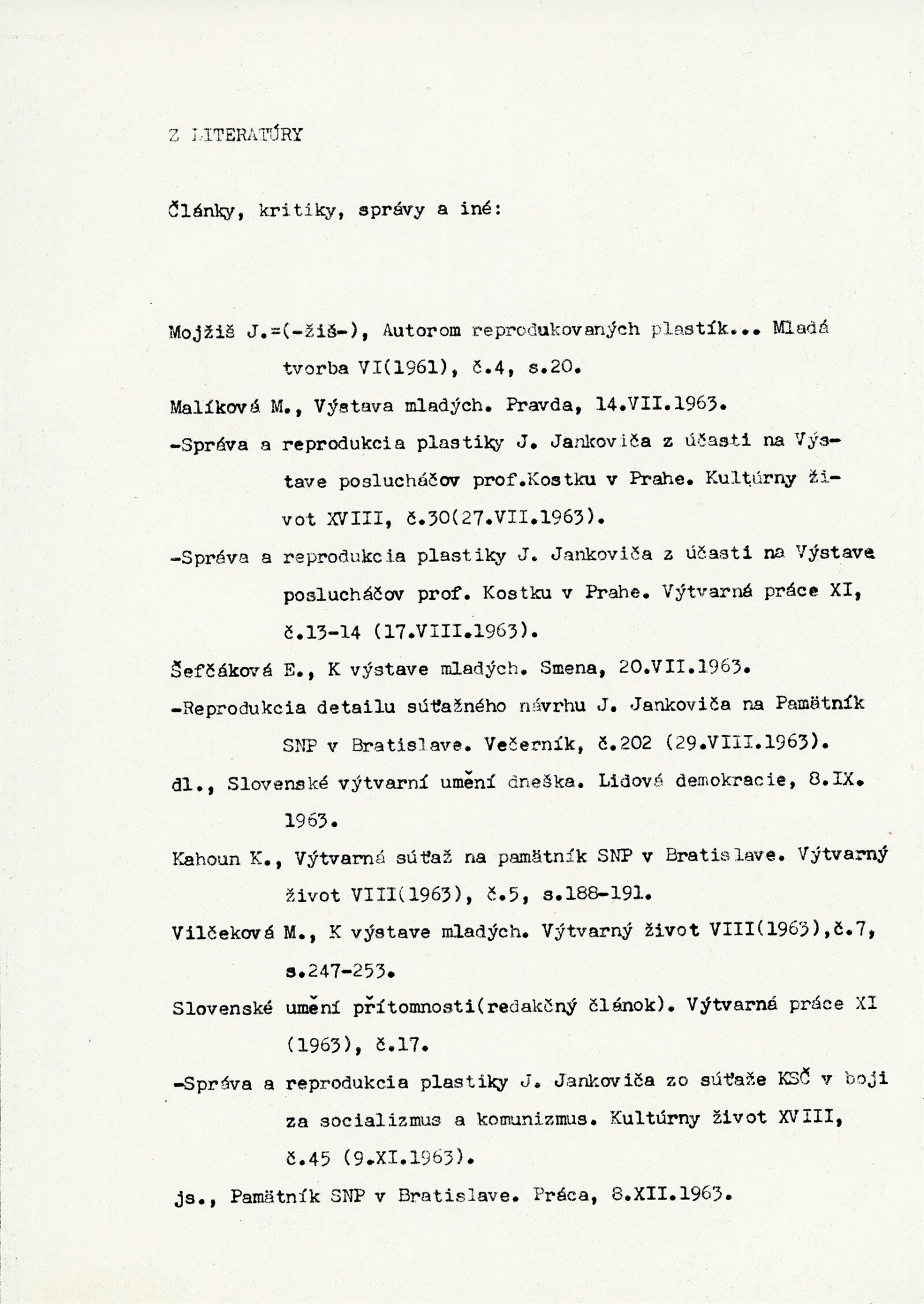 Jozef Jankovič. Kresby: Dům umění / Dům pánů z Kunštátu, 135. výstava Kabinetu grafiky, 8. 6. – 8. 7. 1973 / Texty: Jiří Valoch, Ľudo Petránsky. – B. m. n., 1973. – 26 l., 23 l. bar. obr. příl., životní data, výstavy, bibliografie, DPK 542. – MZK; MG