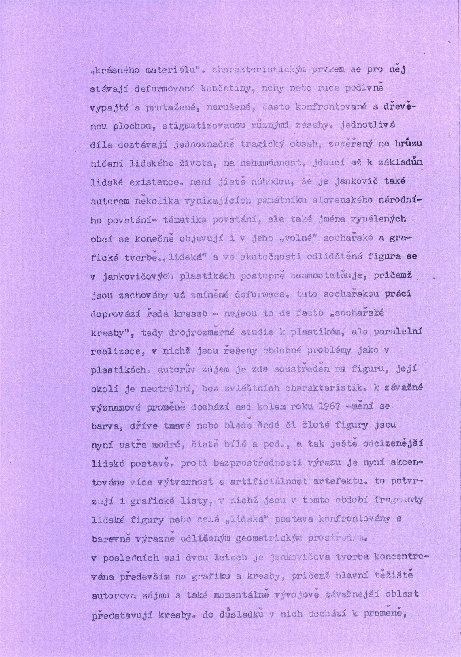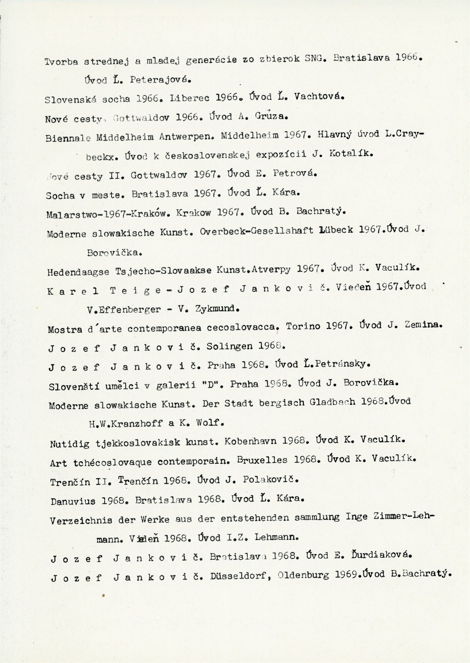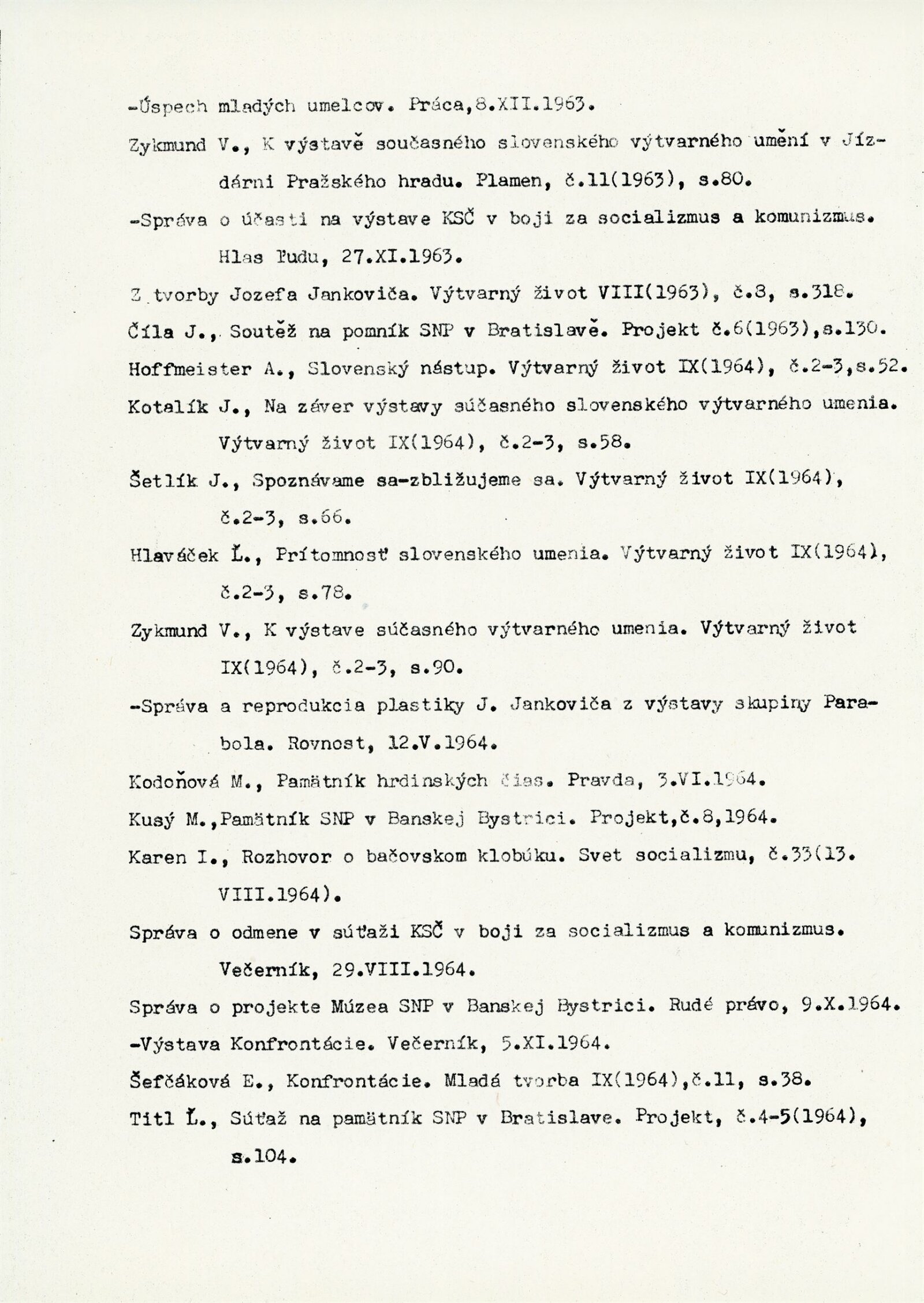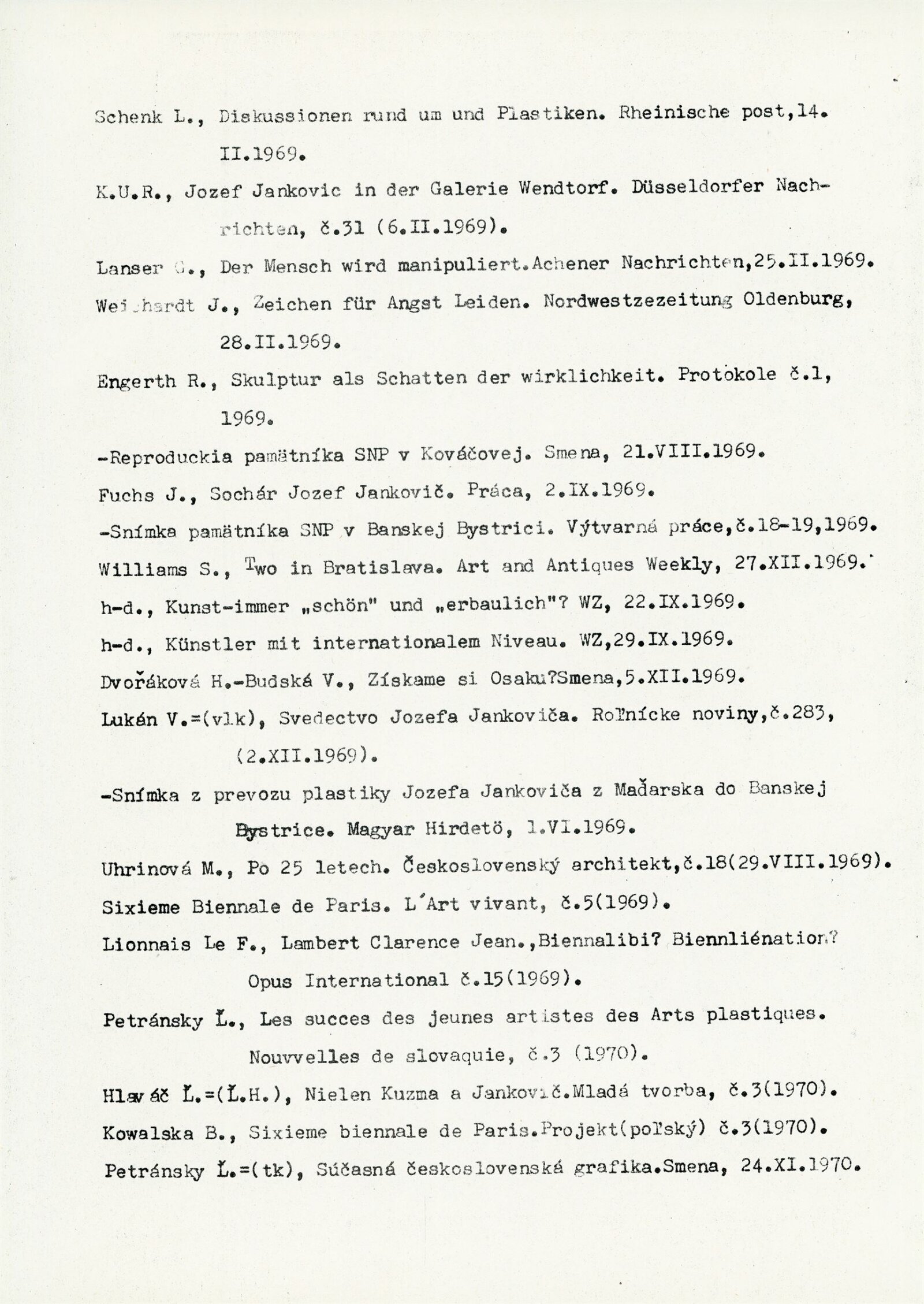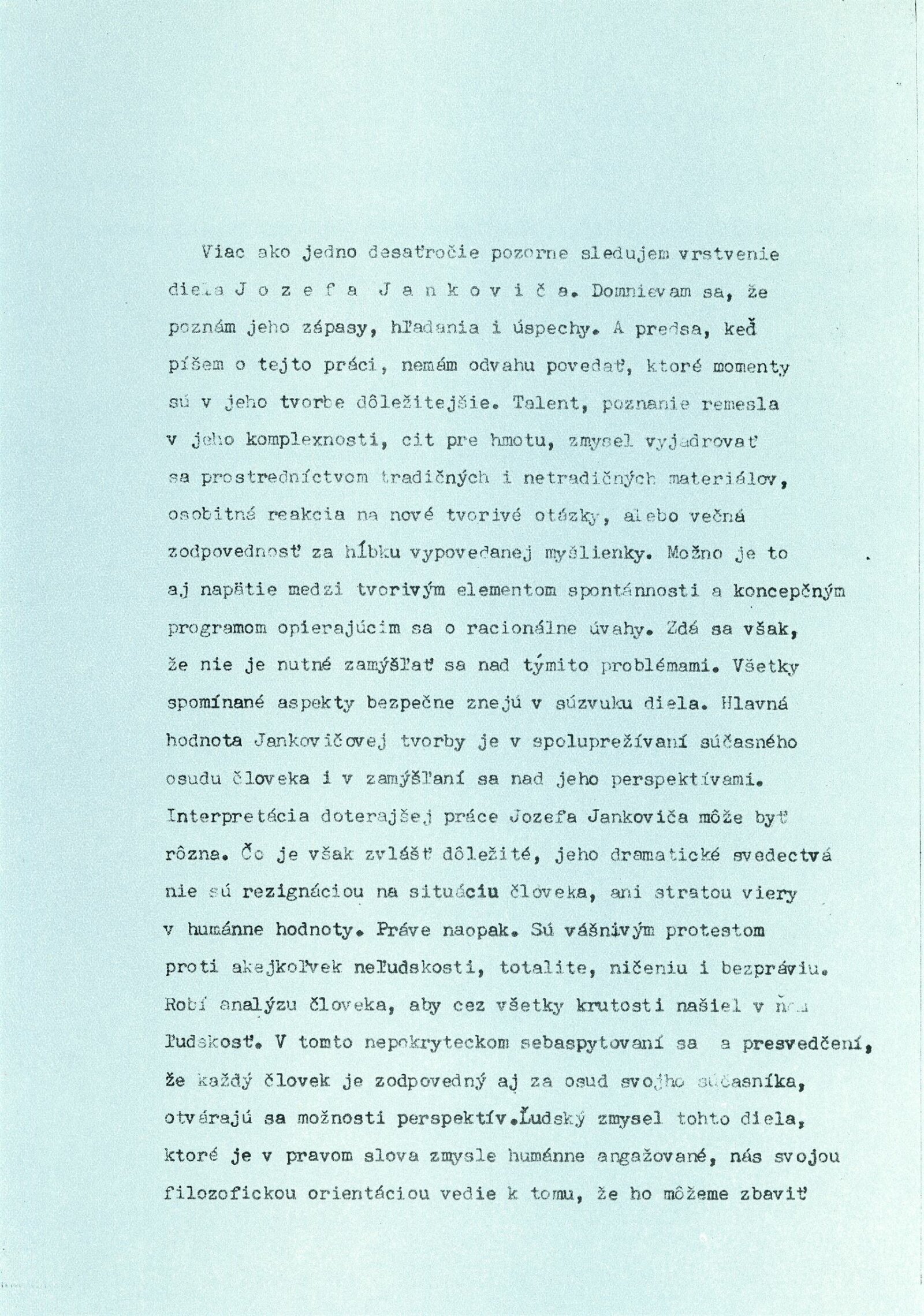 Jozef Jankovič. Kresby: Dům umění / Dům pánů z Kunštátu, 135. výstava Kabinetu grafiky, 8. 6. – 8. 7. 1973 / Texty: Jiří Valoch, Ľudo Petránsky. – B. m. n., 1973. – 26 l., 23 l. bar. obr. příl., životní data, výstavy, bibliografie, DPK 542. – MZK; MG