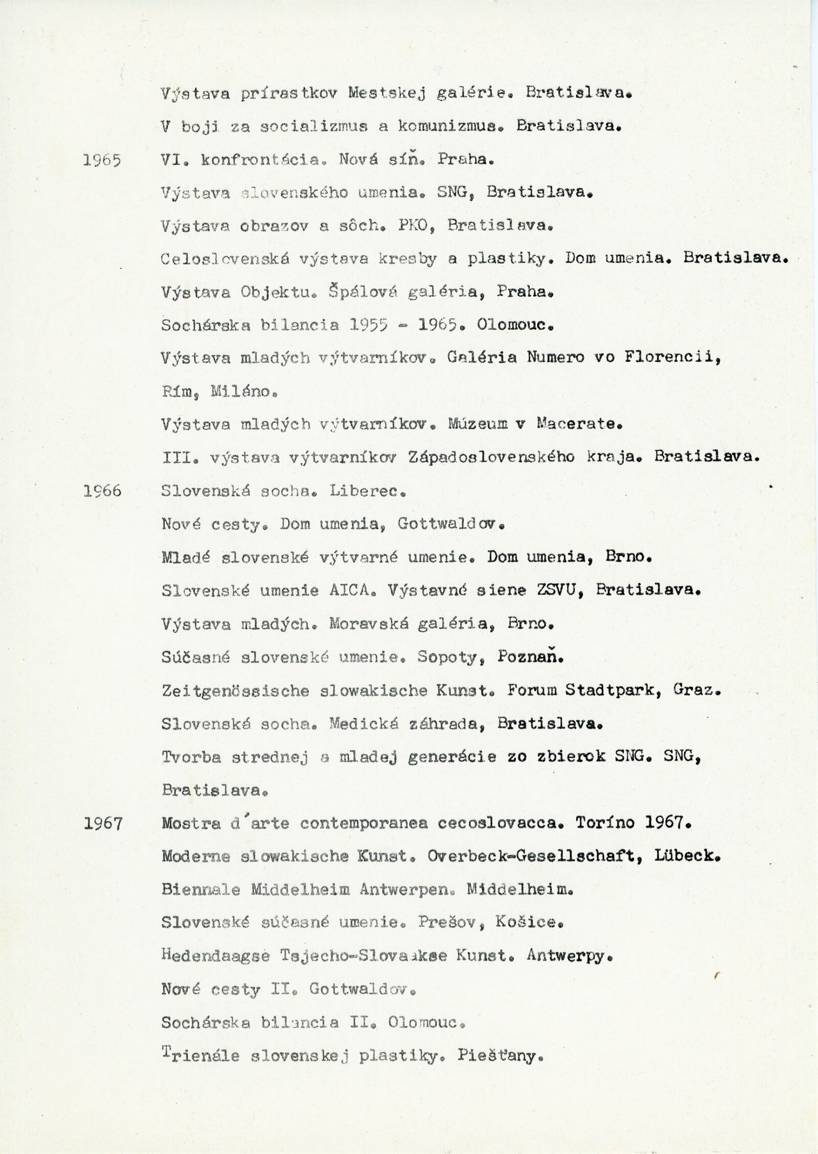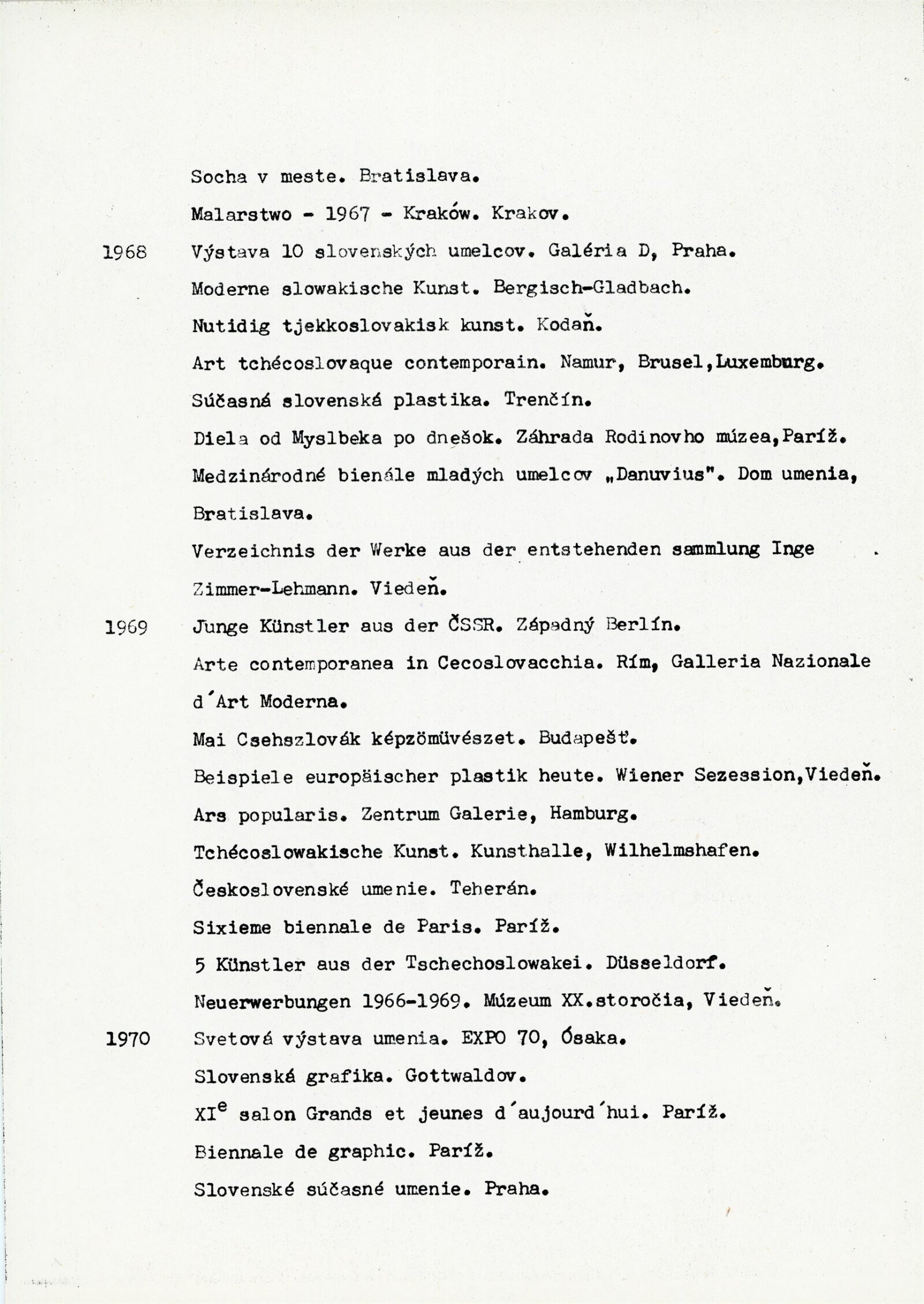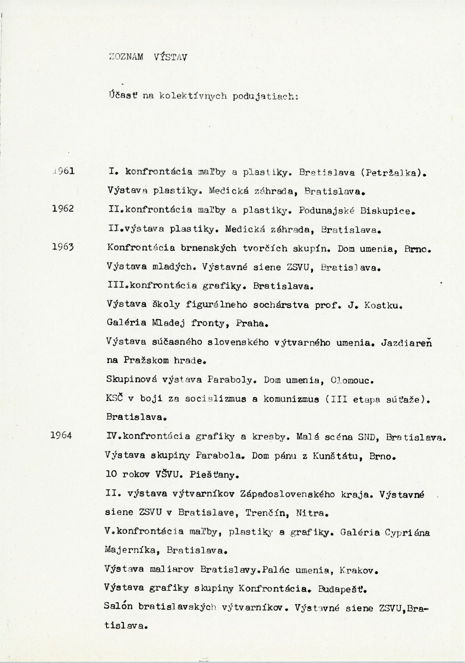 pozvánka, podklady ke katalogu, fotografie vernisáže a výstavy, seznam vystavených děl, fotografie díla, výstavní smlouva, provozní korespondence, žádost o povolení výstavy, recenze v tisku