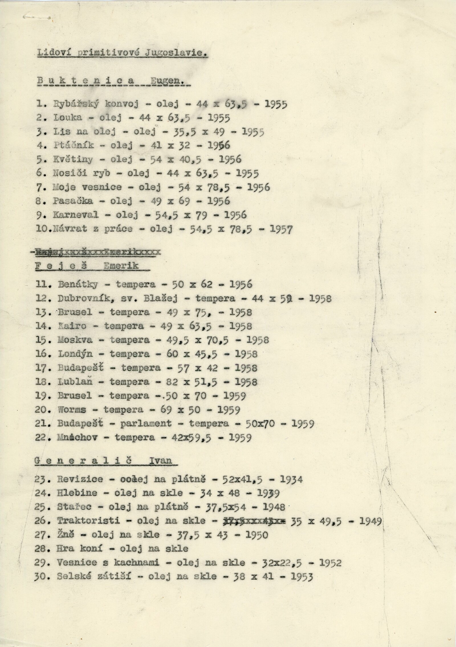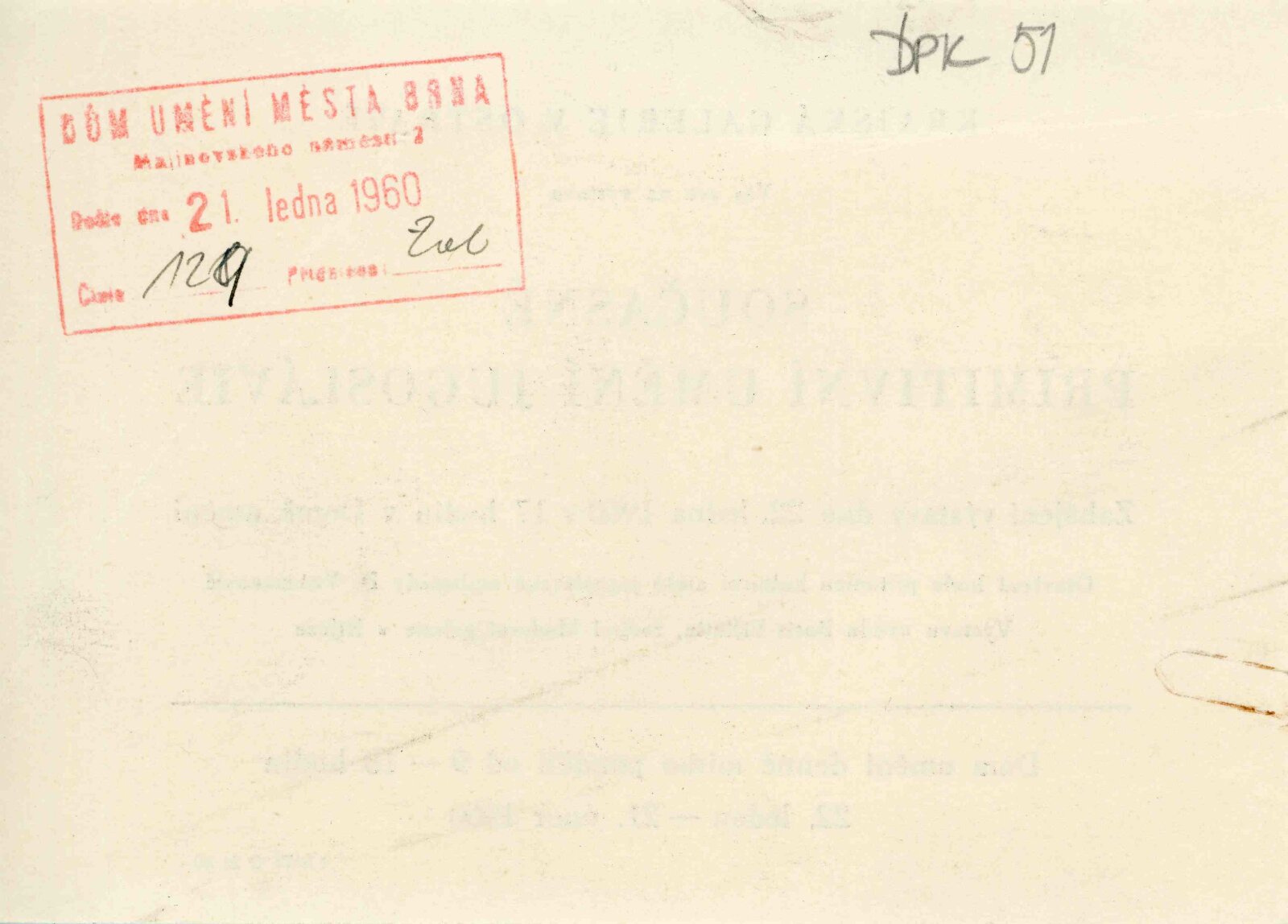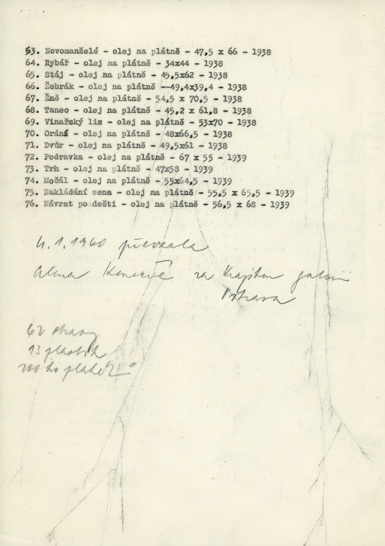 pozvánka, seznam vystavených děl, strojopis textu katalogu, úvodní slovo na vernisáži, poznámka Adolf Kroupy k výstavě, provozní korespondence, negativ recenzí v tisku