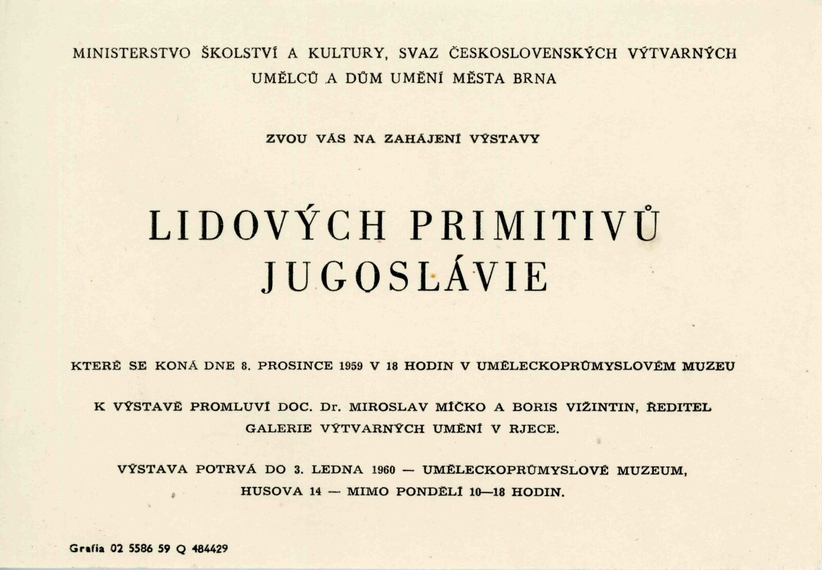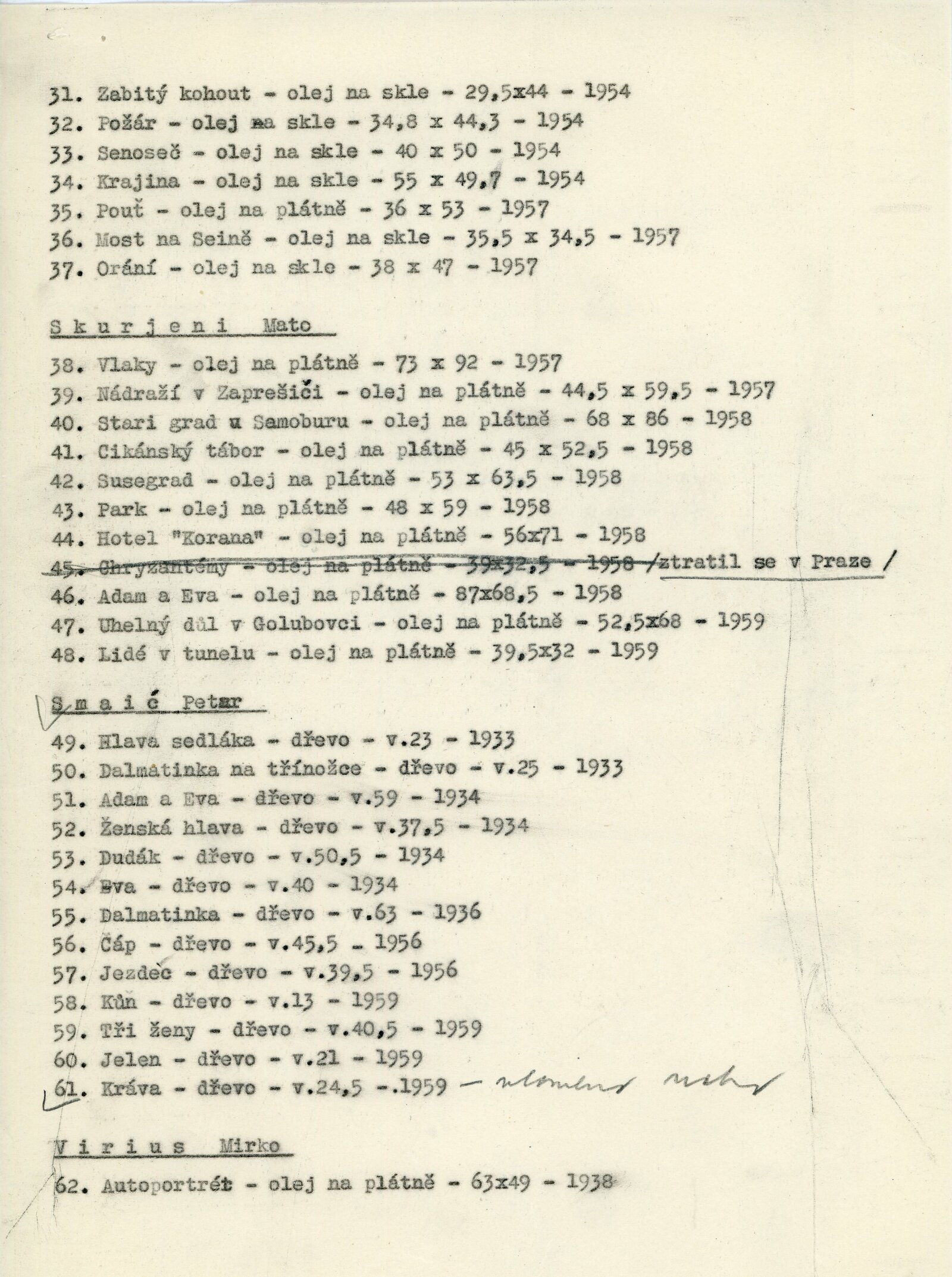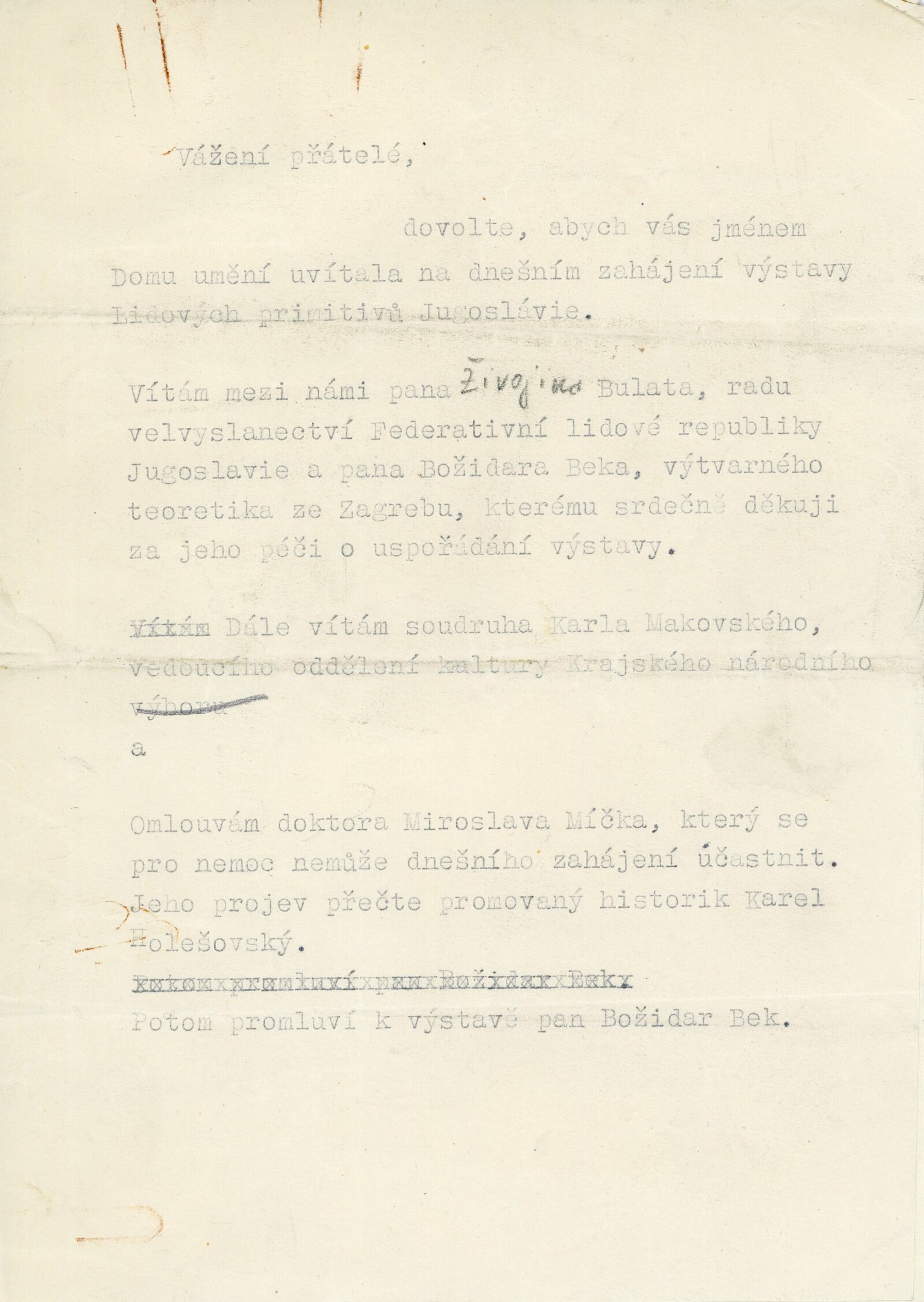pozvánka, seznam vystavených děl, strojopis textu katalogu, úvodní slovo na vernisáži, poznámka Adolf Kroupy k výstavě, provozní korespondence, negativ recenzí v tisku