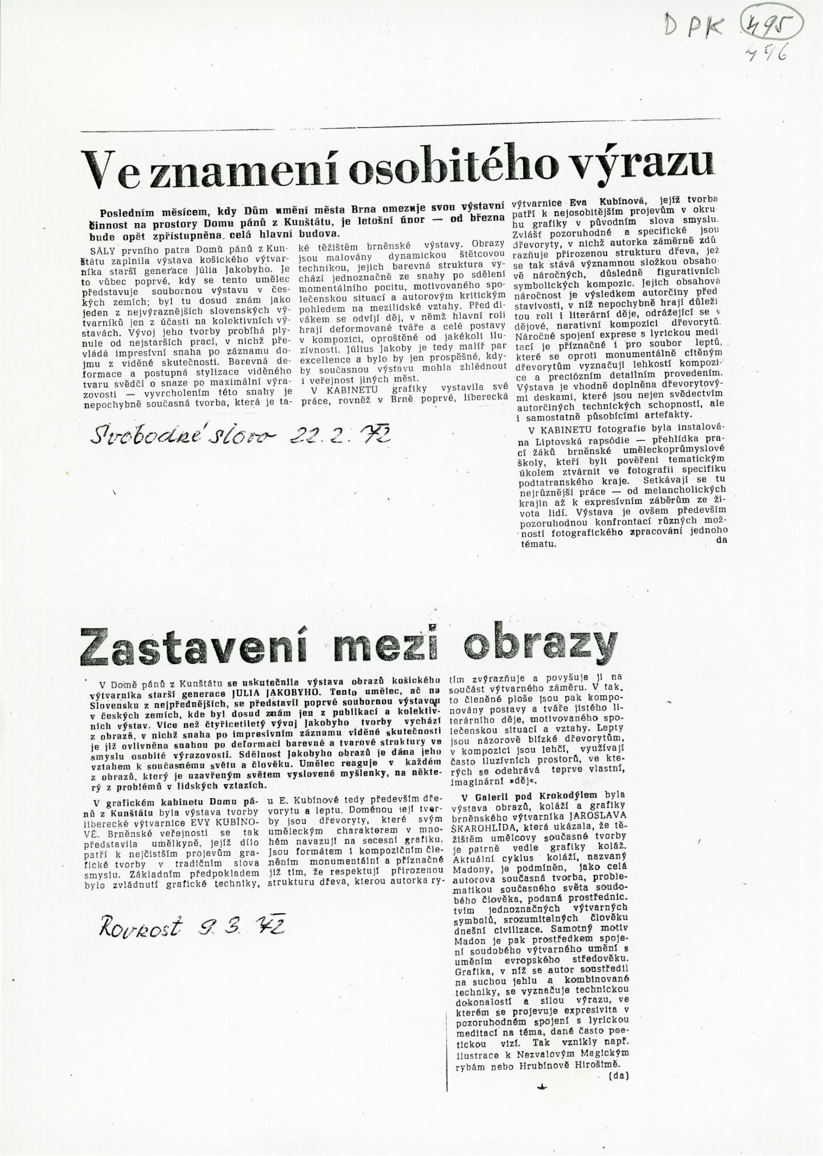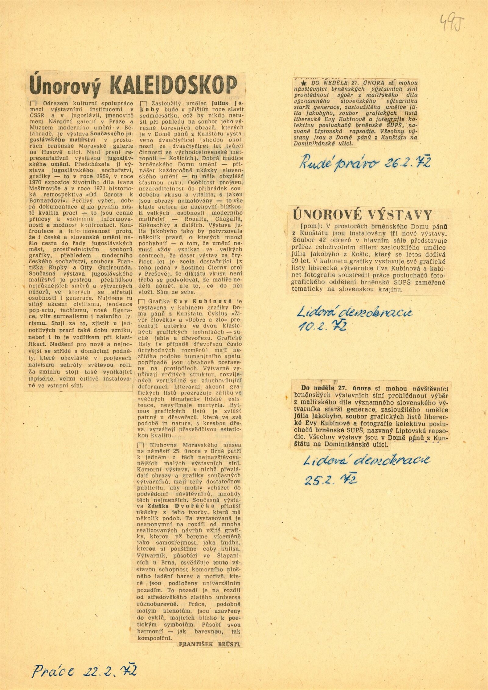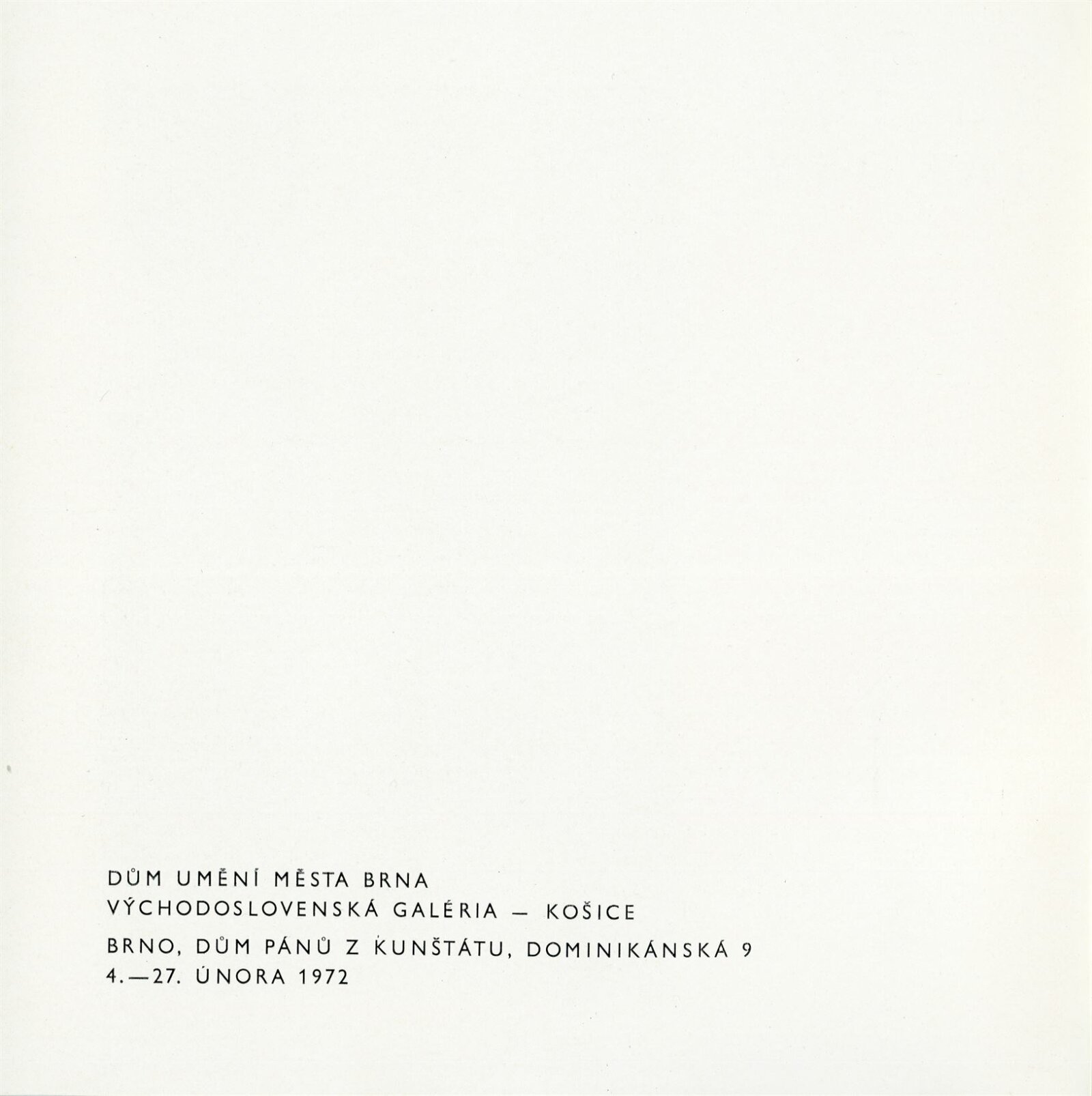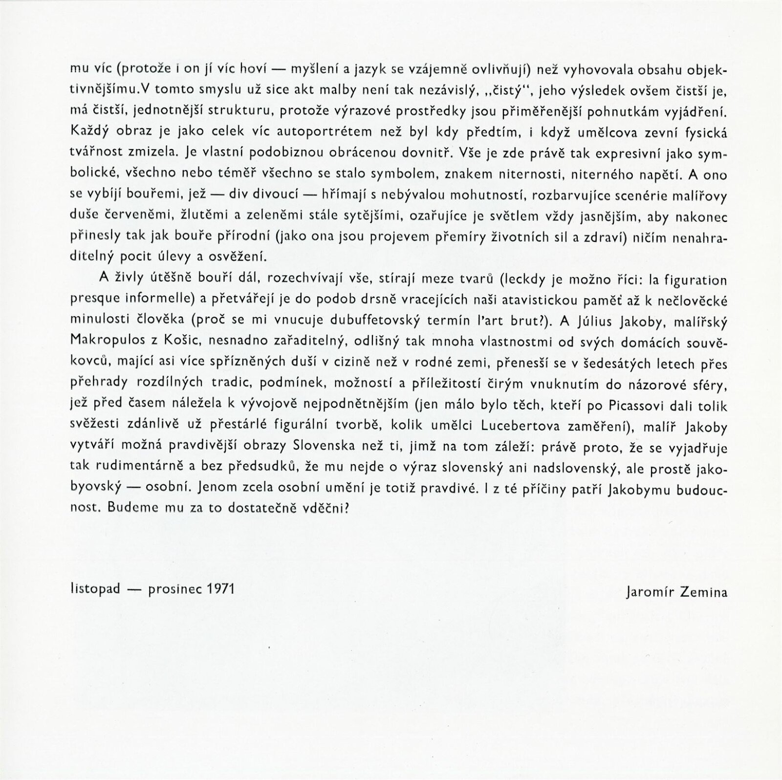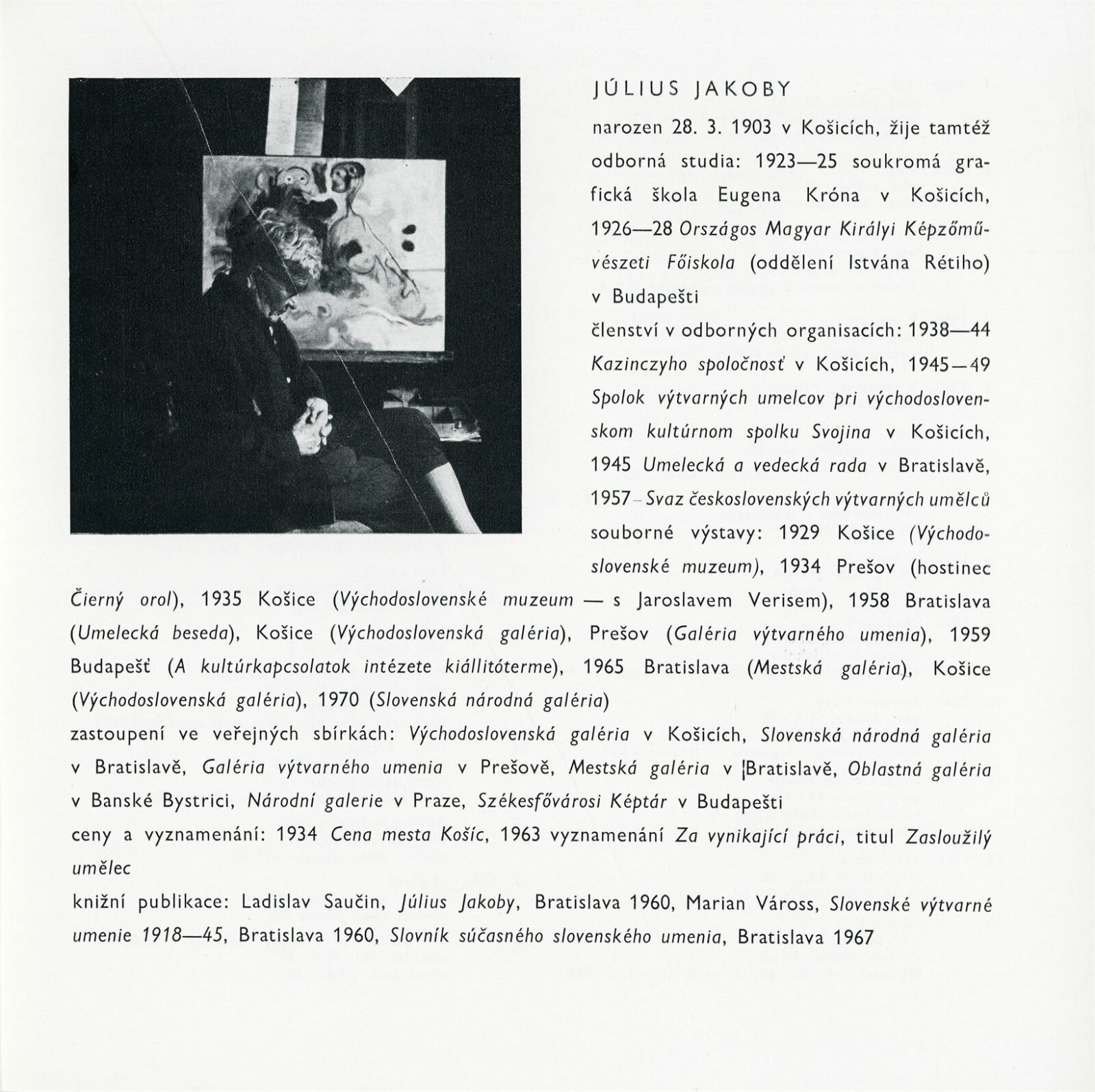 Július Jakoby: Dům umění města Brna / Dům pánů z Kunštátu, 4. 2. – 27. 2. 1972 / Text: Jaromír Zemina. – Brno: DUmB, 1972. – 18 s., obr., životopis, DPK 495. – MZK; MG; MMB