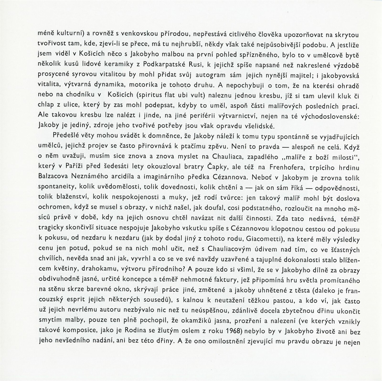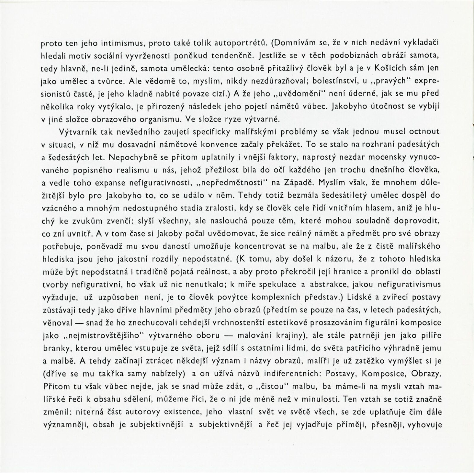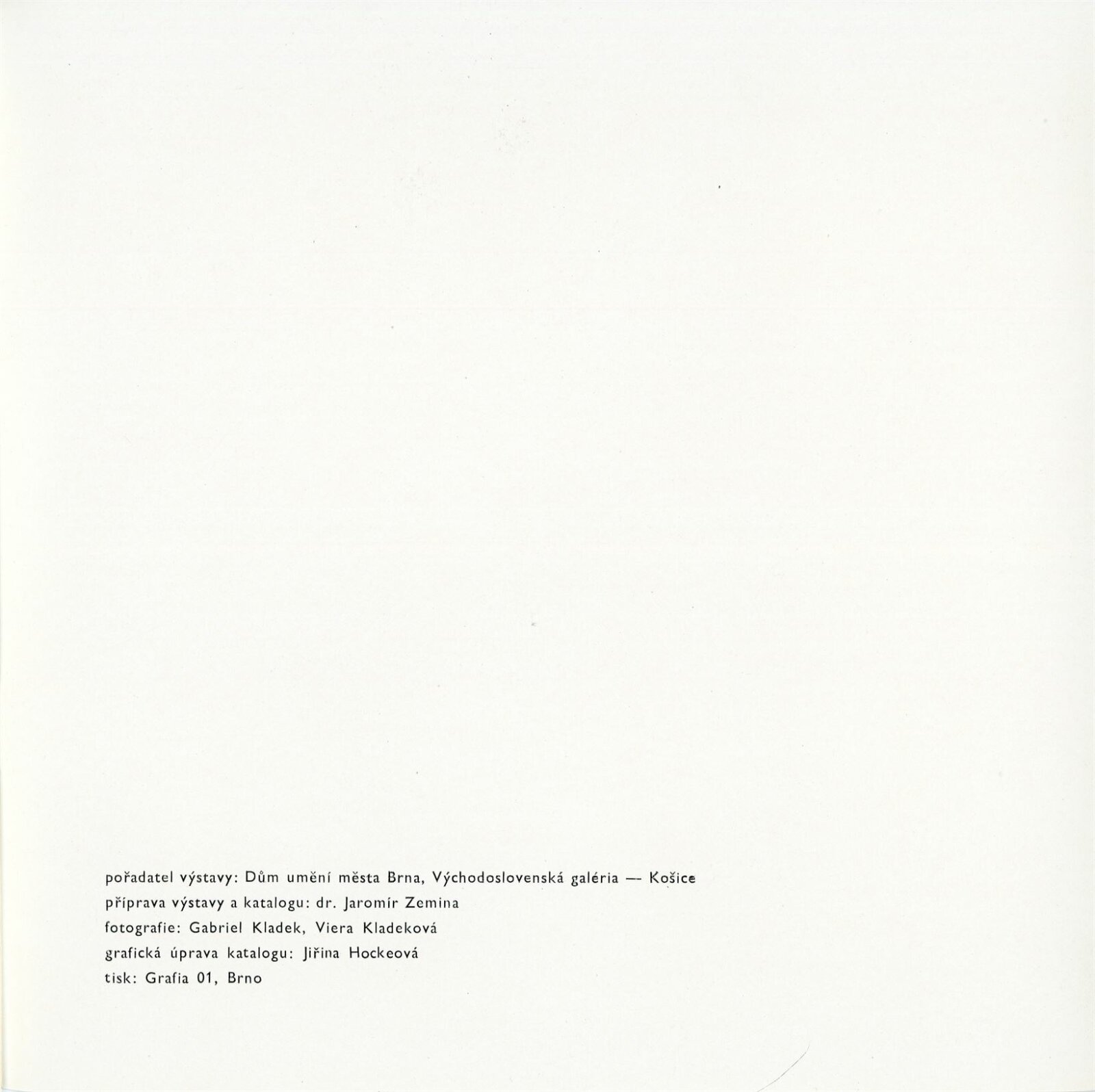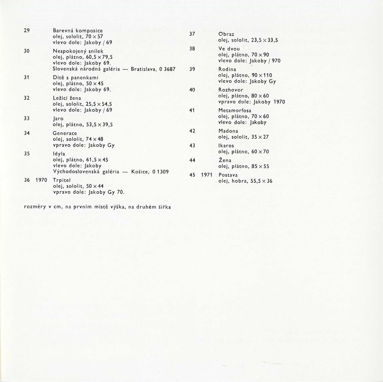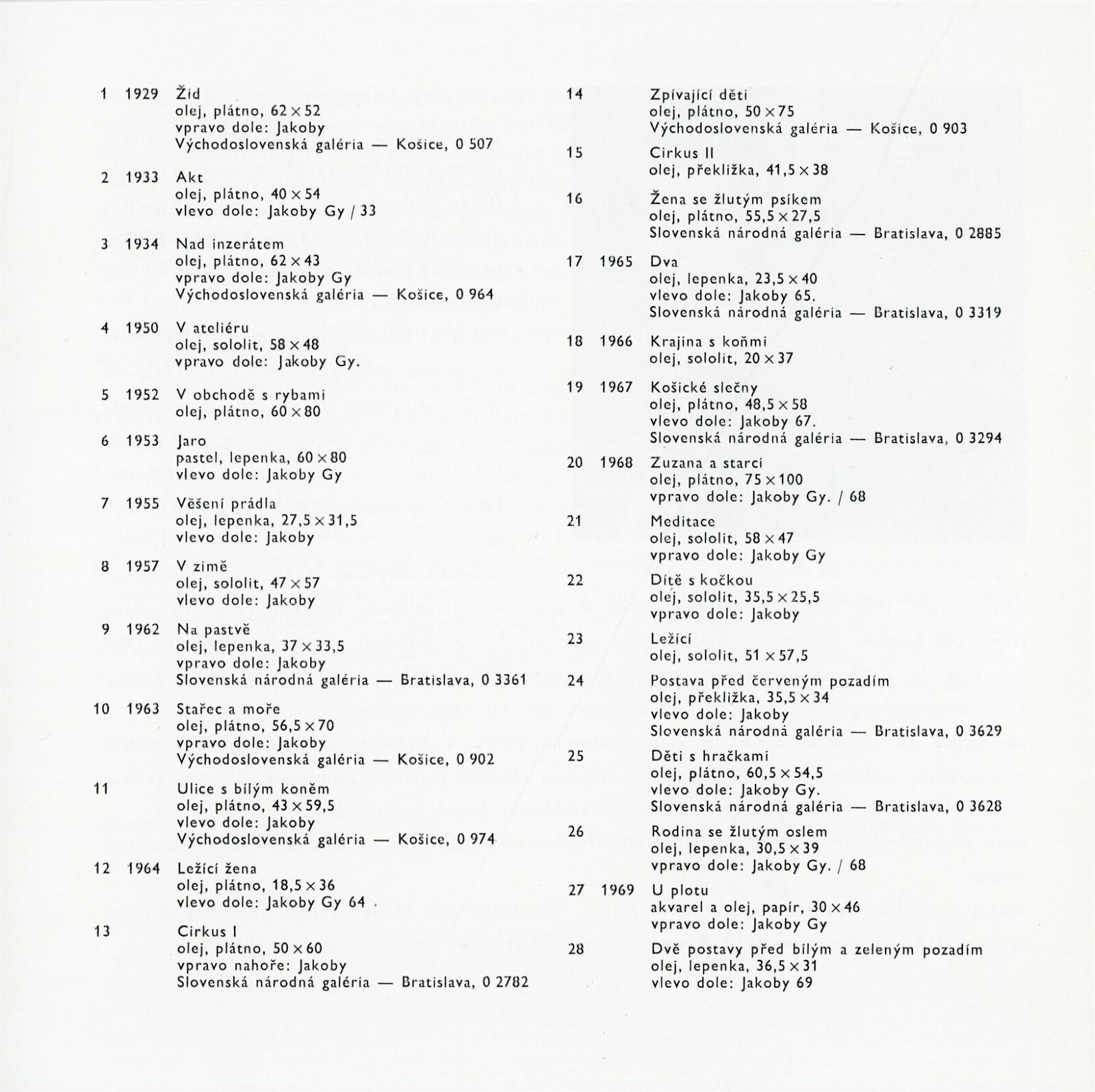 katalog, návrh katalogu, karta k výstavě, strojopis návrhu katalogu, popisky do výstavy, seznam obrazů, seznam pro pojišťovnu, fotografie děl, instalace v DPK a vernisáže, potvrzení převzetí obrazů, korespondence (DU, Zemina, Jakoby), provozní korespondence (SNG, VG Košice), žádost o povolení výstavy, recenze v tisku, katalog VG Košice