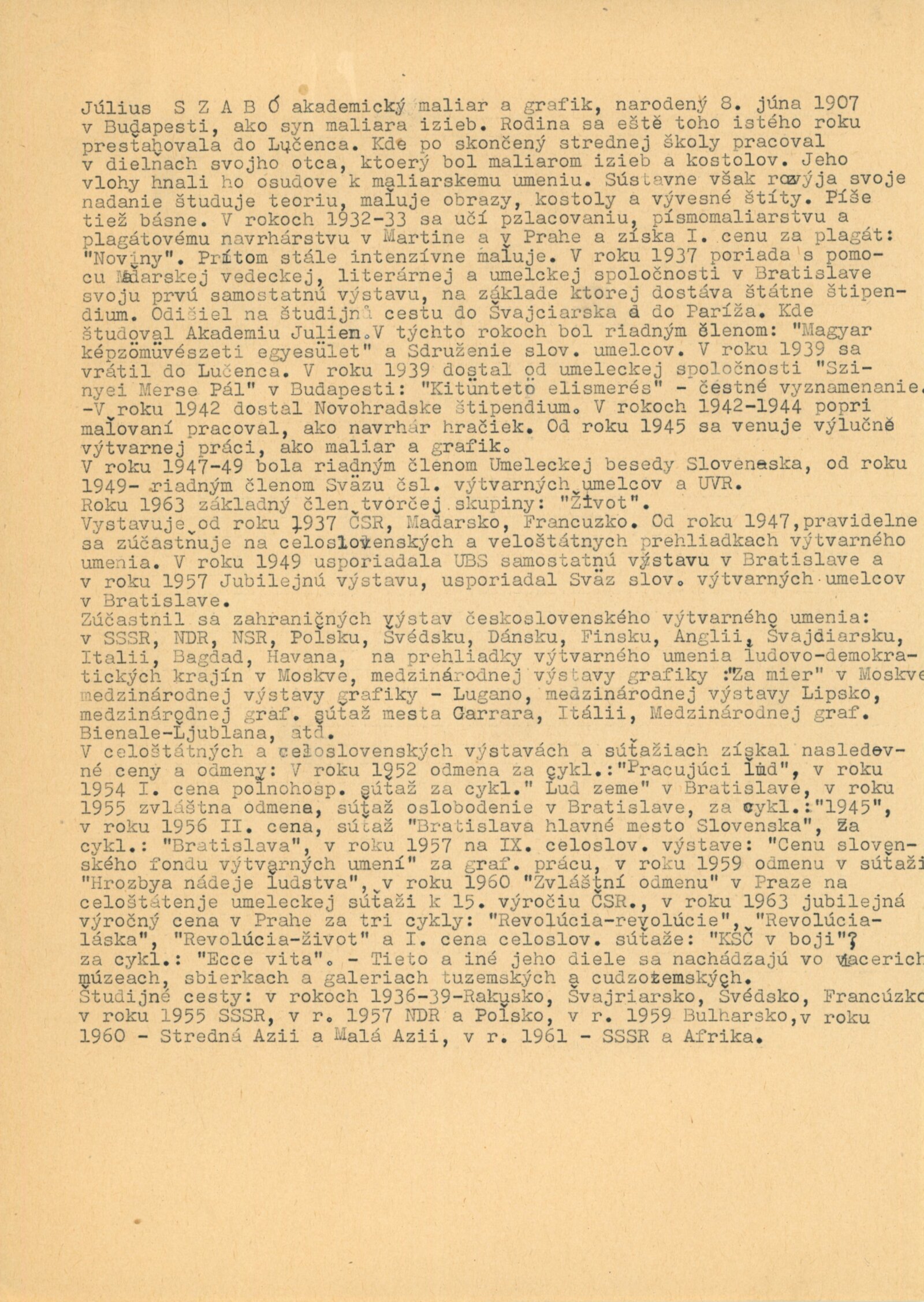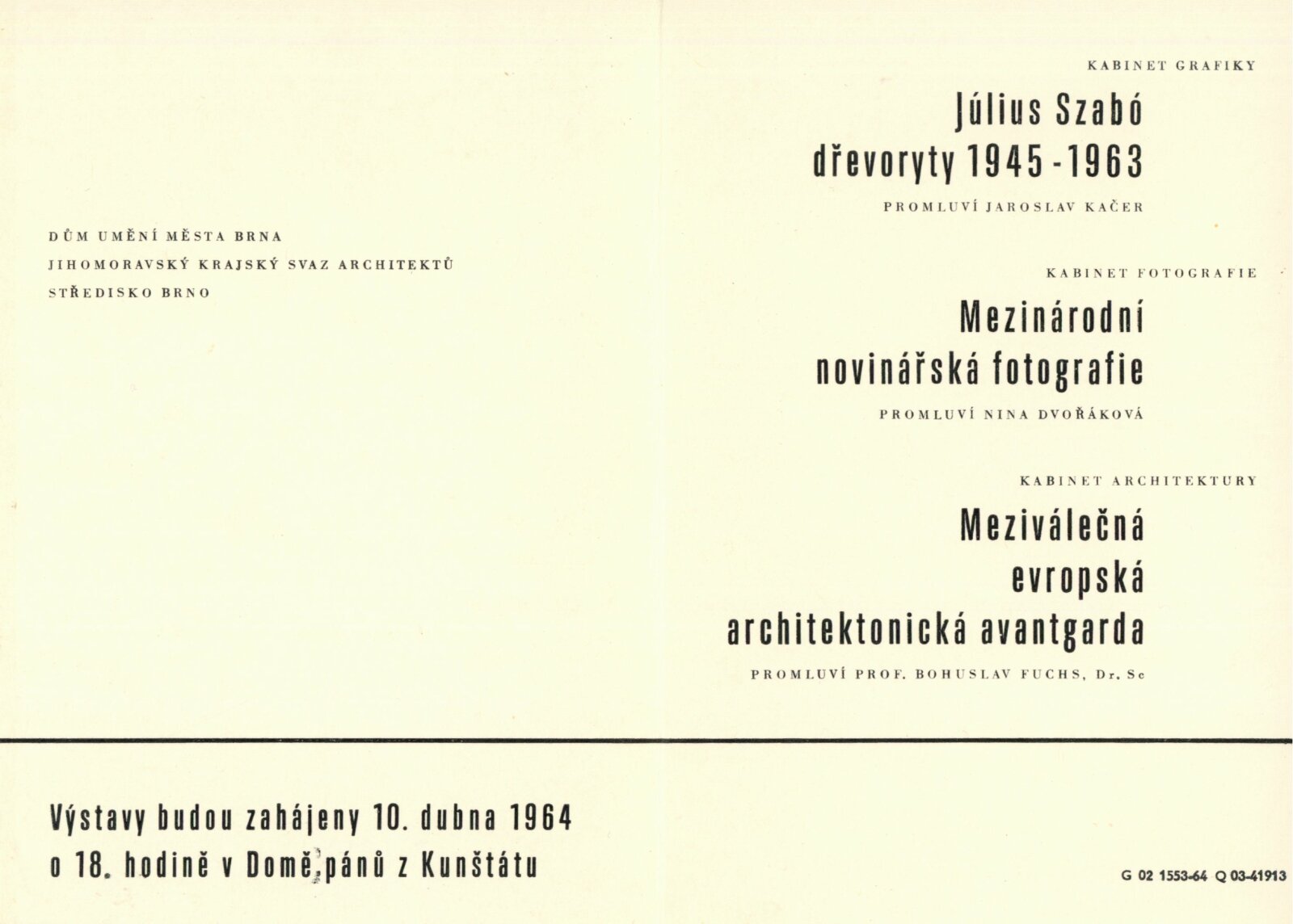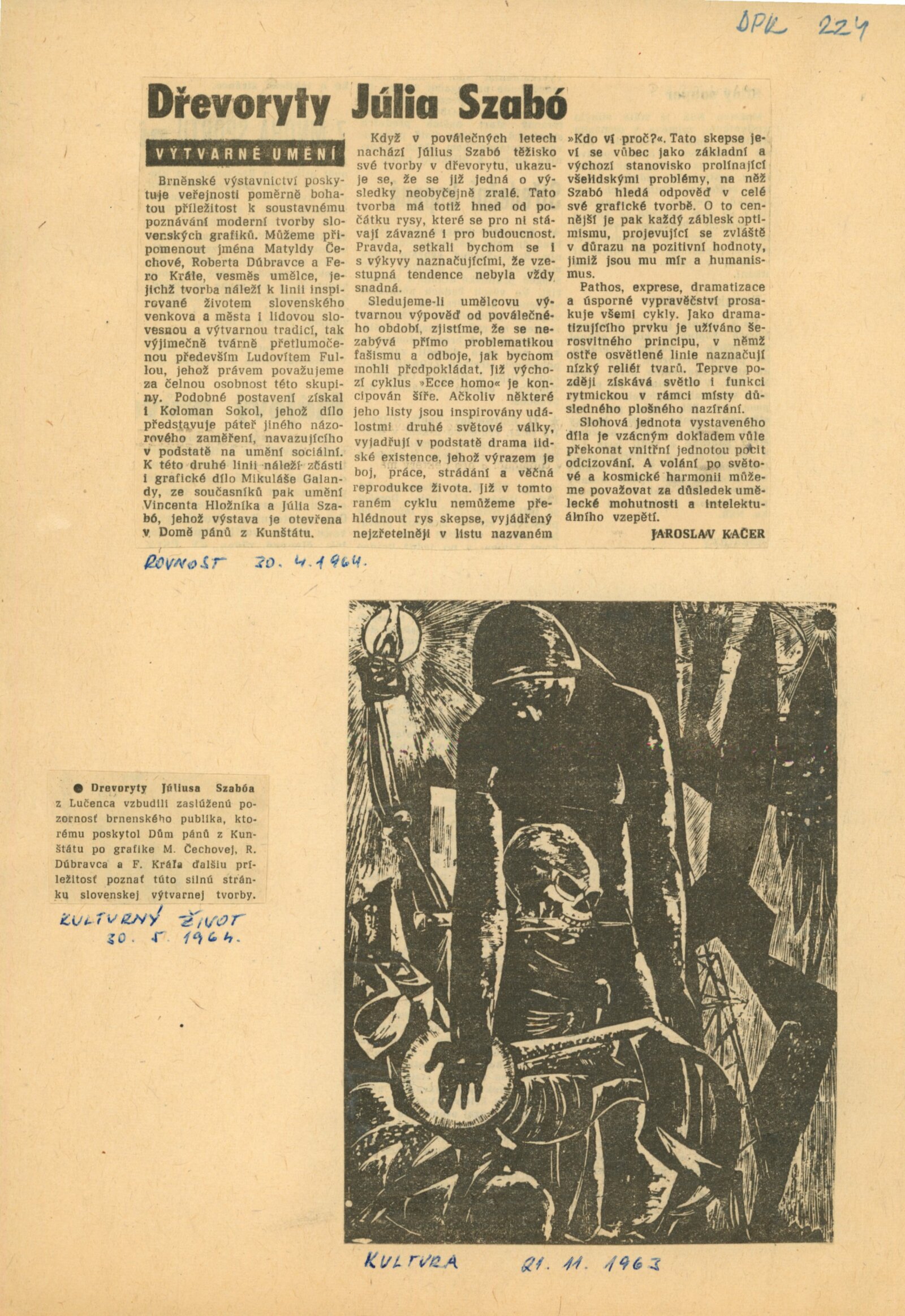 Július (spr. Gyula) Szabó. Dřevoryty 1945–1963: Dům umění města Brna / Dům pánů z Kunštátu, Kabinet grafiky, 10. 4. – 2. 5. 1964 / Text: anonymní. – Brno: DUmB, 1964. – skládačka, 6 s., obr., DPK 224