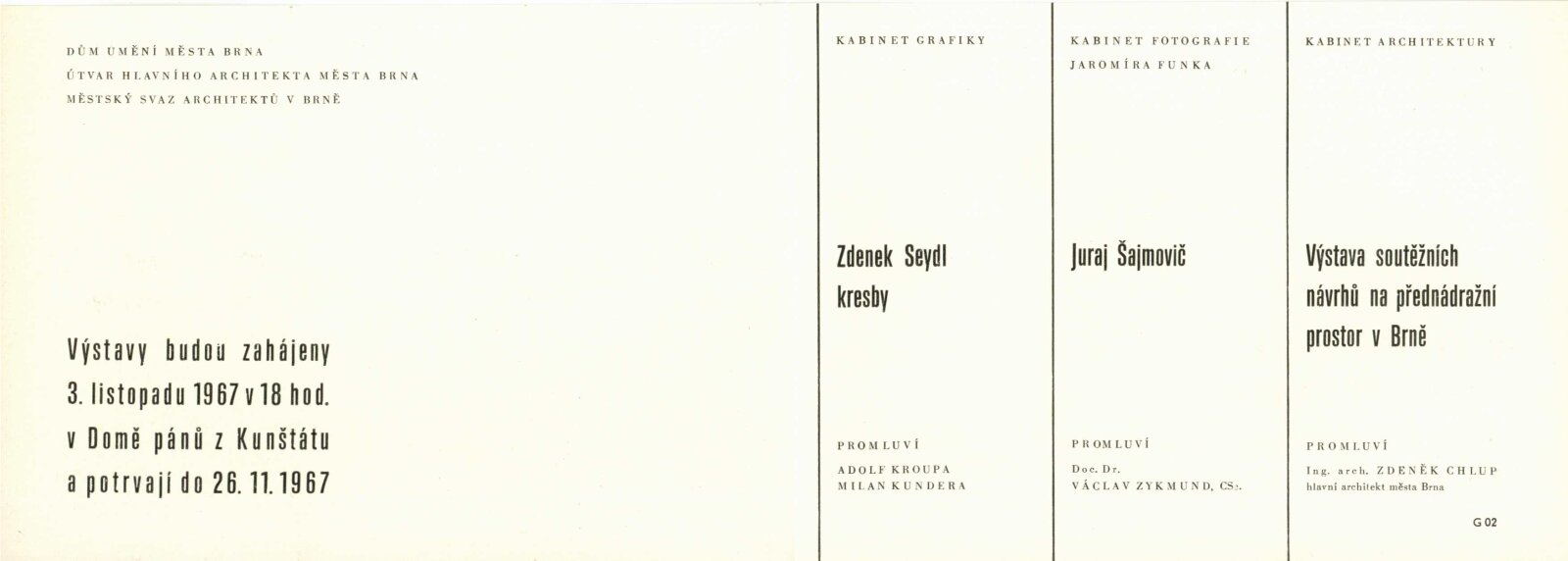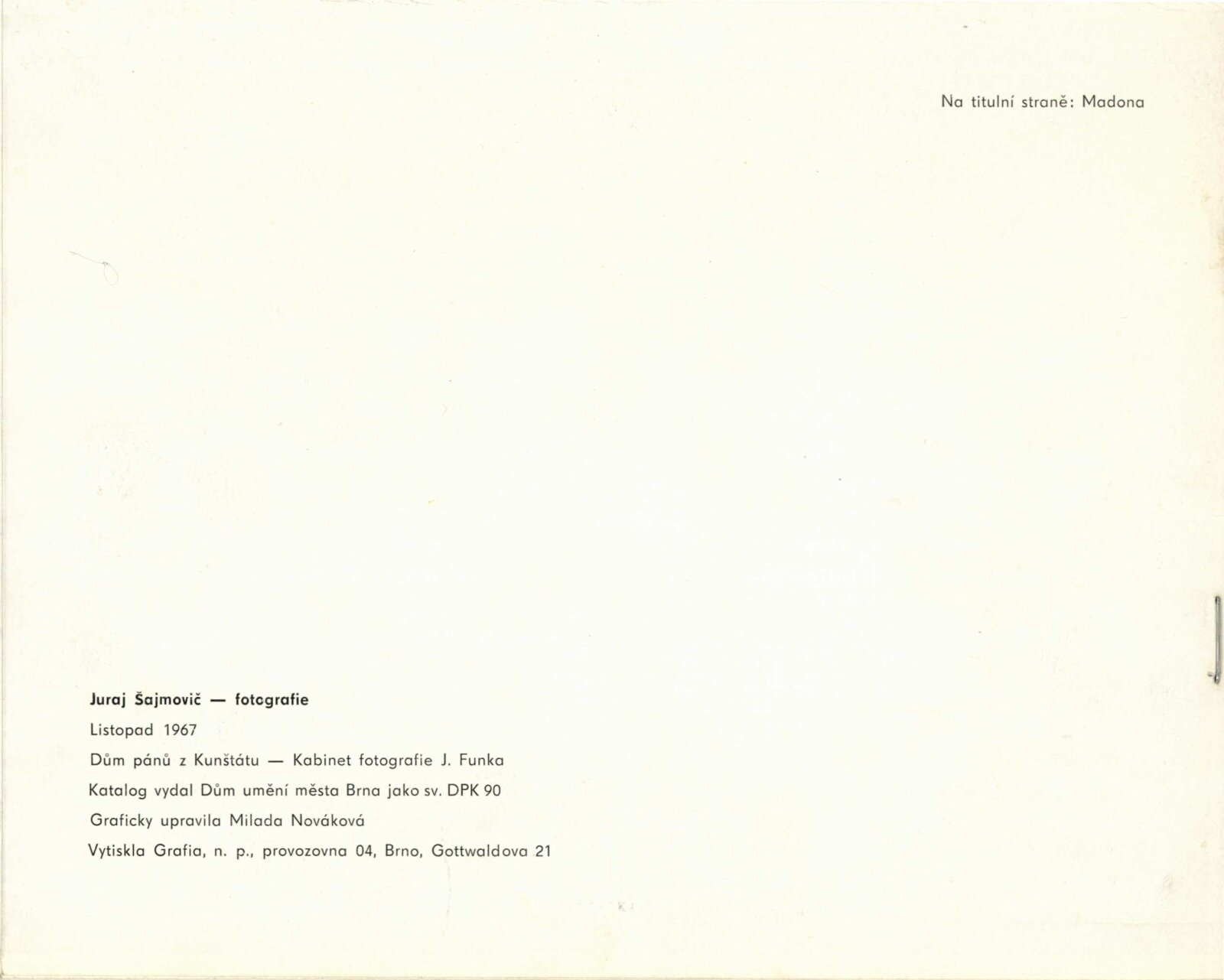 Juraj Šajmovič. Fotografie: Dům umění města Brna/ Dům pánů z Kunštátu, 86. výstava Kabinetu fotografie Jaromíra Funka, 3. 11. – 26. 11. 1967/ Text: Jaroslav Boček. – Brno: DUmB, 1967. – 8 s., obr., seznam fotografií, 1 s. rozmn., DPK 359. – MZK; MG