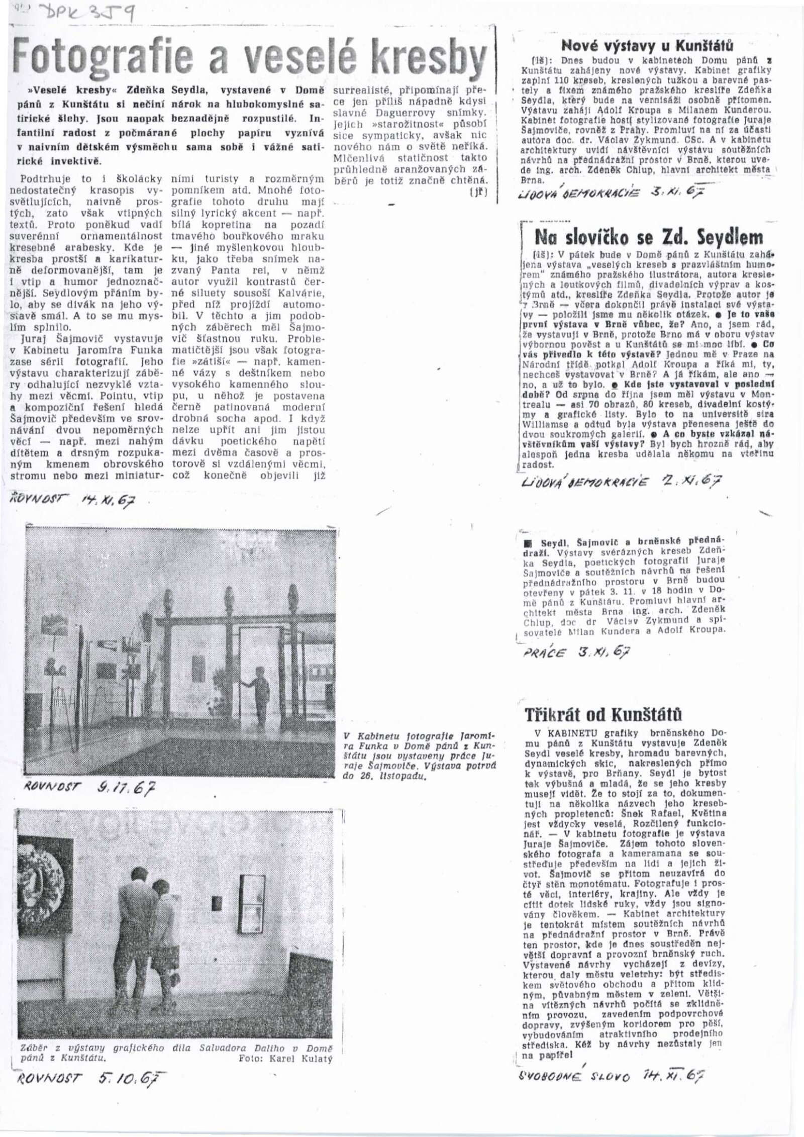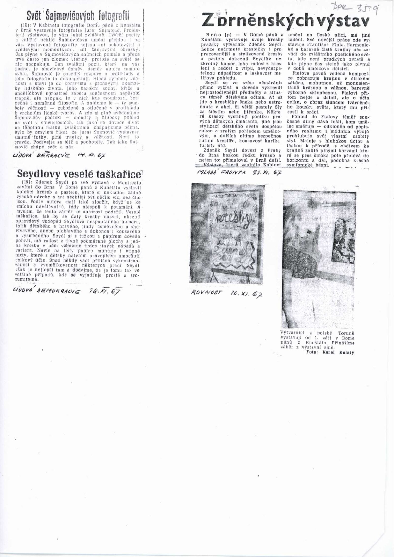 společná pozvánka DPK 358–360, katalog, strojopis katalogu, podmínky uspořádání výstavy, fotografie (z výstavy, autorské fotografie), korespondence (Niny Dvořákové s Jurajem Šajmovičem o realizaci výstavy, provozní korespondence), recenze v tisku